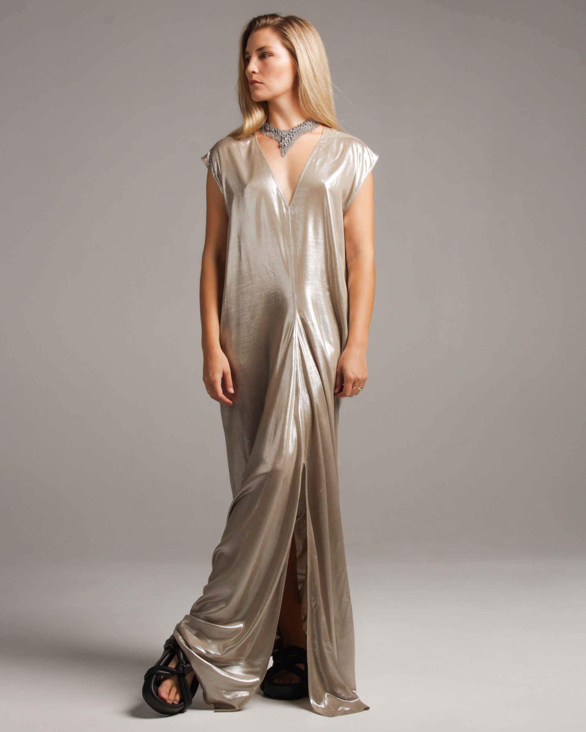 Lobster gown by Rick Owens in warm silver. Sleeveless tunic style in exquisite metallic viscose. Bias cut panels diverging from the central seam create a draped trail at the base, while semi-circular cutting at the rear produces voluminous gathering. Striking and statuesque.