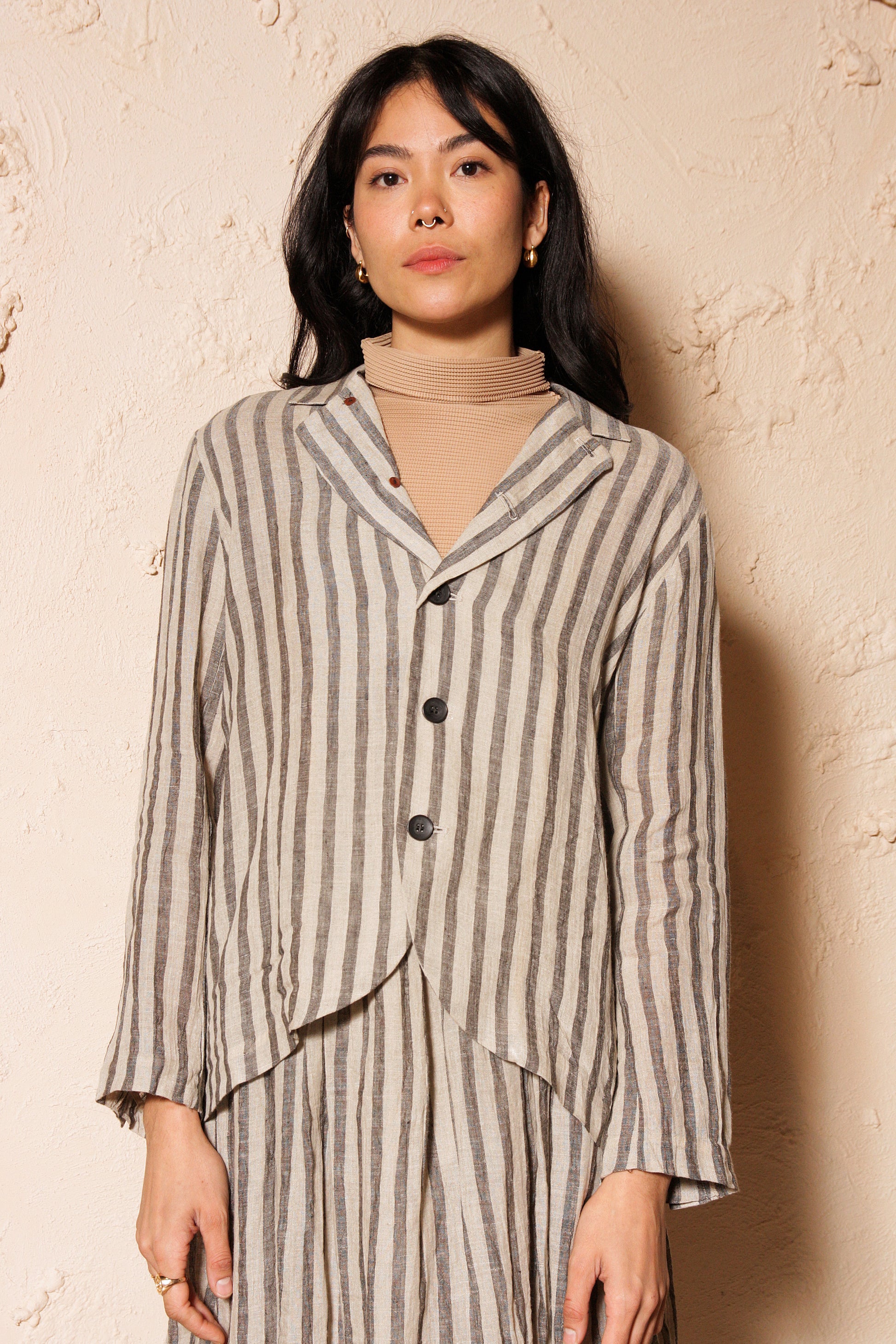 Light linen blazer by Ichi Antiquités in black and natural stripe. Crafted in Japan and featuring notched lapels with button closure, this lightweight jacket is an endlessly wearable wardrobe staple to add a sweet touch of texture and whimsy to any look.