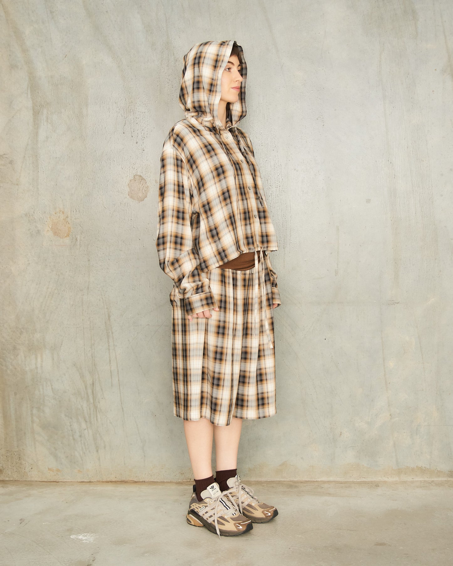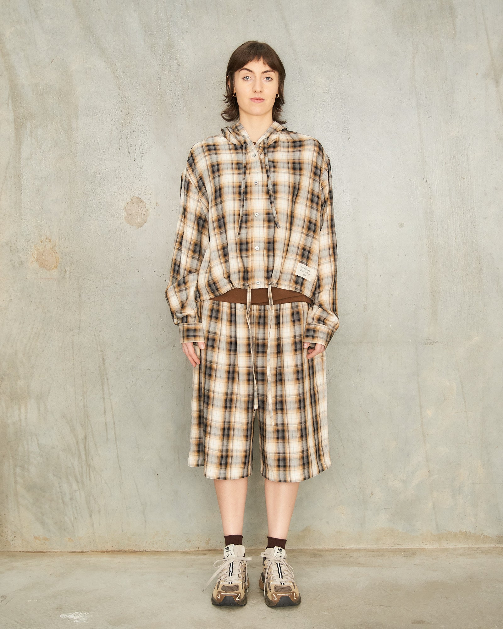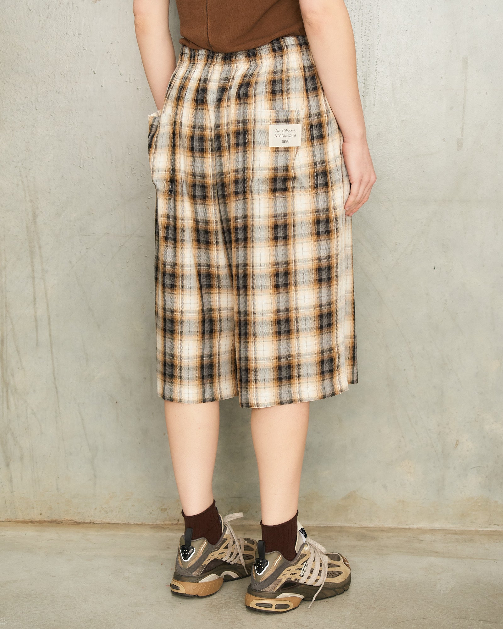 Relaxed shorts by Acne Studios in beige check. Breezy viscose shorts with a nostalgic flannel check, cut to a loose below-knee fit. Finished with an elasticated drawstring waist and logo stamp detail at the back pocket.
