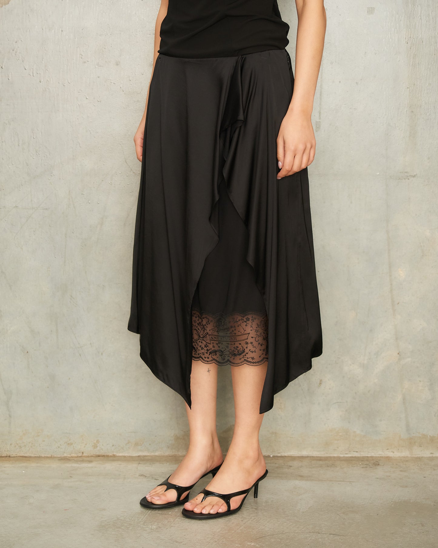 Satin lace draped skirt by Acne Studios in black. Fluid satin skirt, artfully layered with delicate ruffles that reveal a subtle lace layer beneath. Lightweight fabric drapes with effortless grace and fastens elegantly with a discreet hook and eye closure.