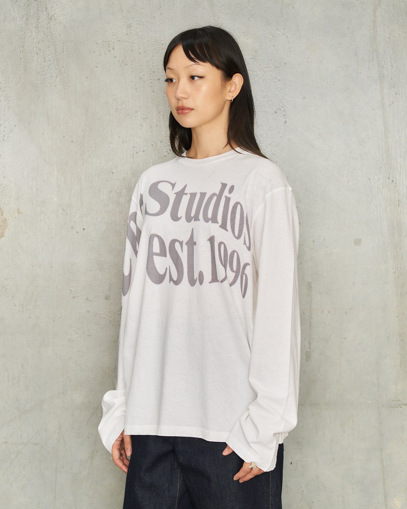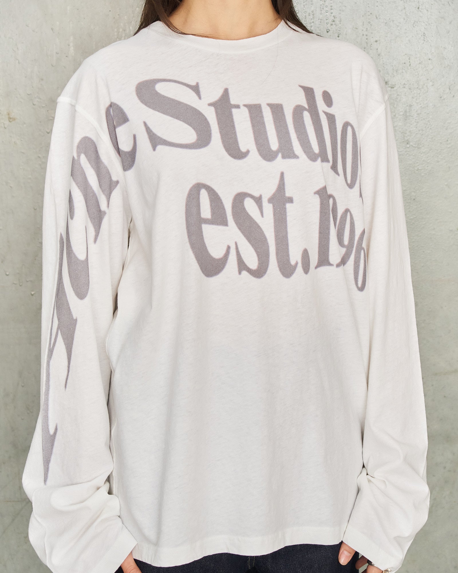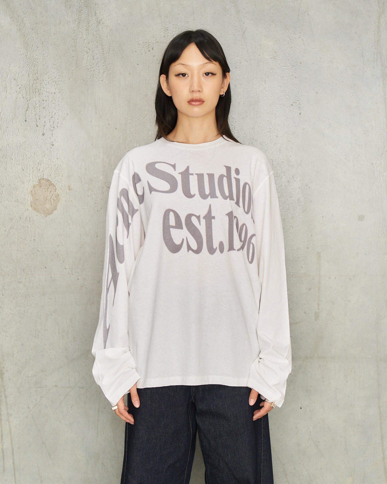 Digital print long-sleeve tee by Acne Studios in off-white. Relaxed unisex long-sleeve tee in a lightweight organic cotton and hemp blend jersey with a subtly irregular surface texture. Cut to a hip-length crew neck silhouette and detailed with a seasonal logo digital print.
