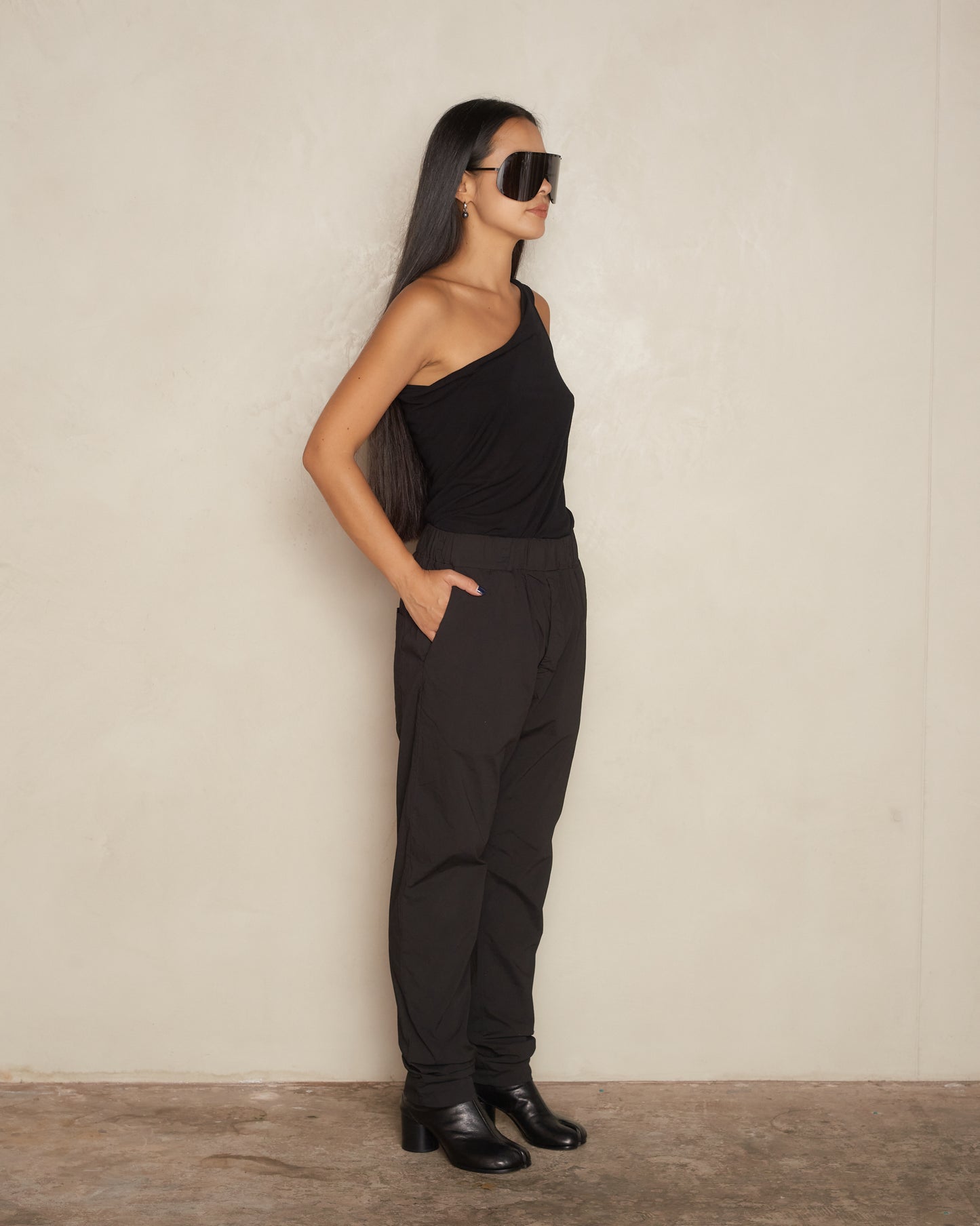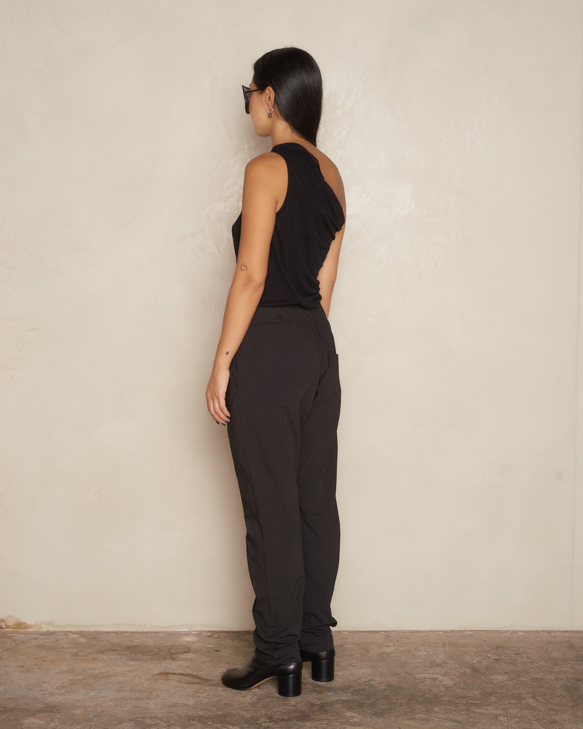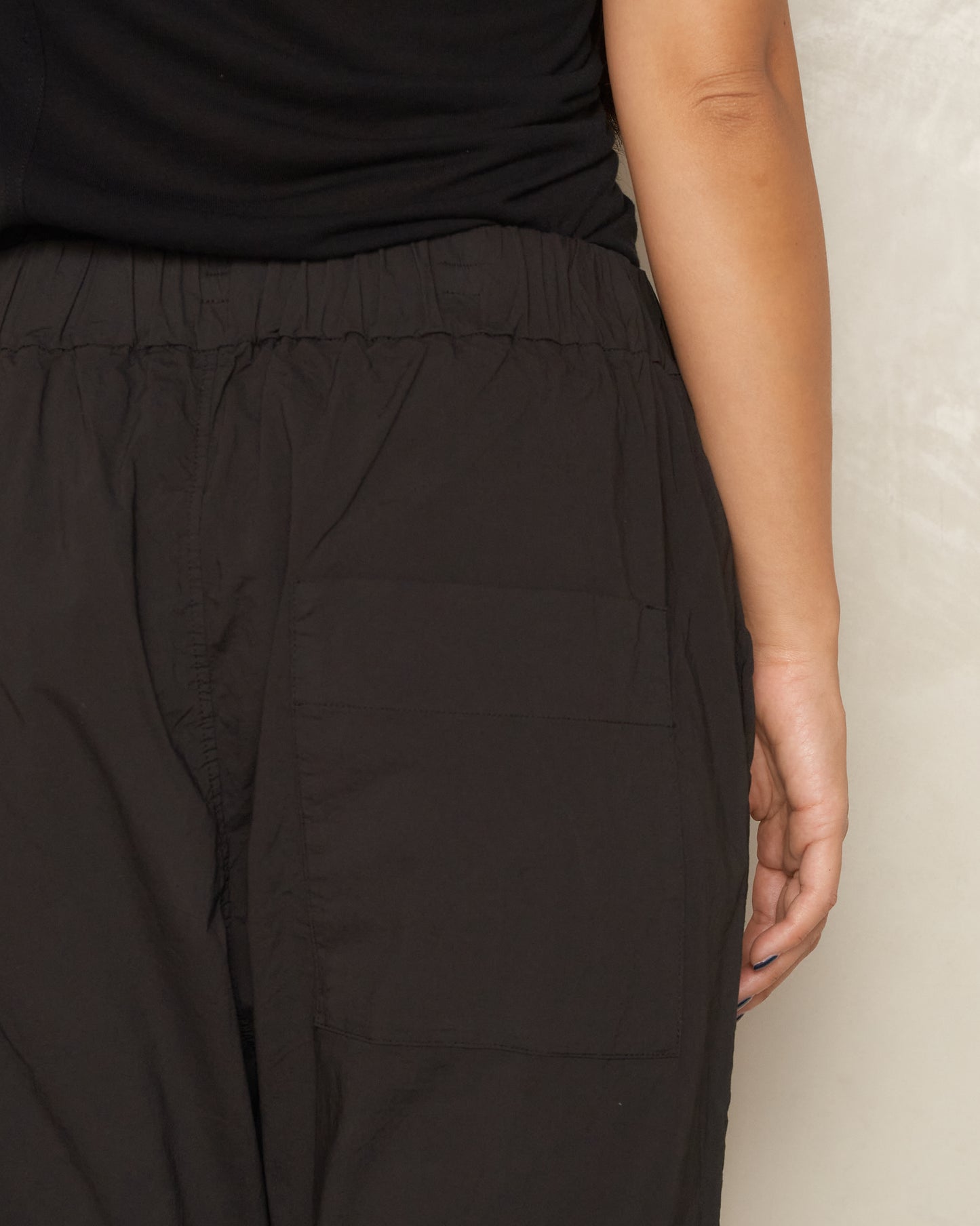 Slim trousers by Album di Famiglia in black. Meticulously-crafted cotton poplin trousers with a tapered leg. Fastens with an elasticated waistband, featuring side pockets and a single rear patch pocket.