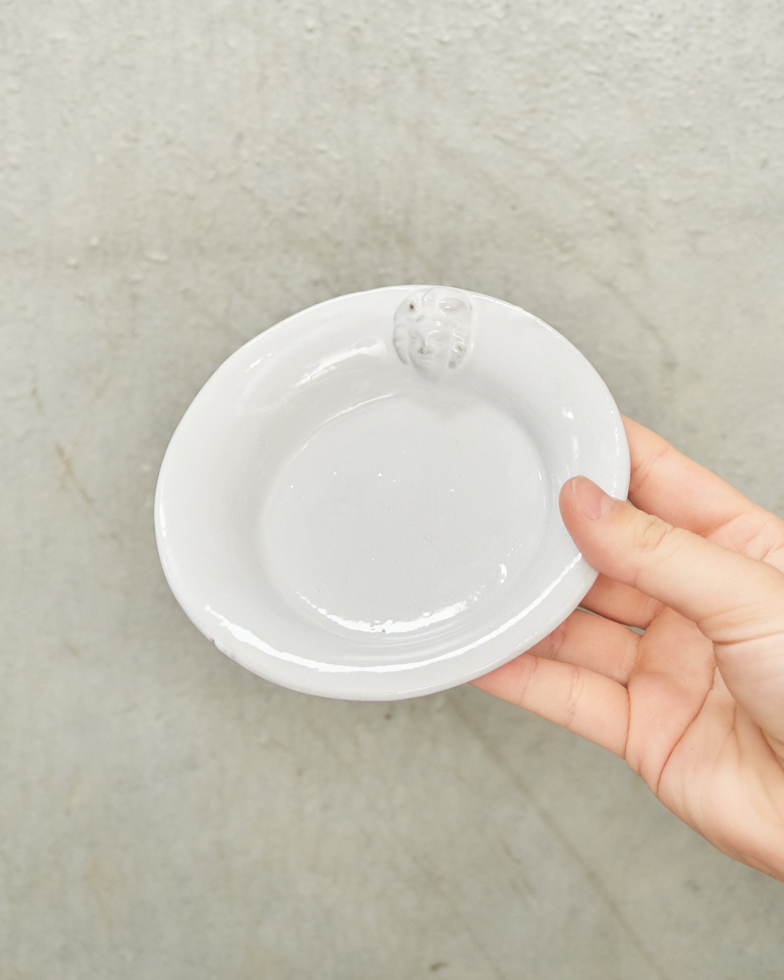 Alexandre saucer by Astier de Villatte. Circular ceramic dish with Alexandre figurehead at the crest.