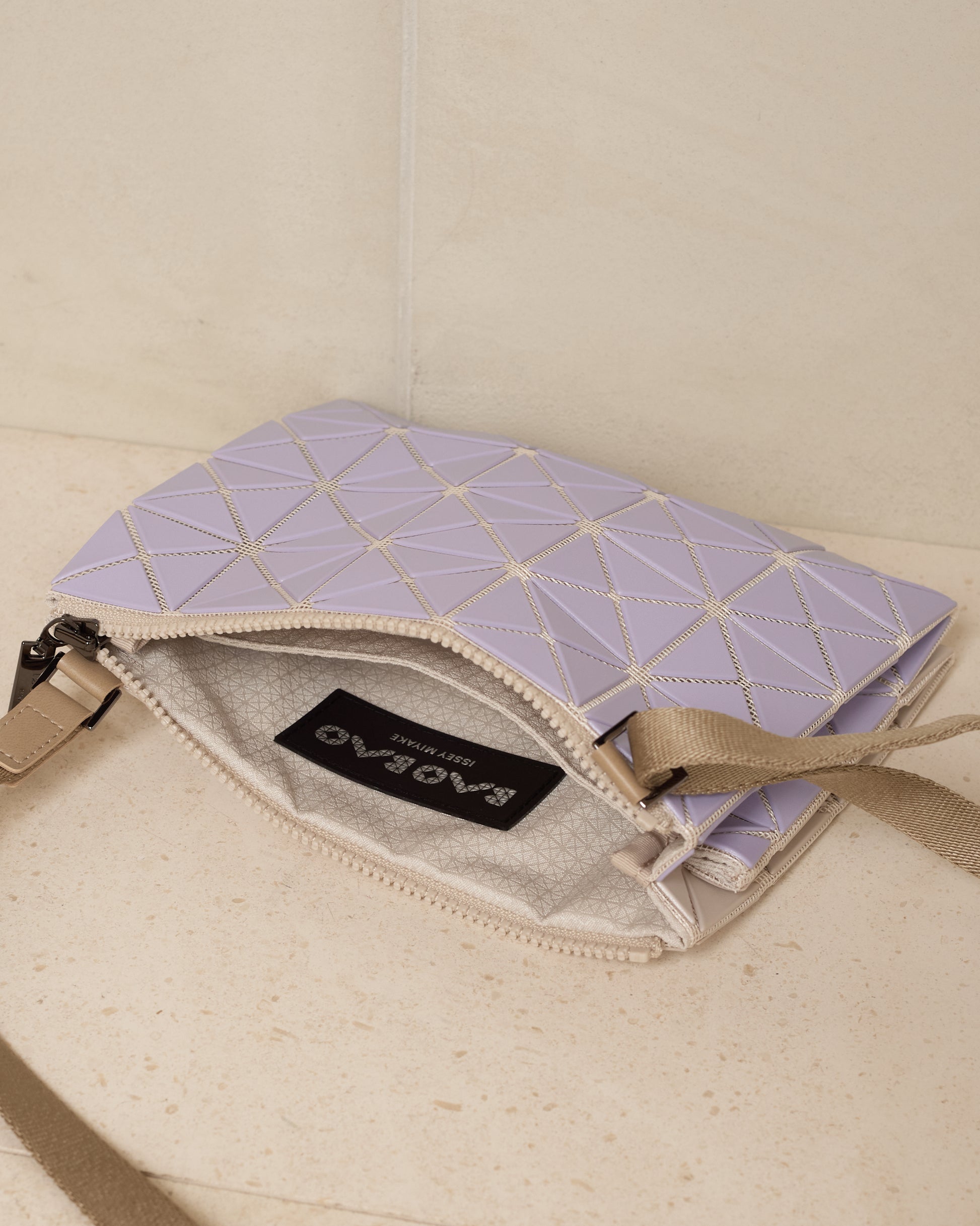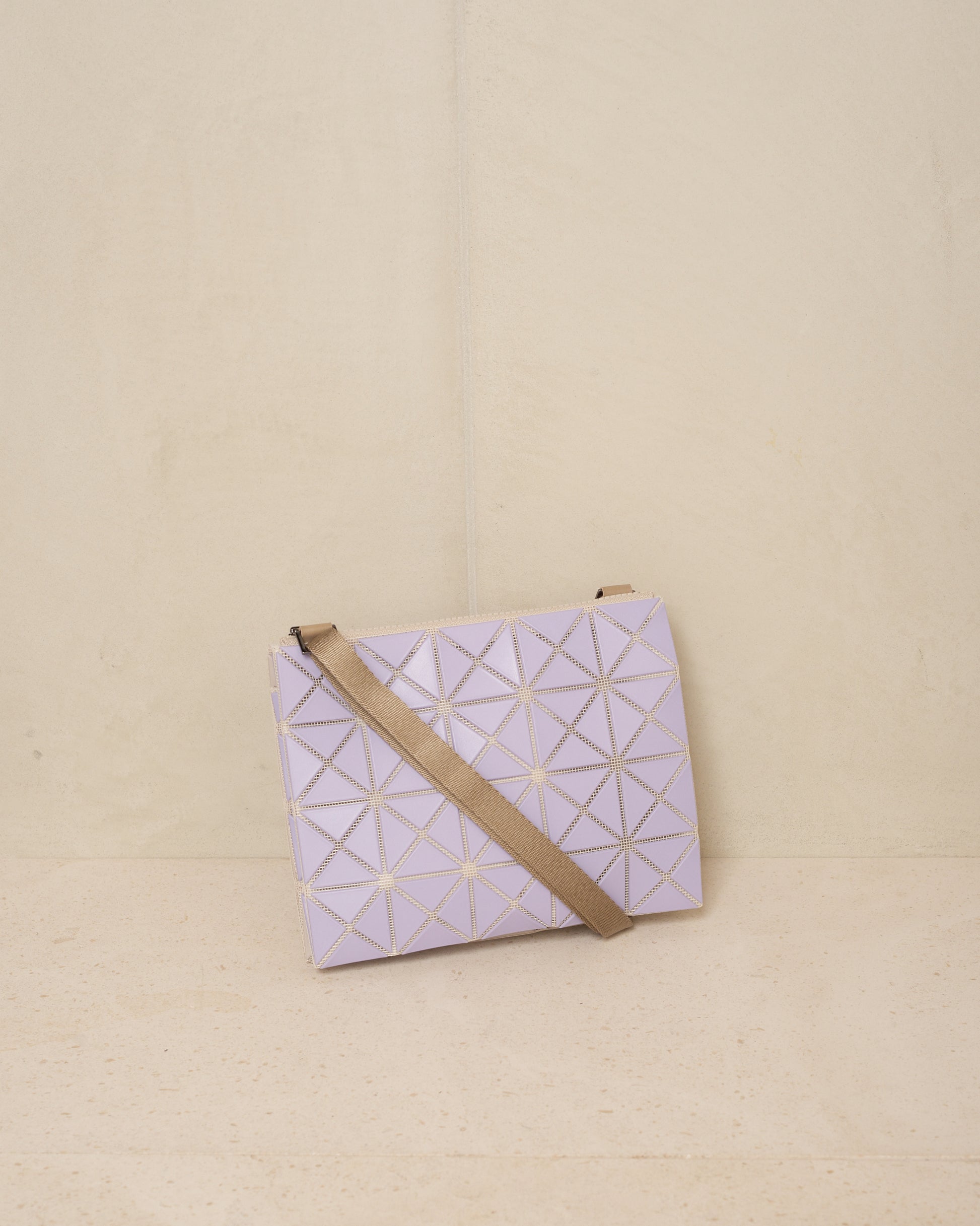 Duo bag by Bao Bao Issey Miyake in lavender. This shoulder bag features divided compartments, each adorned with dual tones for a changeable look. Matte leather-like tiles create geometric uniqueness, mounted to a mesh backing, offering a modern and distinctive aesthetic.