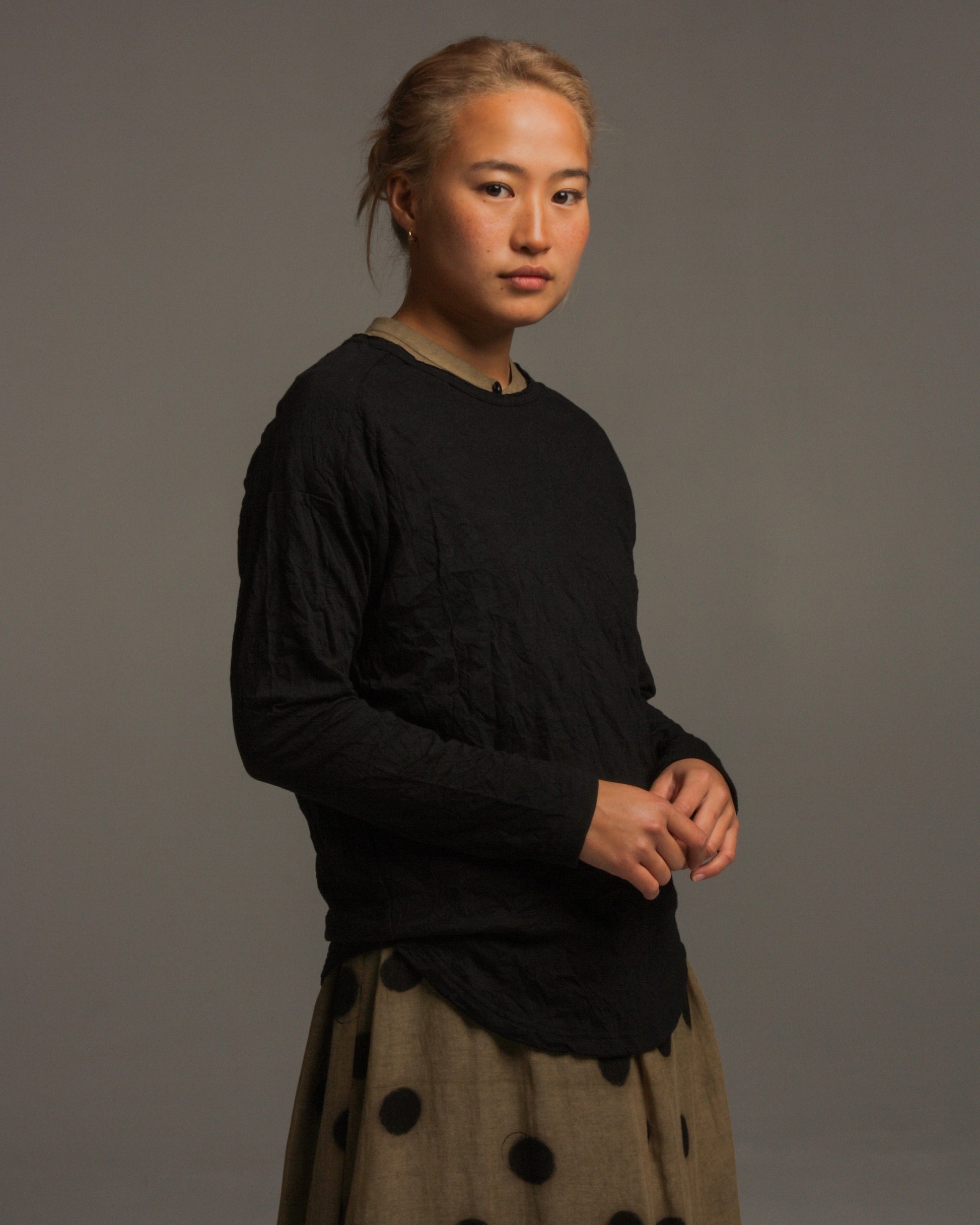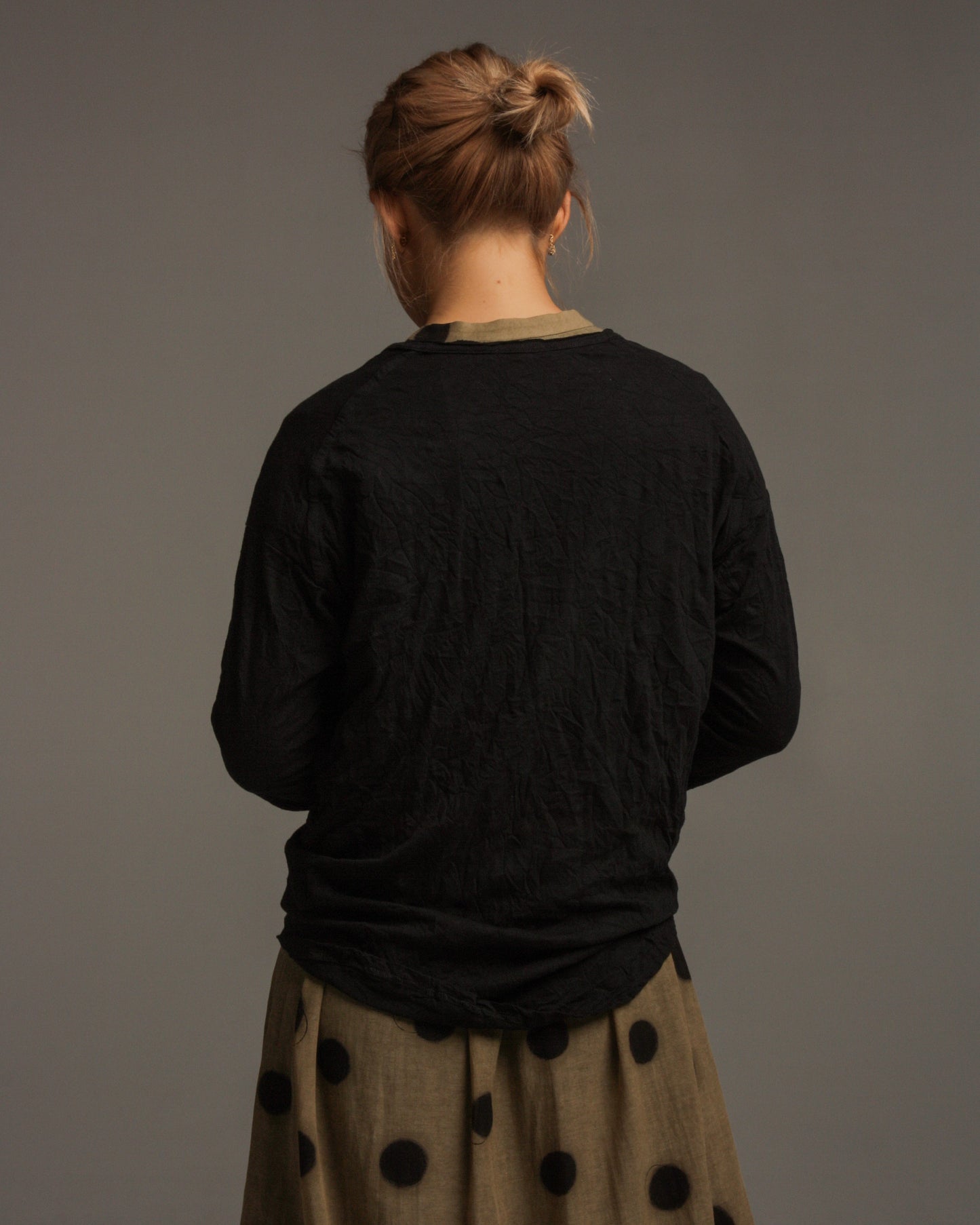 Cotton knit pullover by Pas de Calais in black. Long sleeved, relaxed fit with crew neck and curved hemline. Cotton and polyester blend is given a subtle wrinkled finish. A meticulously crafted staple style to wear and layer with anything.