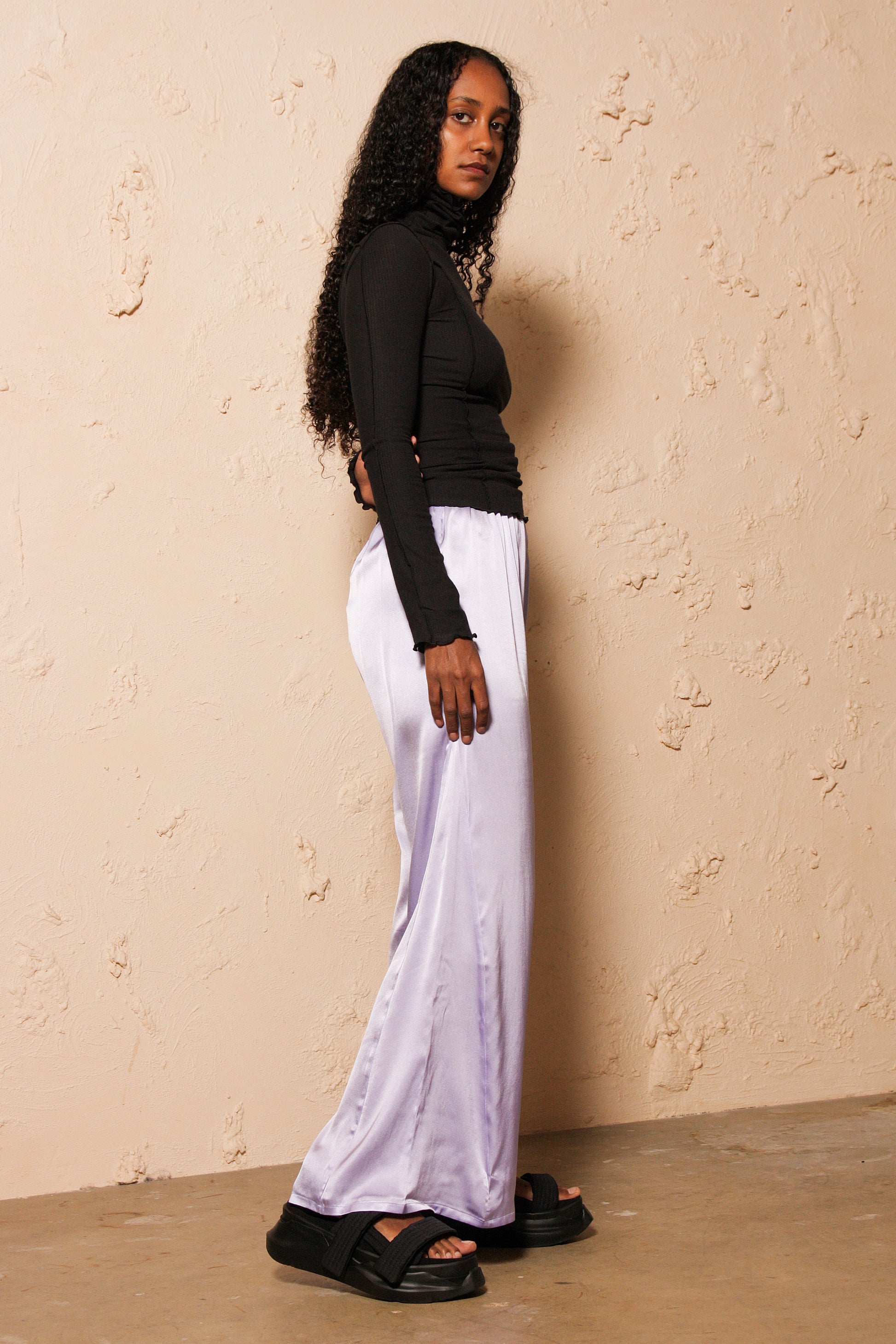 Silk lounge pants by Baserange with elasticated waist in powdery purple shade. These pants feature gusset seams at the base for a wider, comfortable shape. A tantalising piece of lounge or casual wear.