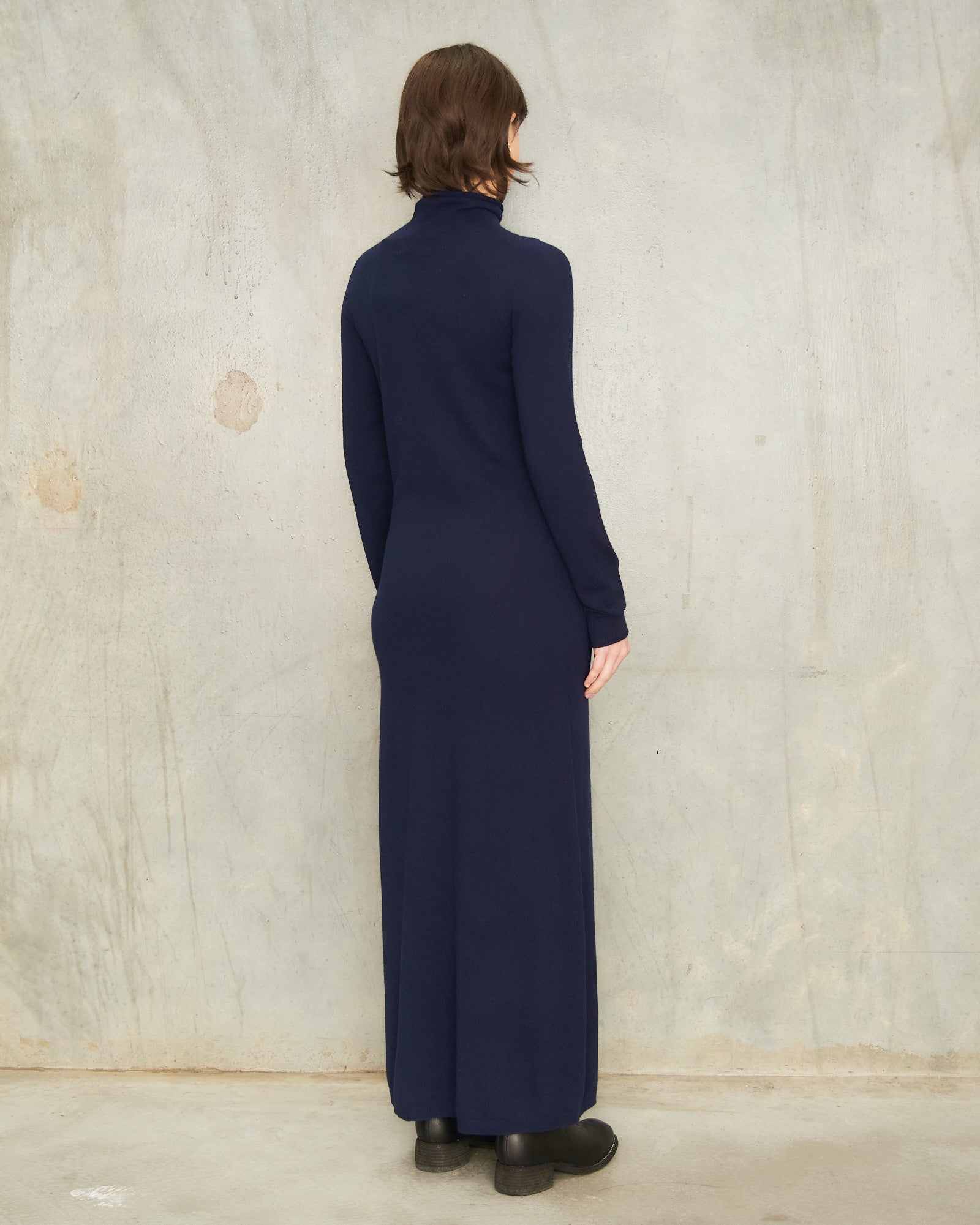Kiliox knitted dress by Christian Wijnants in navy. Wholegarment knitted dress crafted without seams in extra fine merino wool and cashmere. Elegant high rolled collar balanced with long draped sleeves. Effortlessly effusive.