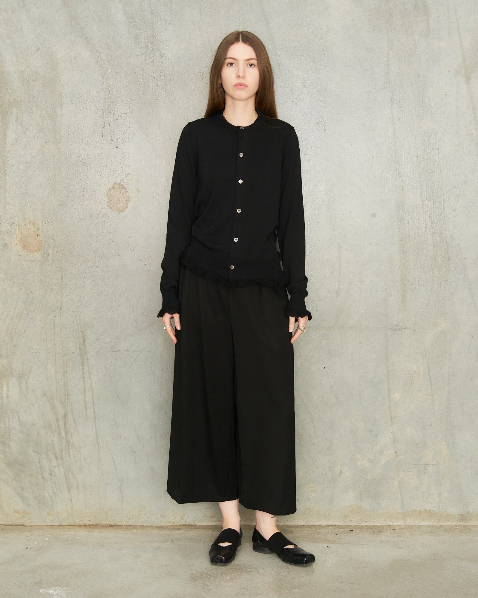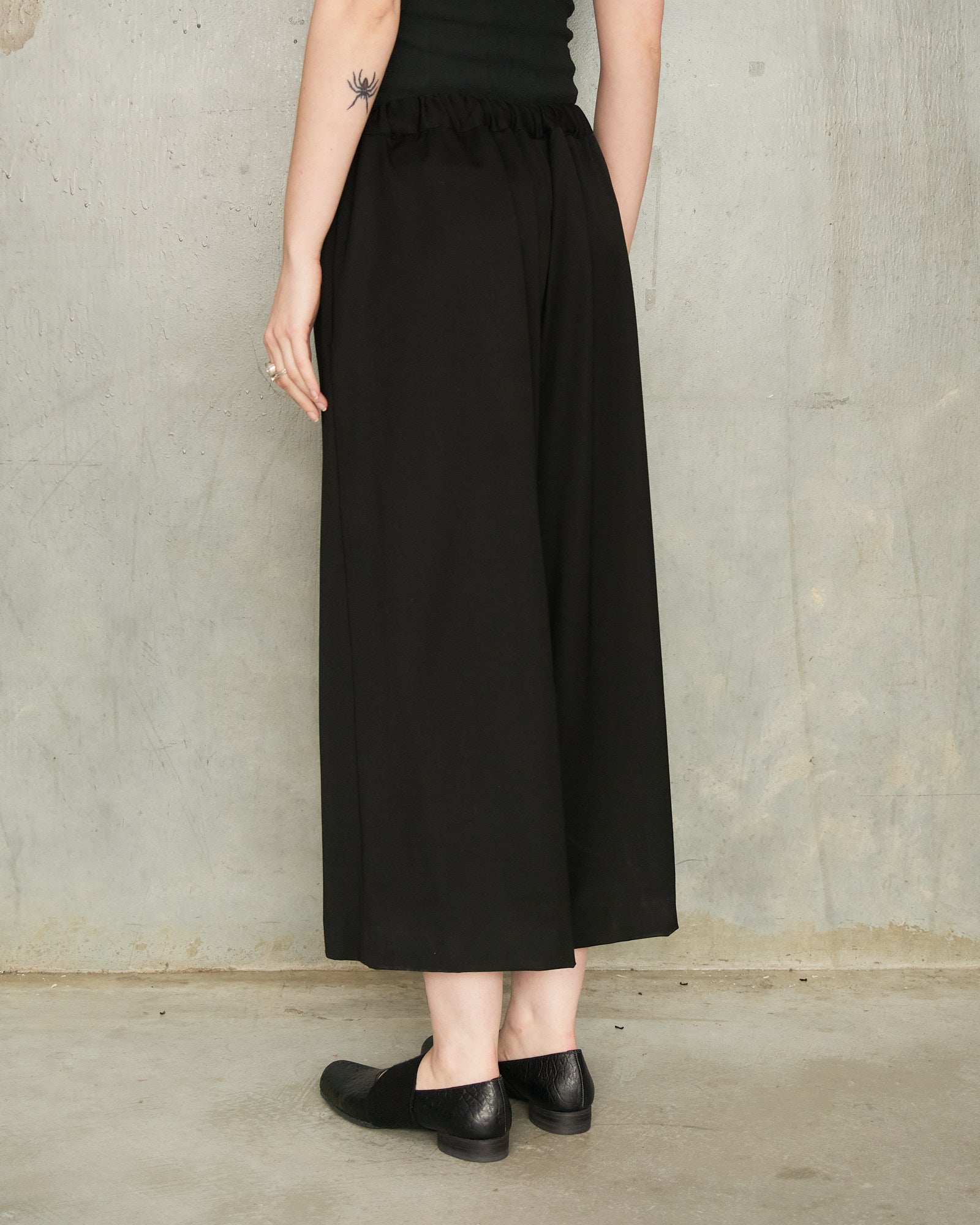 Wide drawstring trousers by Comme des Garçons Comme des Garçons in black. The line's signature suiting wool crafts this easy-wearing piece, falling from an elastic waistband to a comfortably wide cropped hem.