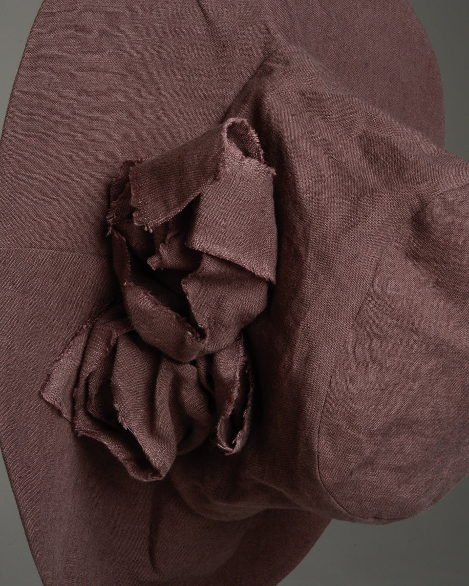 Aubergine flower hat by Der Antagonist. Meticulously handcrafted in a lavish aubergine linen. Malleable wide brim sits and drapes poetically, with a ruffled raw-edge rosette decorating one side. Lined with a blend of cotton and linen.