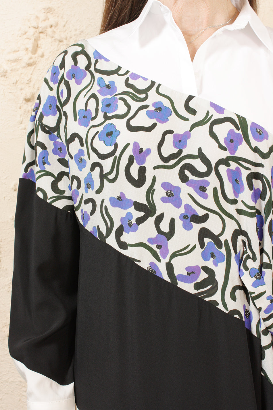 Desa colourblocked shirtdress by Christian Wijnants featuring panel of hand-designed floral print. Relaxed fit with classic collar, long sleeves, asymmetrical hemline and adjustable tie at the waist.