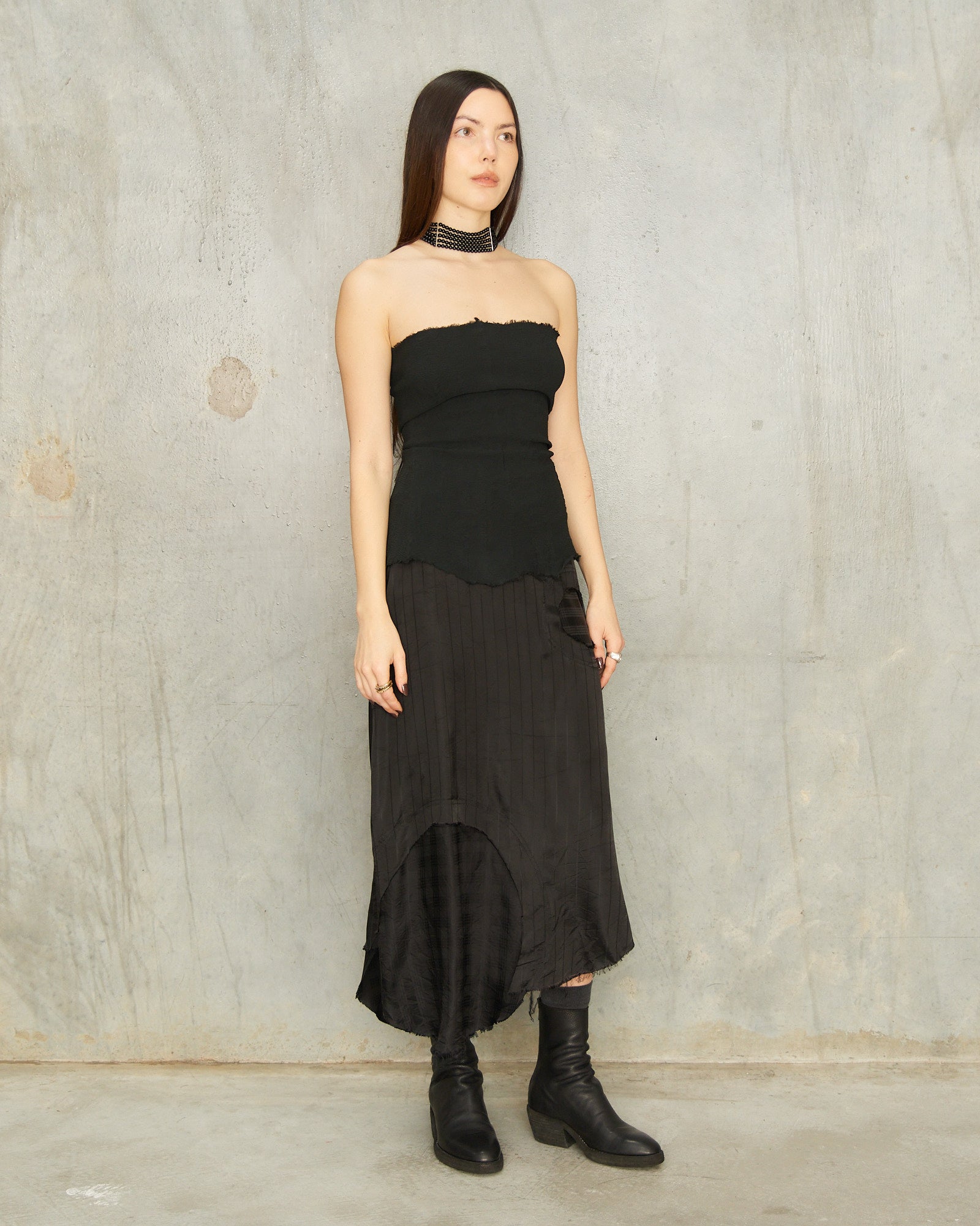 Side view skirt by Edward Cuming in black. High-waisted skirt in fluid cupro with a subtle striped jacquard texture. A small circular cut-out at the waist reveals contrasting plaid viscose beneath, while a larger circular panel drapes asymmetrically at the hem, creating an unexpected and layered volume.