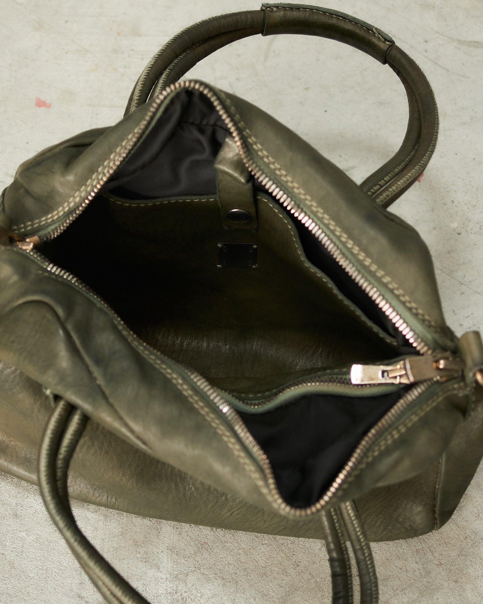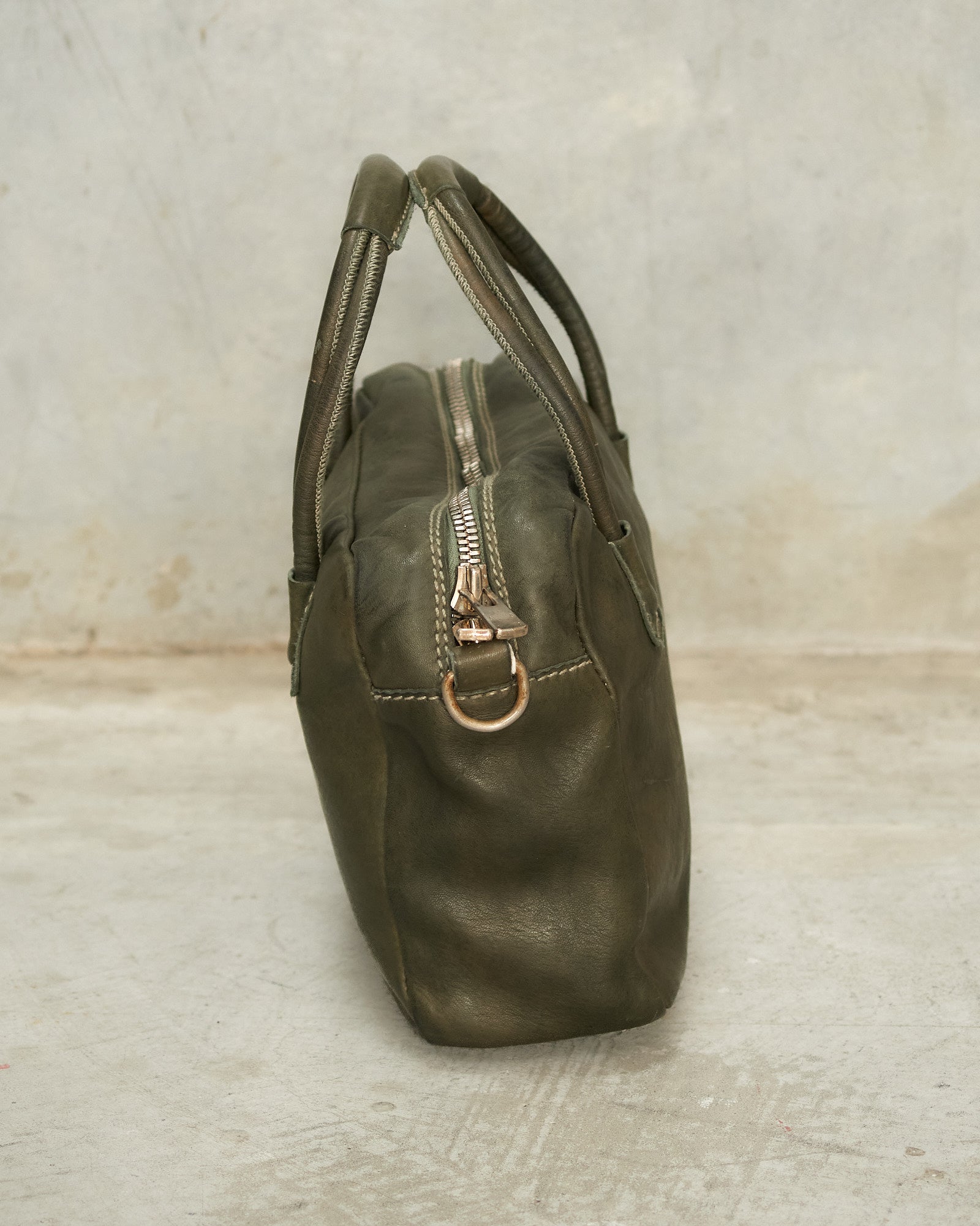 RG01 handle bag by Guidi in military green. Classic top-handle bag in soft full-grain horse leather, finished with optional shoulder straps for versatile crossbody wear.