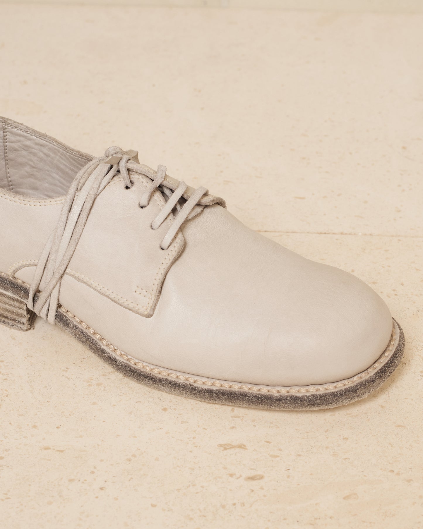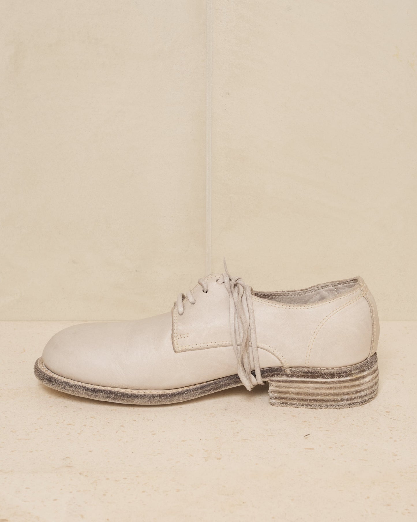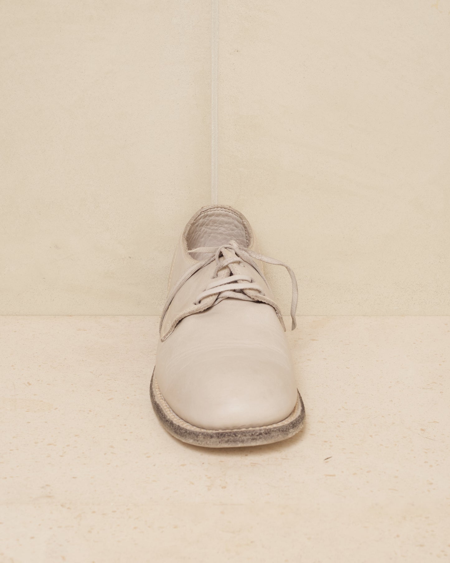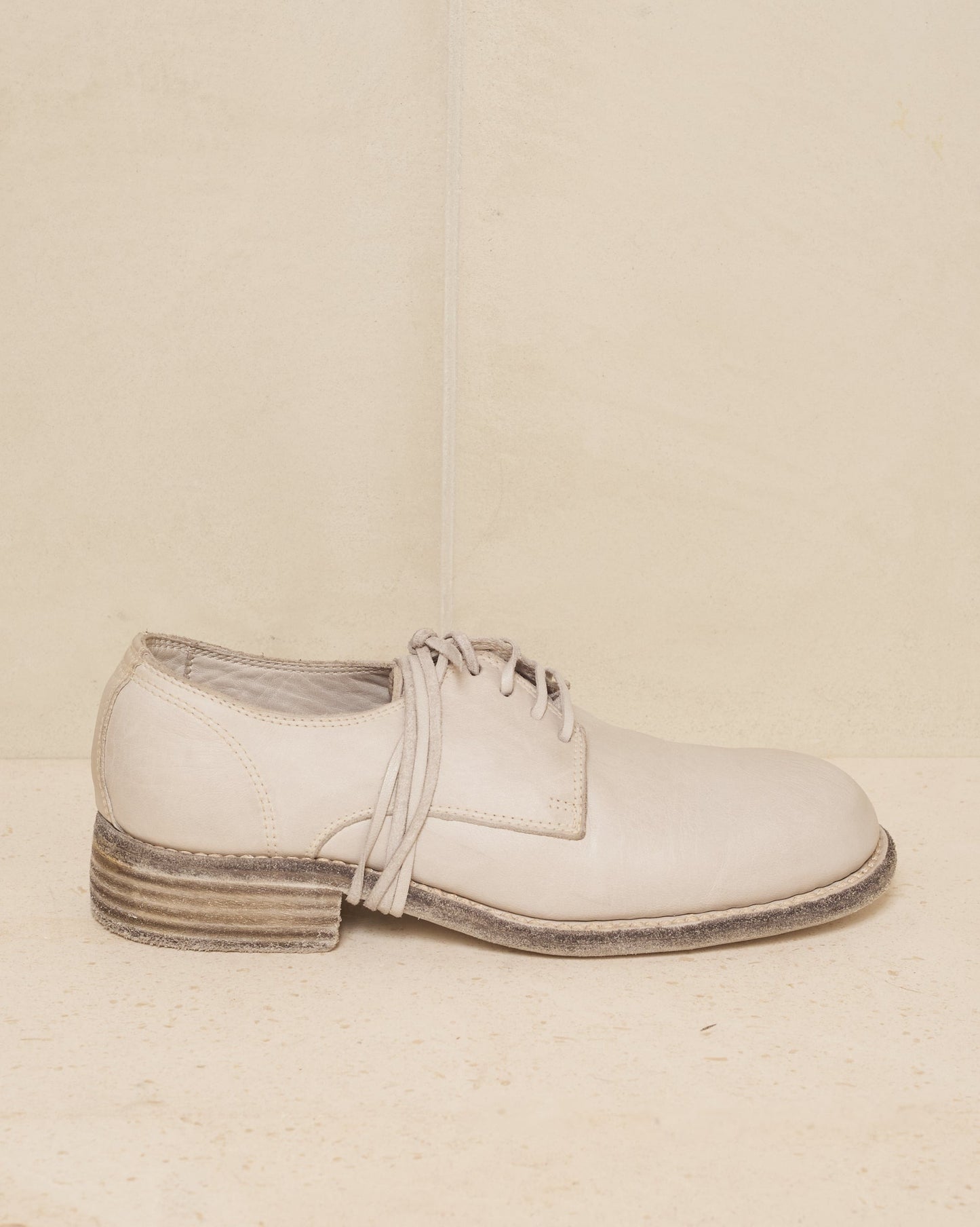 Classic 992 derby by Guidi in oyster grey. Artisanal derby shoes with wrap-around leather laces. Comfortable low stacked leather heel, paired with Guidi's trademark stamp and hardware at the sole.