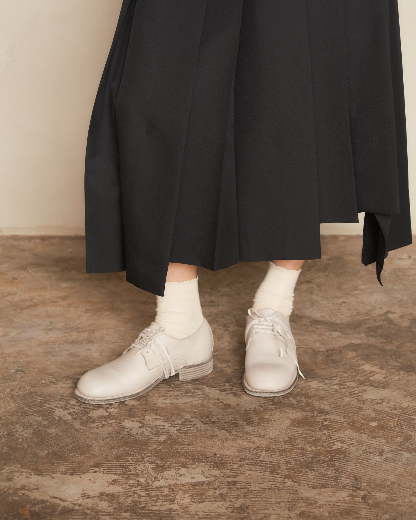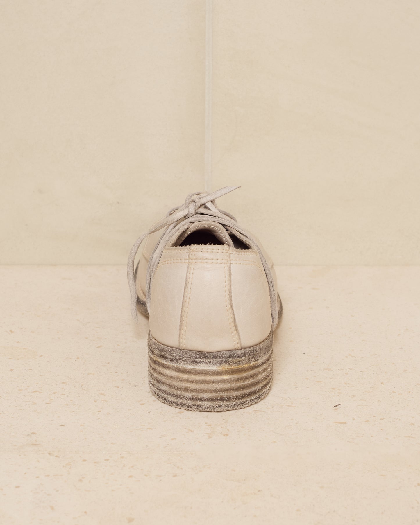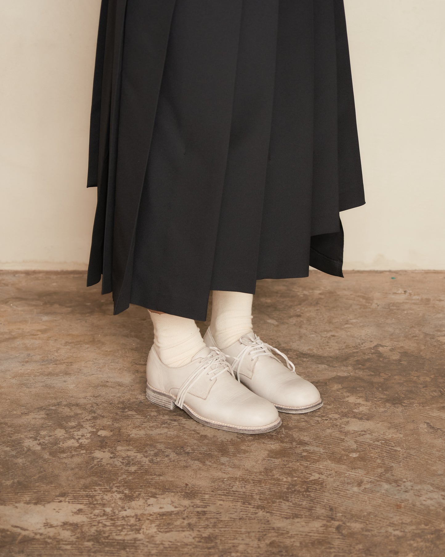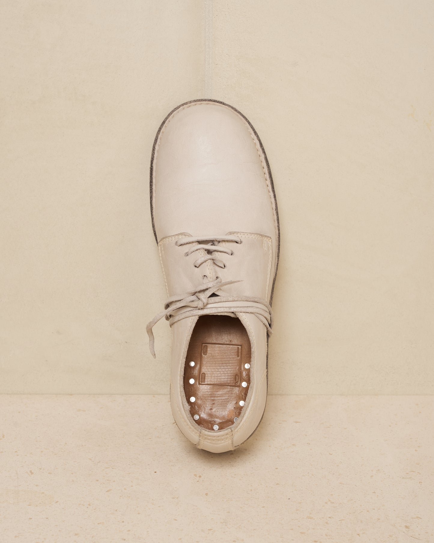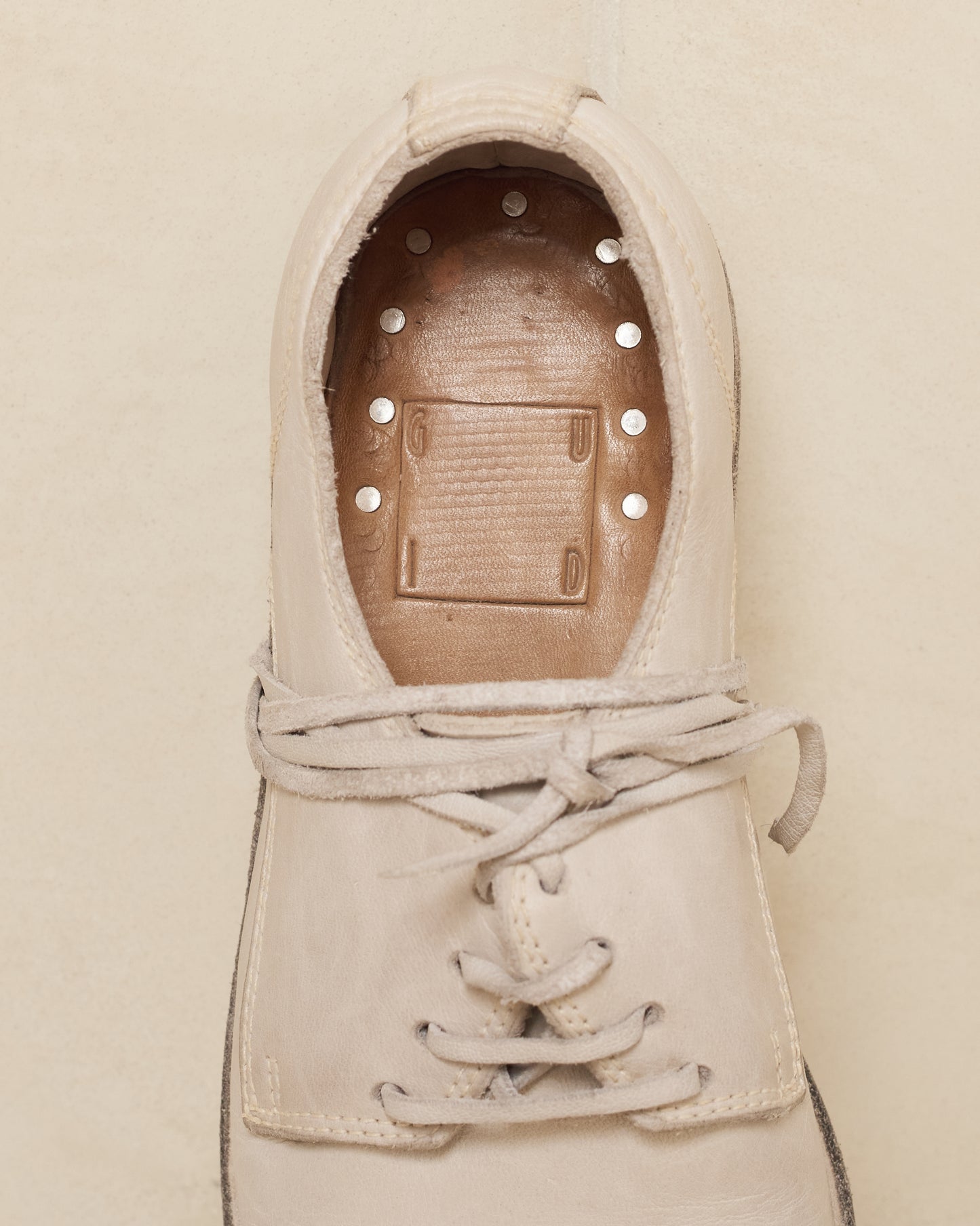 Classic 992 derby by Guidi in oyster grey. Artisanal derby shoes with wrap-around leather laces. Comfortable low stacked leather heel, paired with Guidi's trademark stamp and hardware at the sole.
