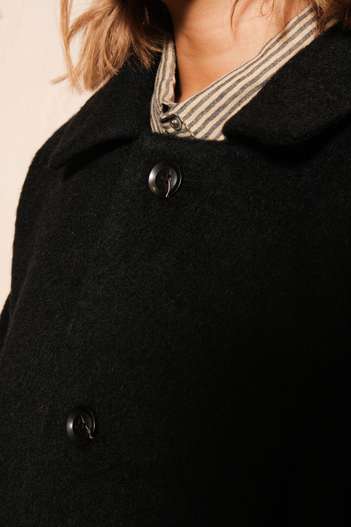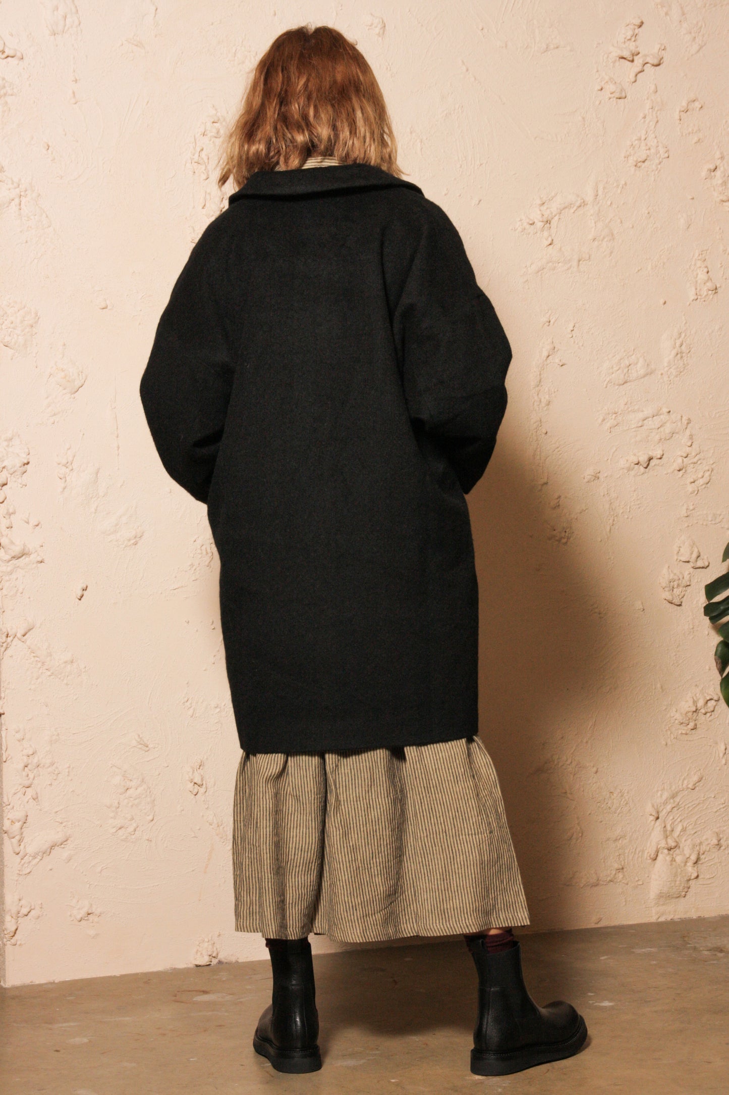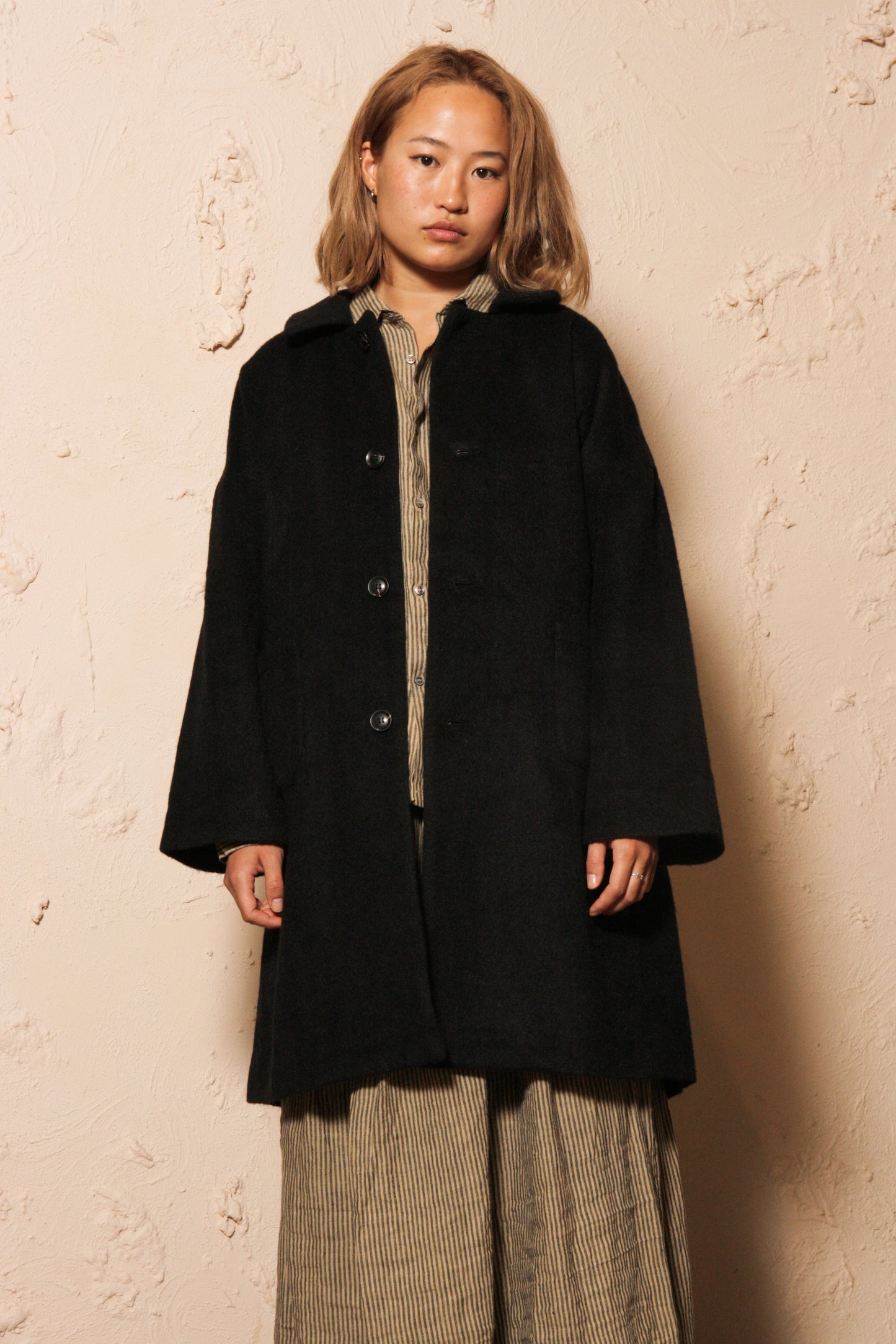Long Mosser coat by Japanese brand Ichi Antiquites in a black alpaca wool. Features a small collar, classic pockets, brown button closure in a longer style that finishes above the knee.