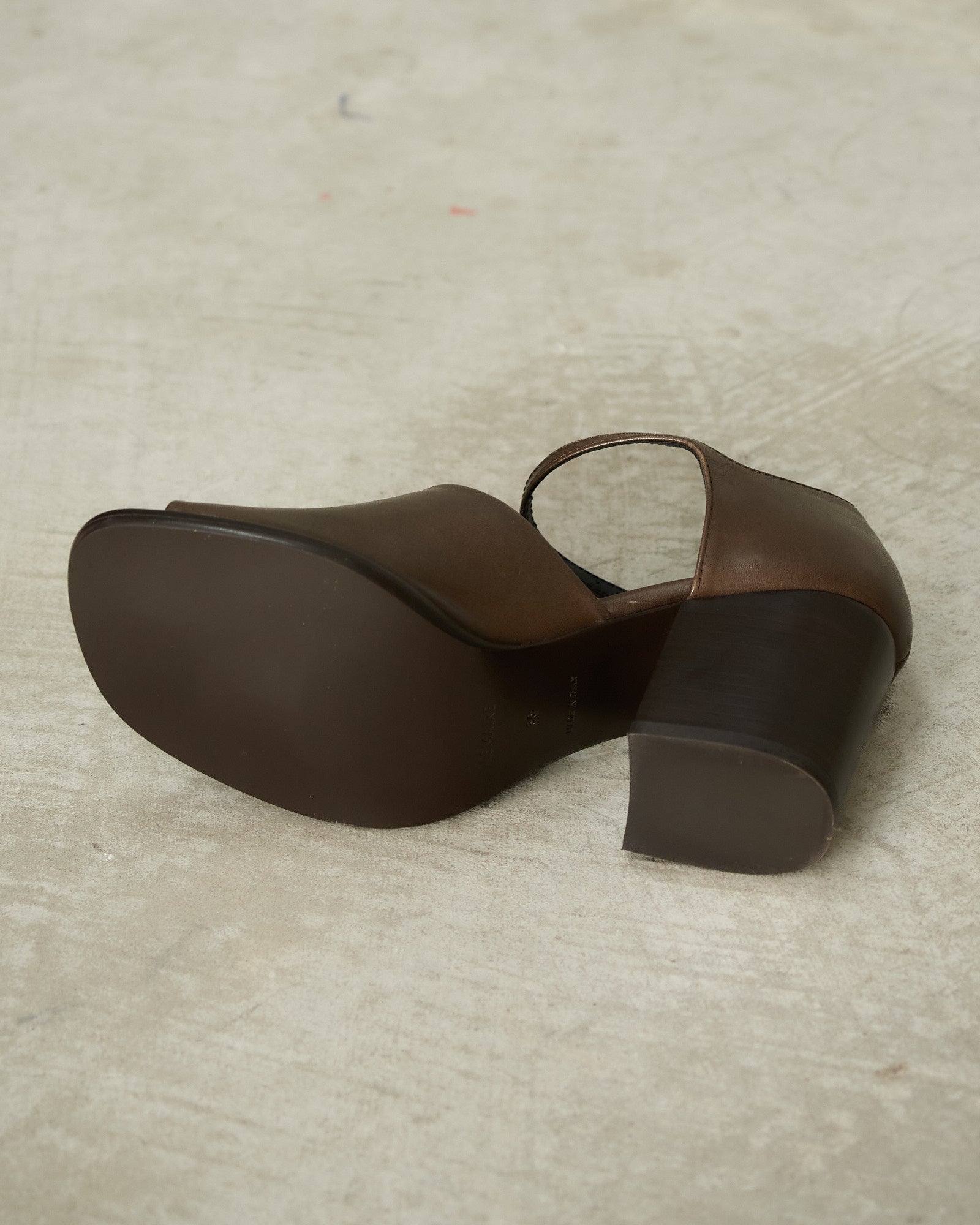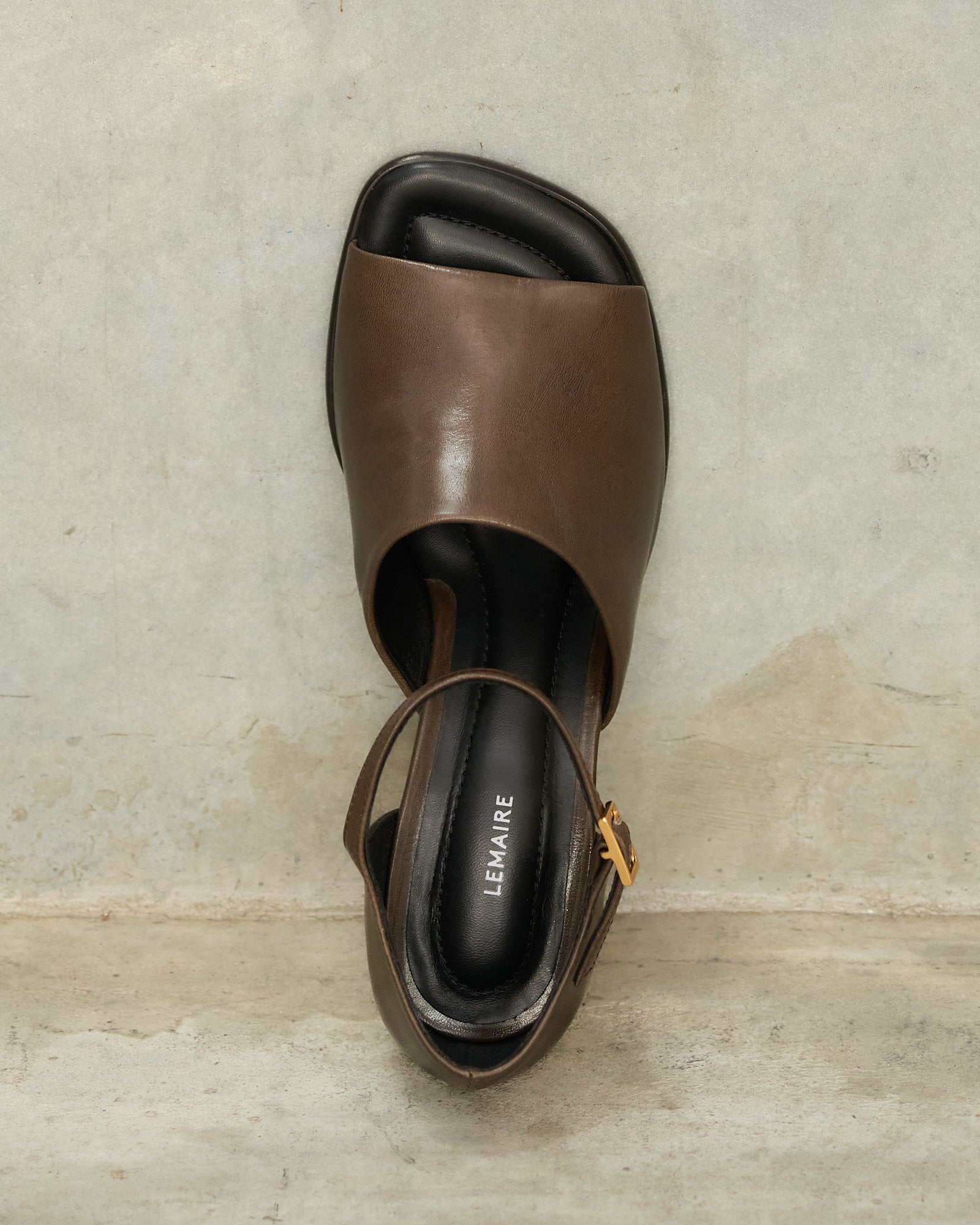 Square heeled sandals by Lemaire in dark brown. Open-toe sandals crafted in rich vegetable tanned leather, featuring sleek straps and a chunky square block heel.