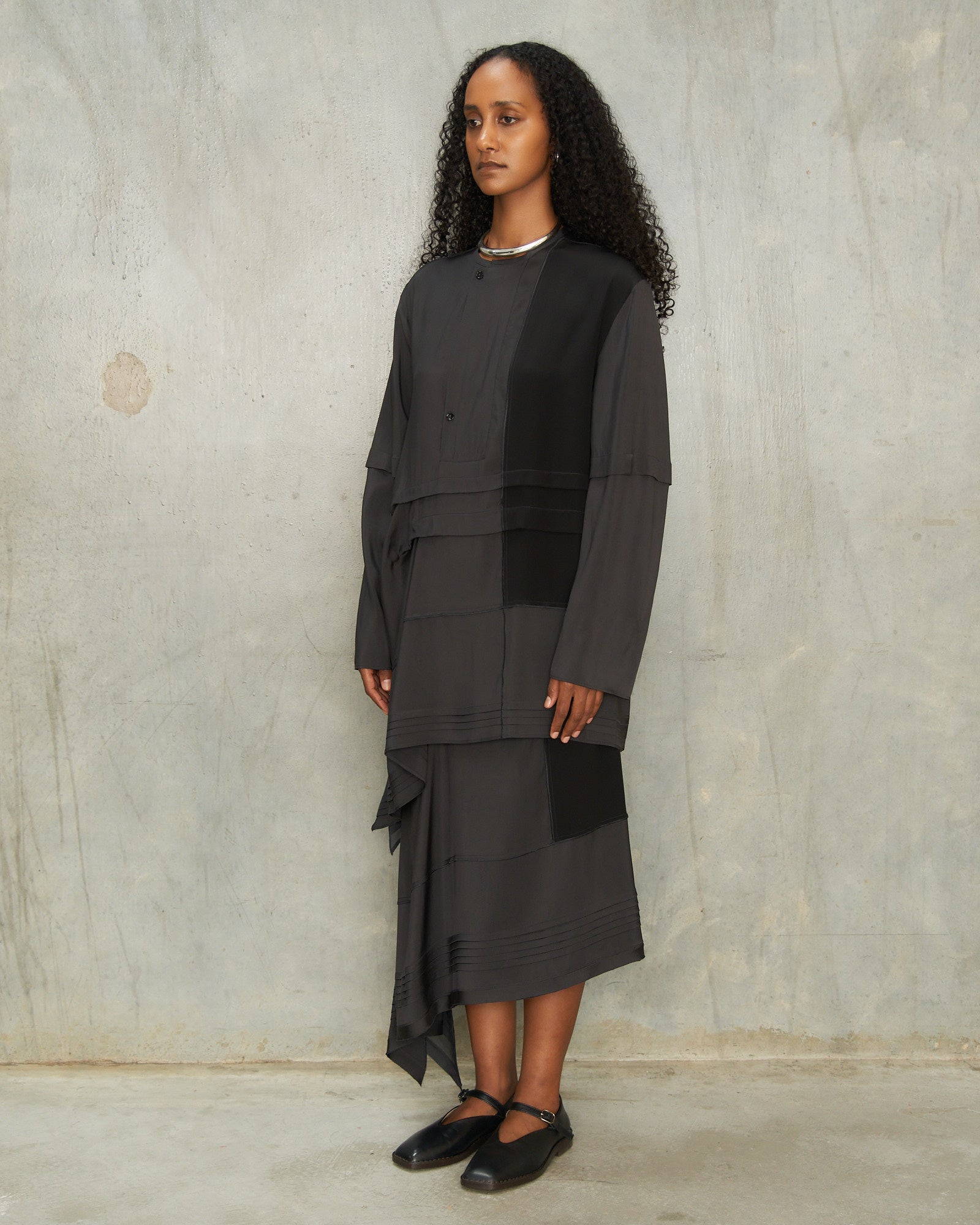 Pleated skirt by Lemaire in slate grey. Elegant and asymmetrically draped from a patchwork of crepe de chine and silk, this unlined skirt falls with airy ease. Finished with soft pleats and refined satin stitching.