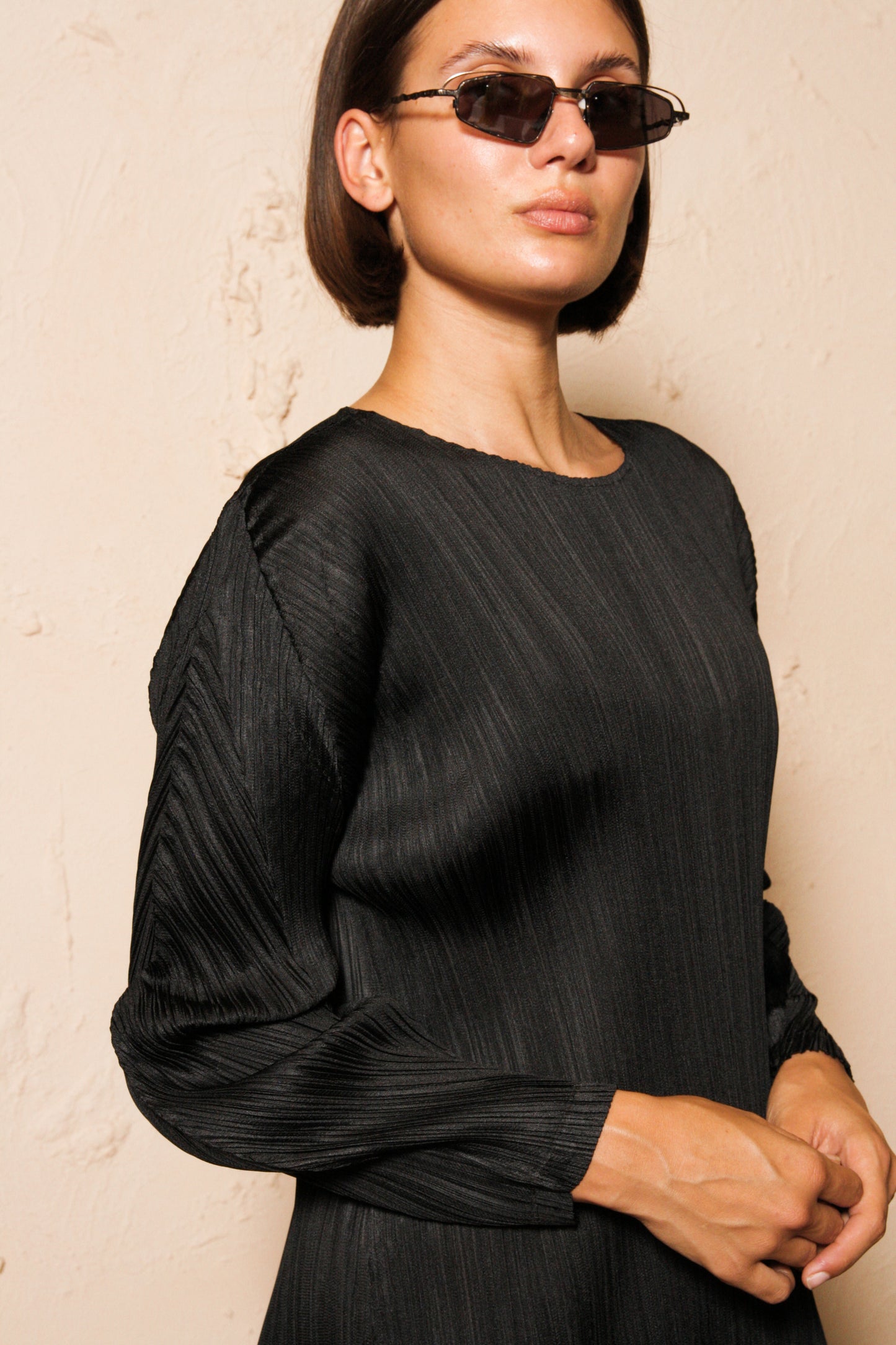 Long sleeve dress by Issey Miyake, Pleats Please in a classic black. Features a tapered sleeve detail, long hem and a circle neck line.