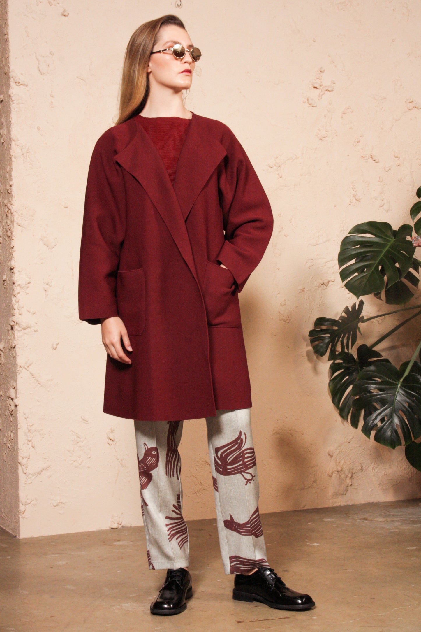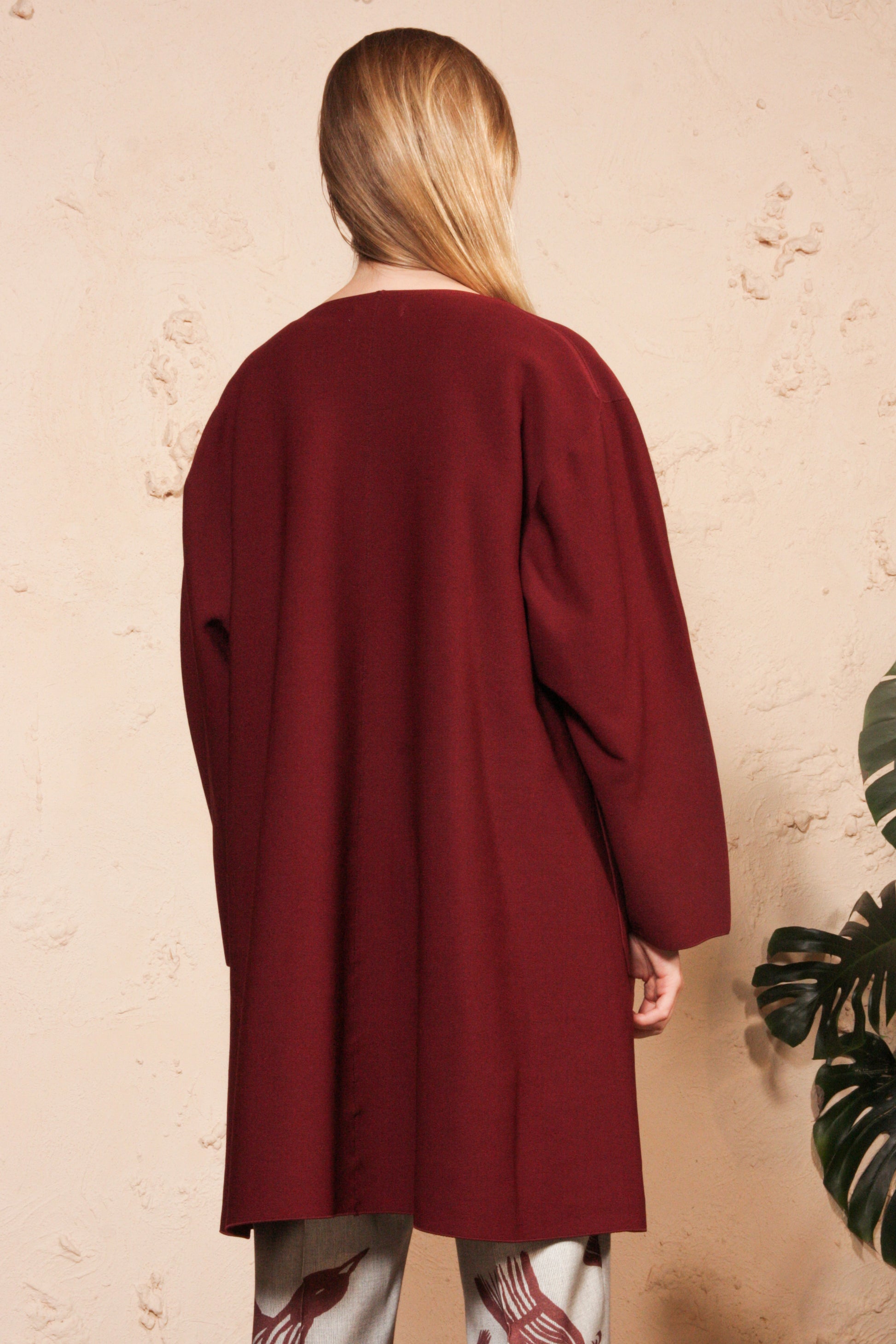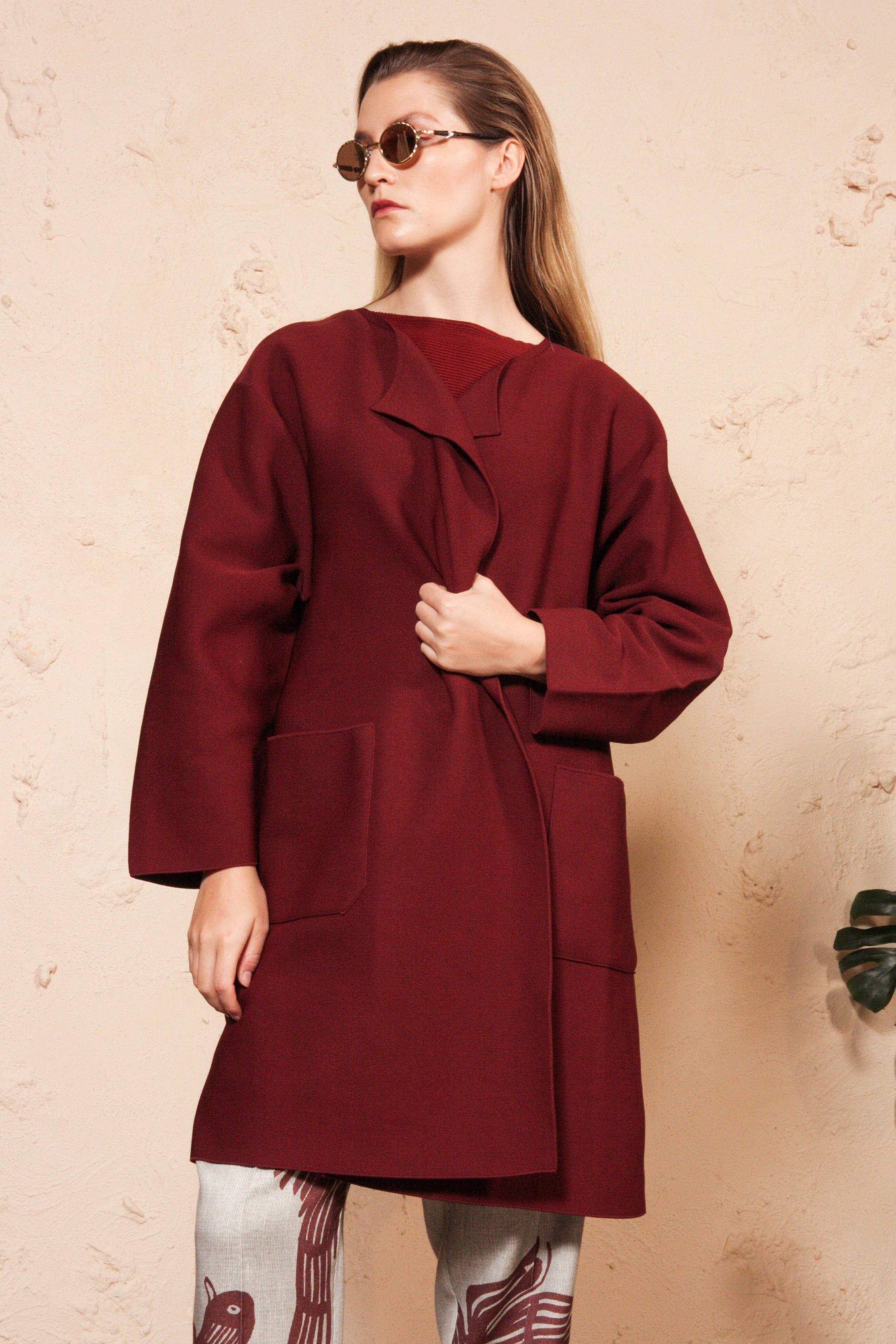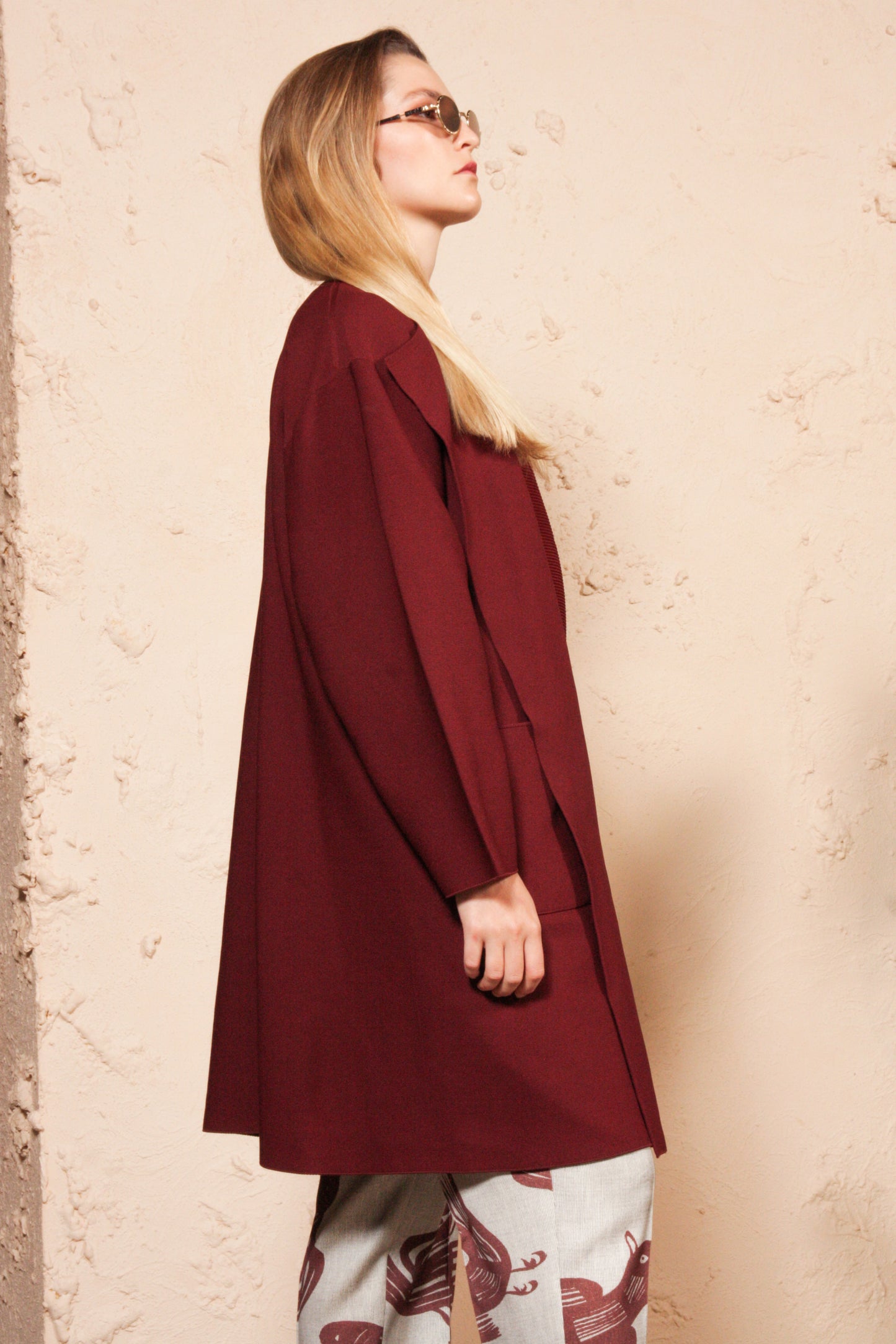 Knitted coat in burgundy by Issey Miyake ME. Collarless style with minimal tailoring for a comfortable and light feel. Features two big pockets and loose fit sleeves.