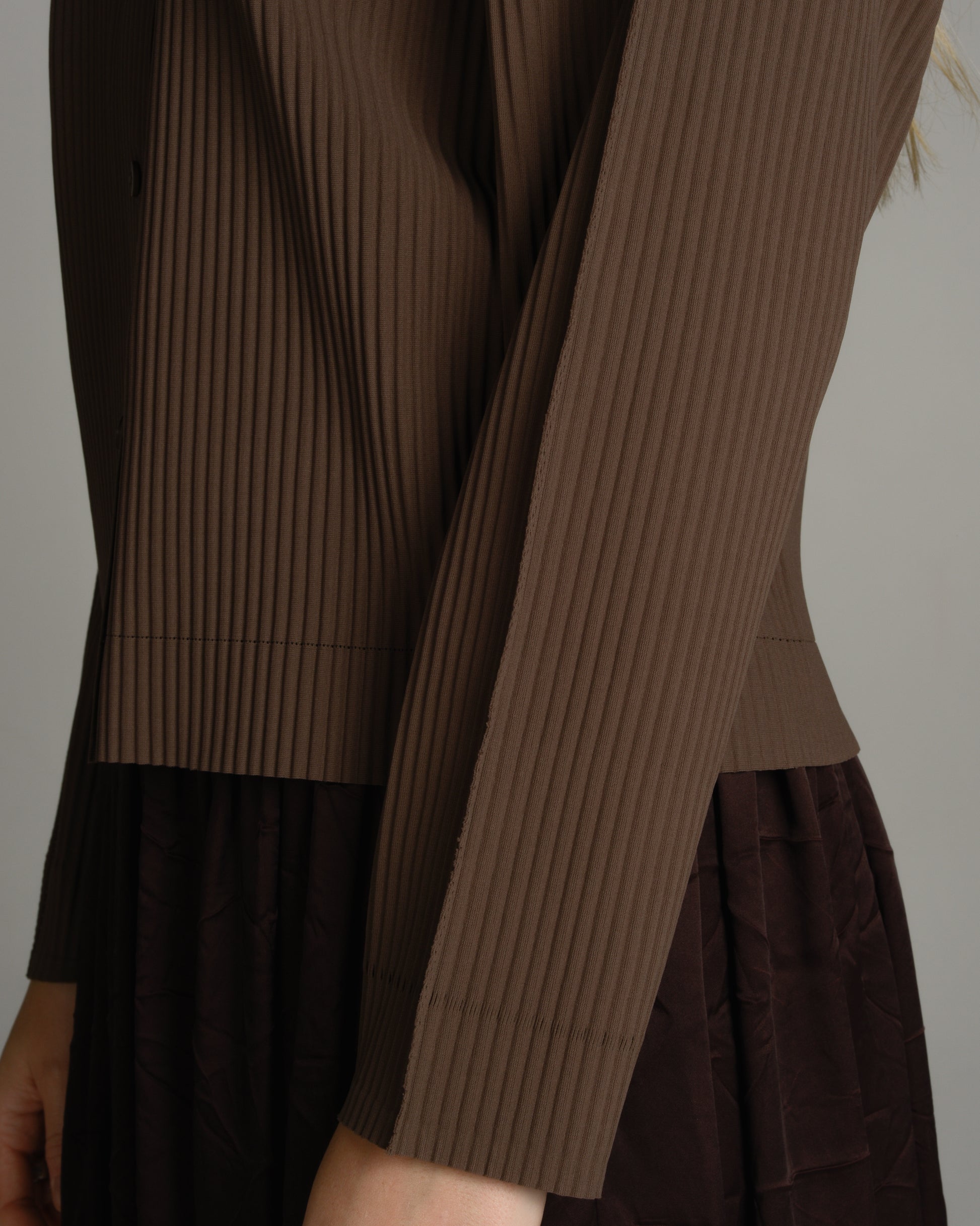 Basic pleat cardigan by Issey Miyake ME in brown. Fine knitted collarless cardigan characterised by a lightweight, soft feel and a knit material made with stretchy yarn. Buttoned closure and a boxy fit.