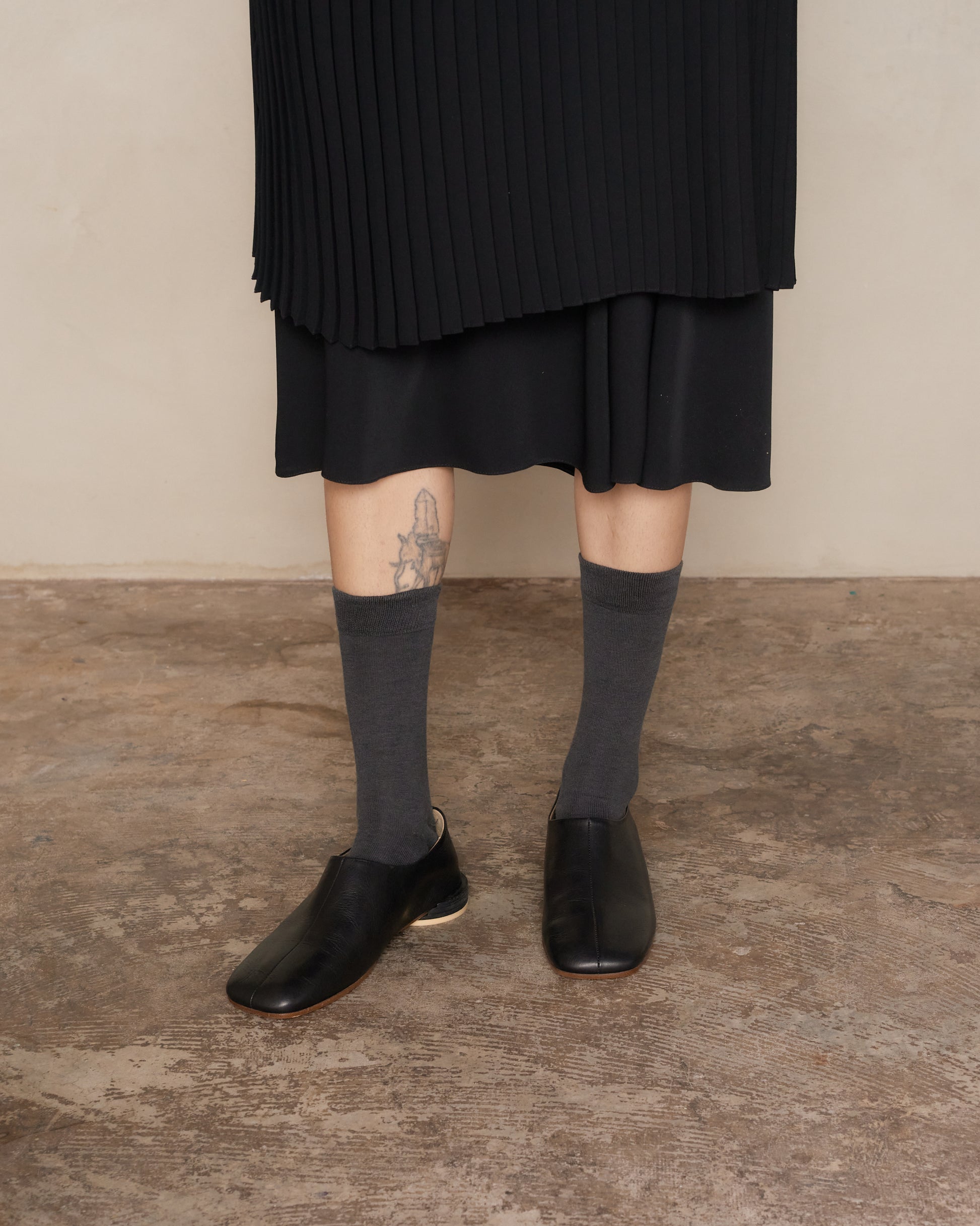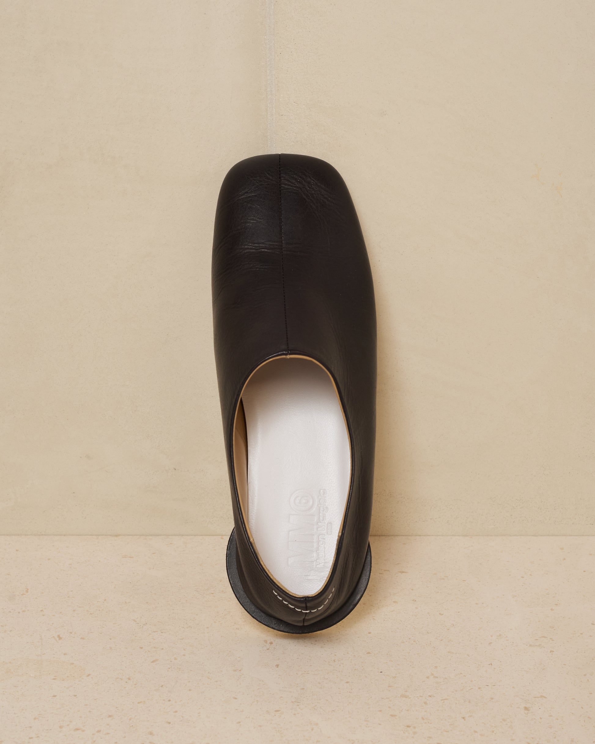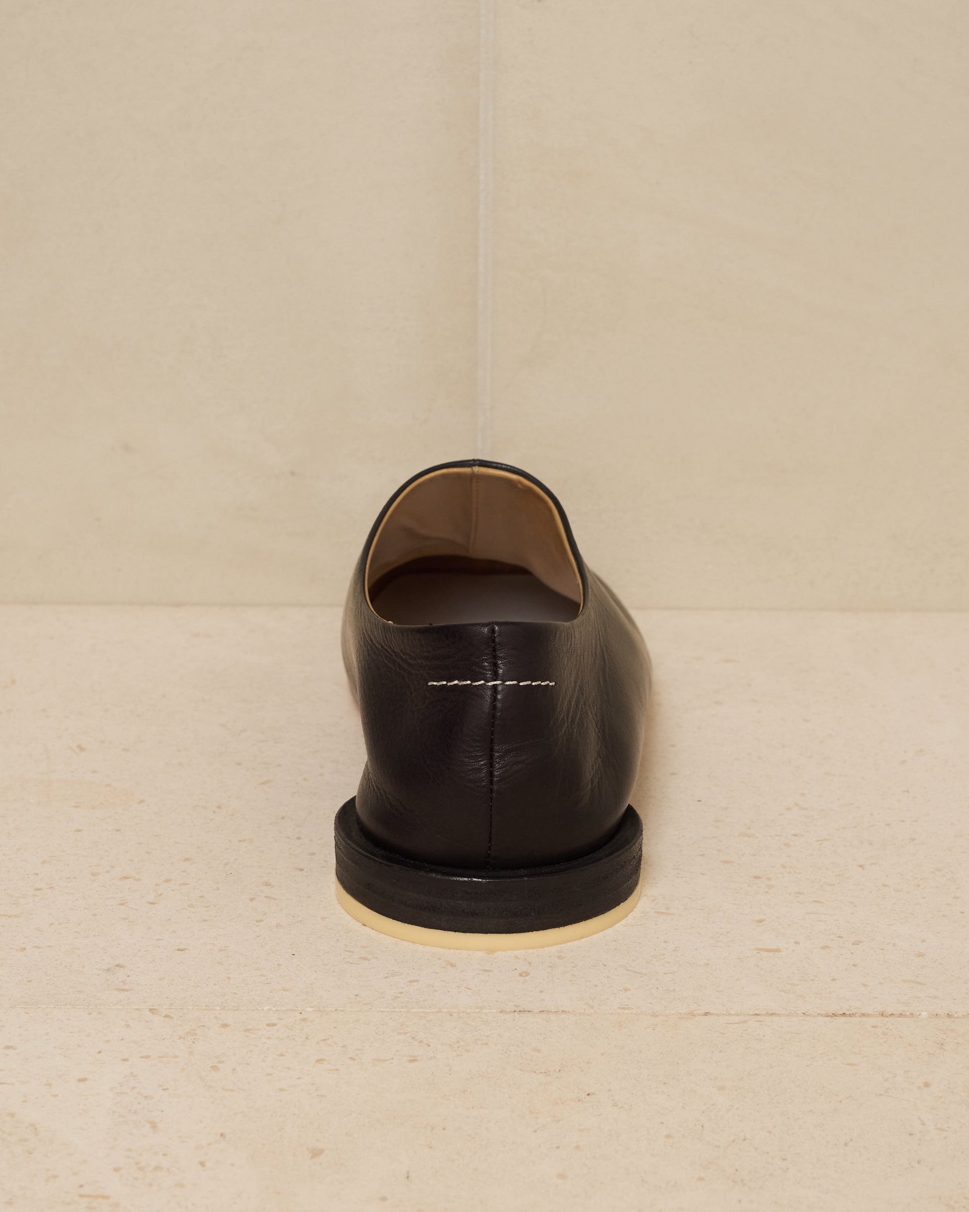 Leather moccasin by MM6 Maison Margiela. Slip-on style in beautifully soft calfskin leather. Crafted with a single central seam and symmetrical soft squared toe. Low cylindrical stacked leather heel with '6' logo imprint. Signature white stitch at the collar.