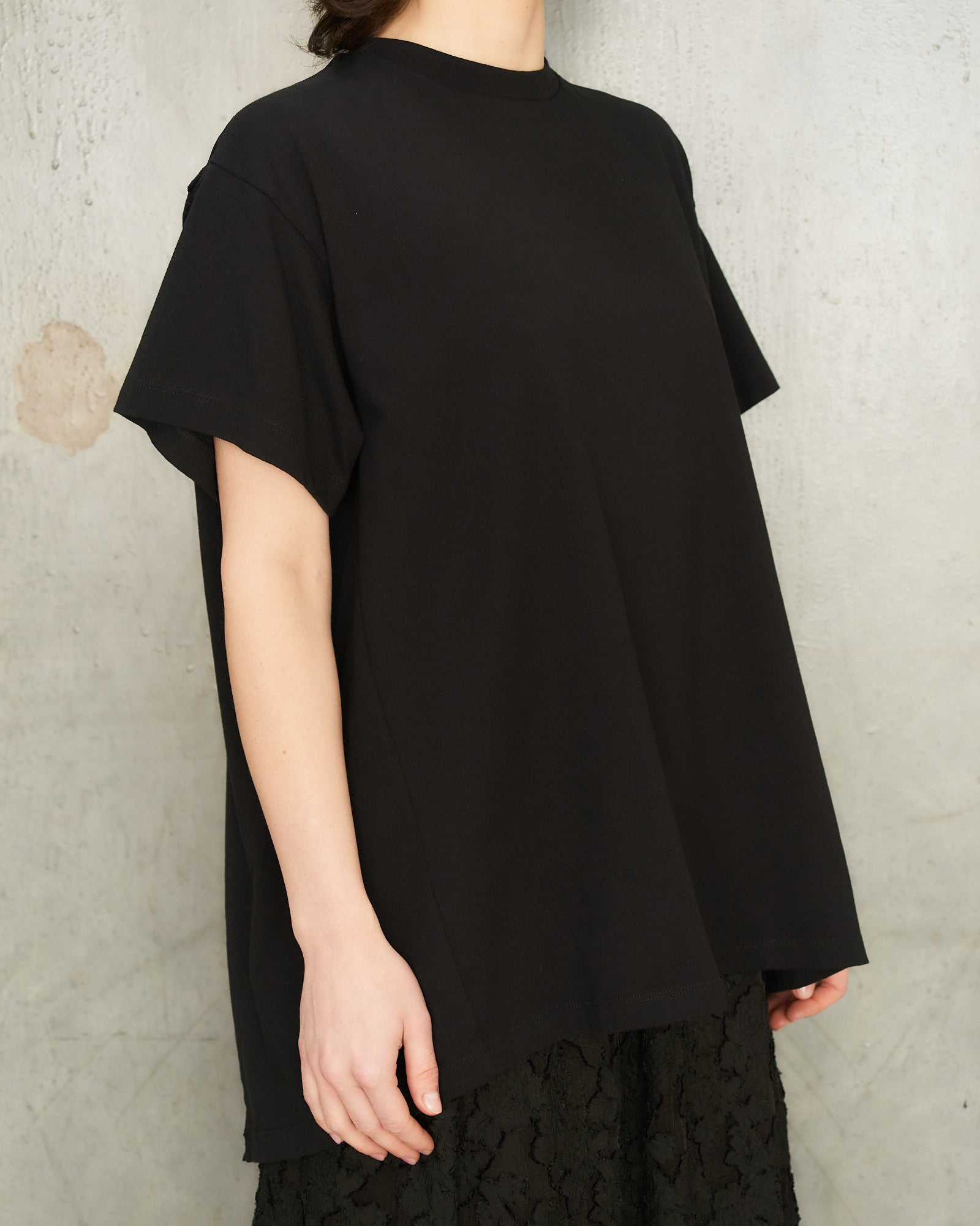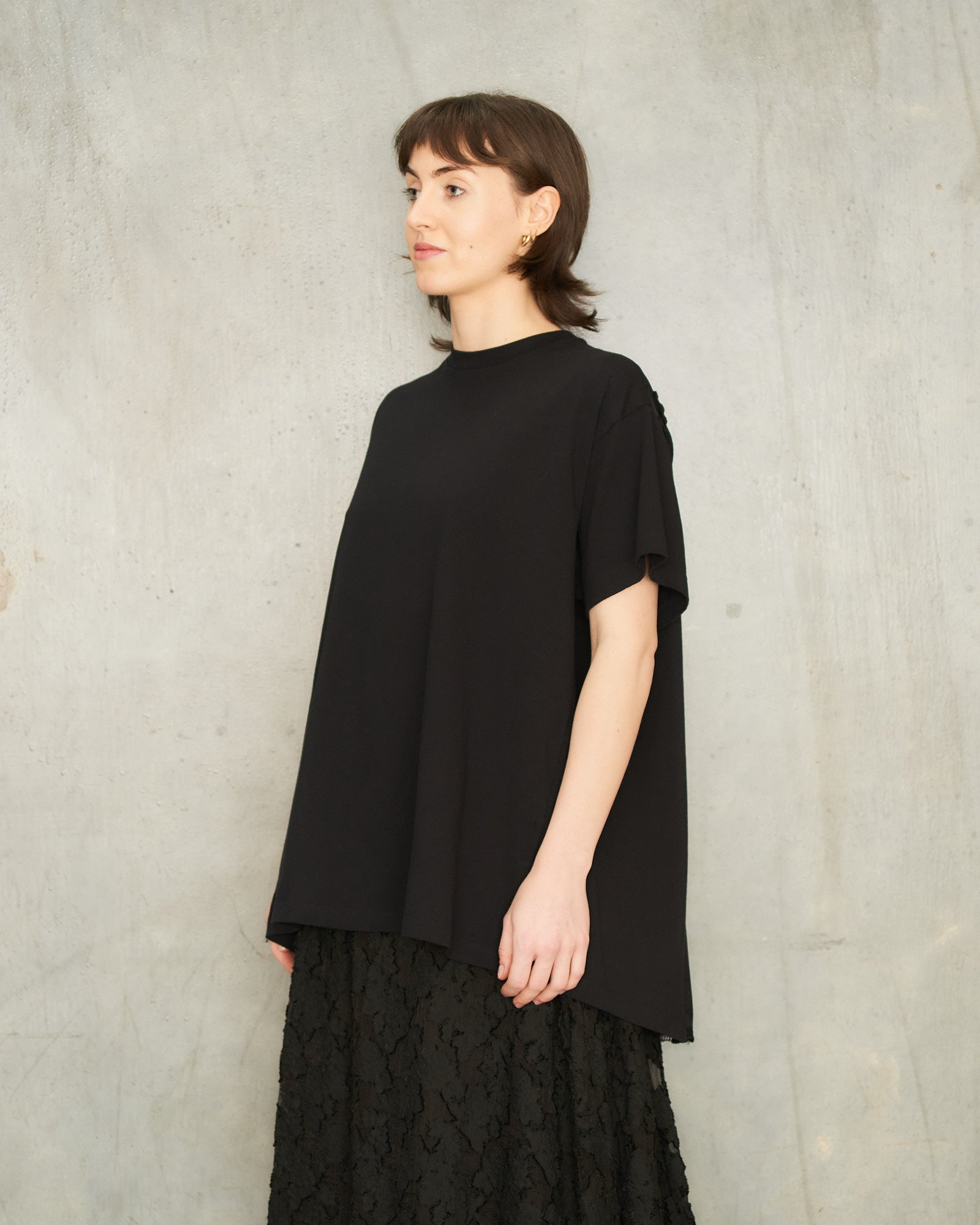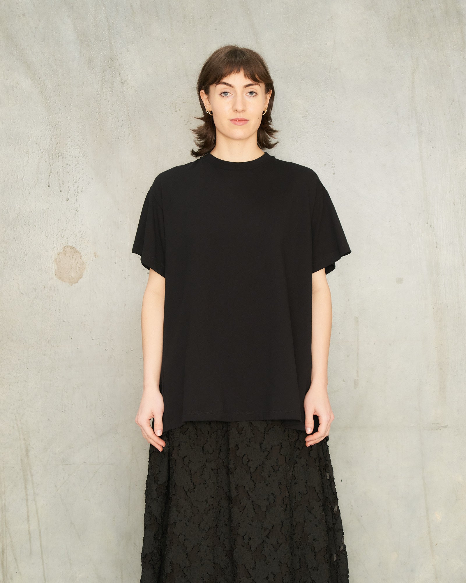 Silk back T-shirt by MM6 Maison Margiela in black. Relaxed cotton crew neck tee with a deconstructed twist - symmetrically spliced at the back and inset with a fluid silky panel. Finished with MM6’s signature white stitch at the nape for a subtle mark of identity.