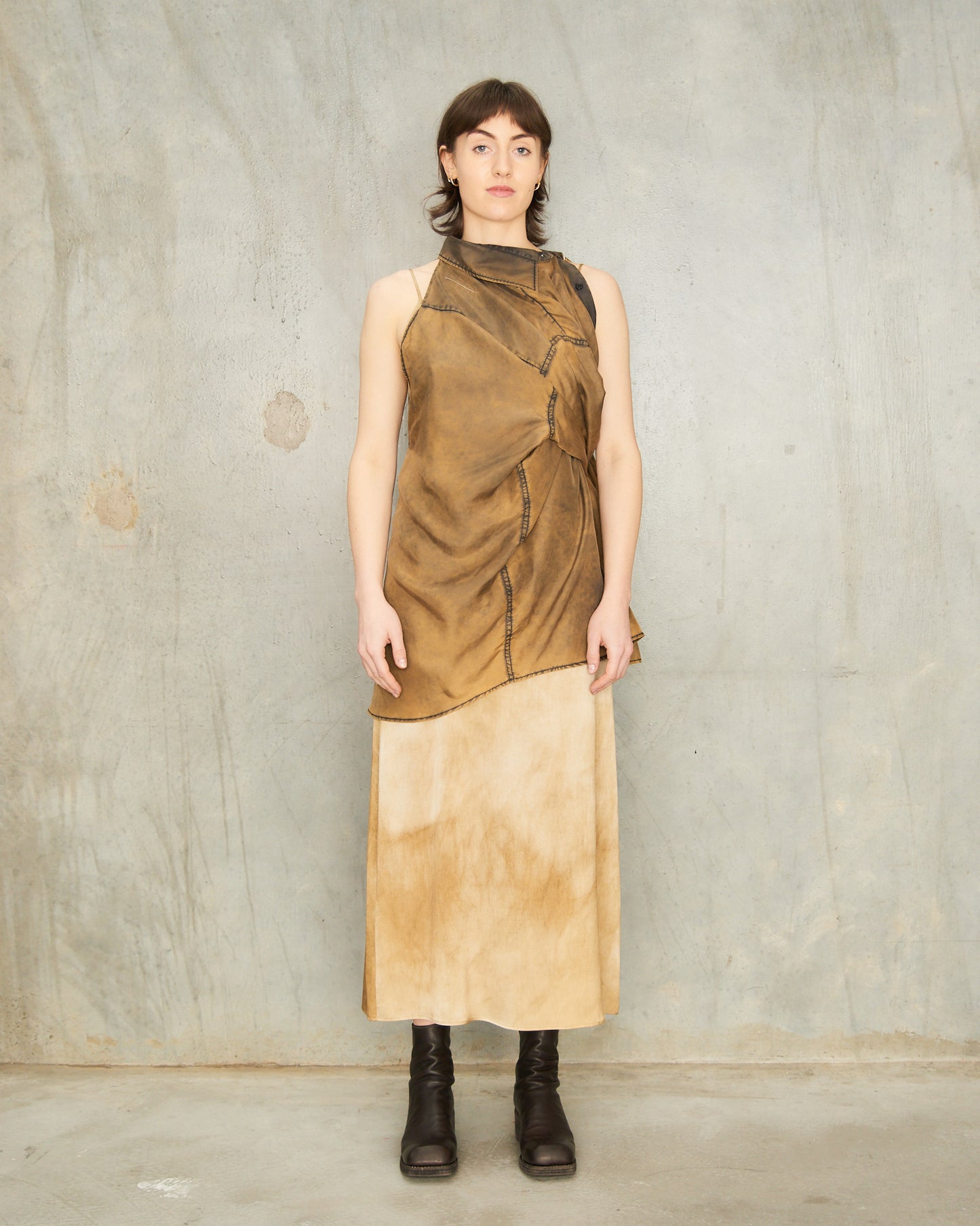 Pictured with Tan Dyed Anaya Dress by Uma Wang and Dark Brown Square Toe Boots by Guidi.