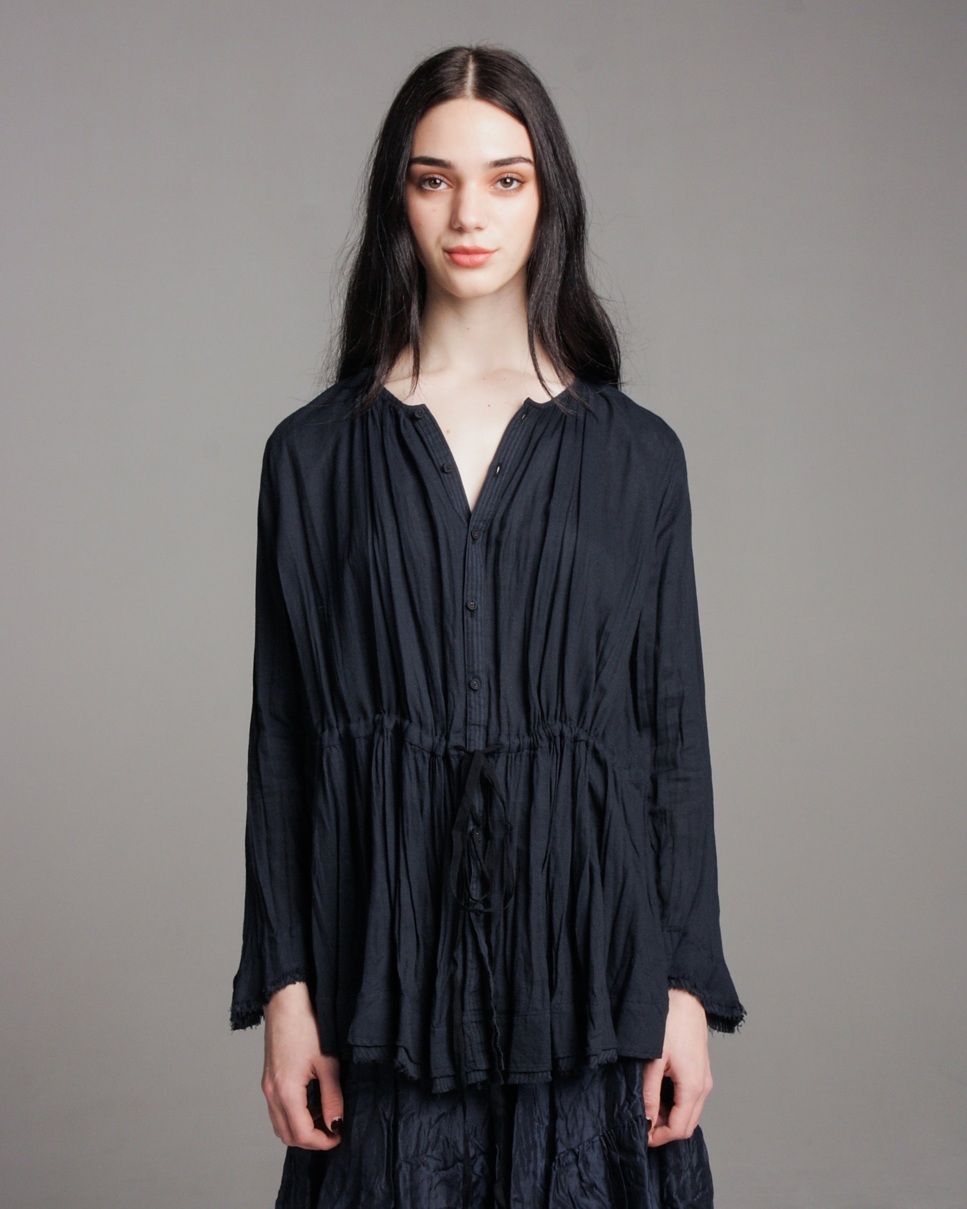 Gathered waist blouse by Pas de Calais in navy. Lightweight, delicate texture of roughly woven cotton. Diagonally cut sleeves finish with fraying extended fringes underneath. Gathered detailing across the collar gives a gently wrinkled look. Long tie to cinch the waist.