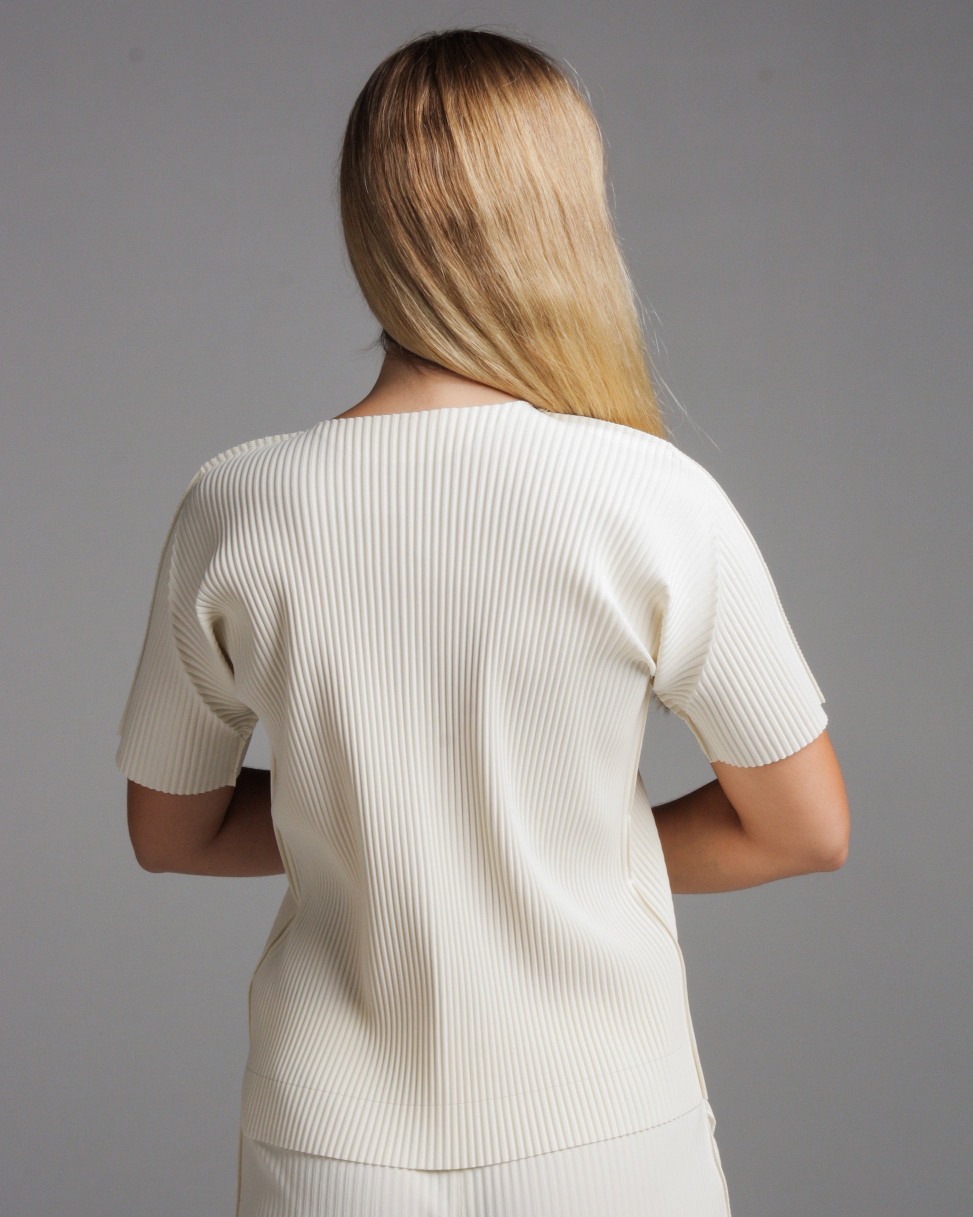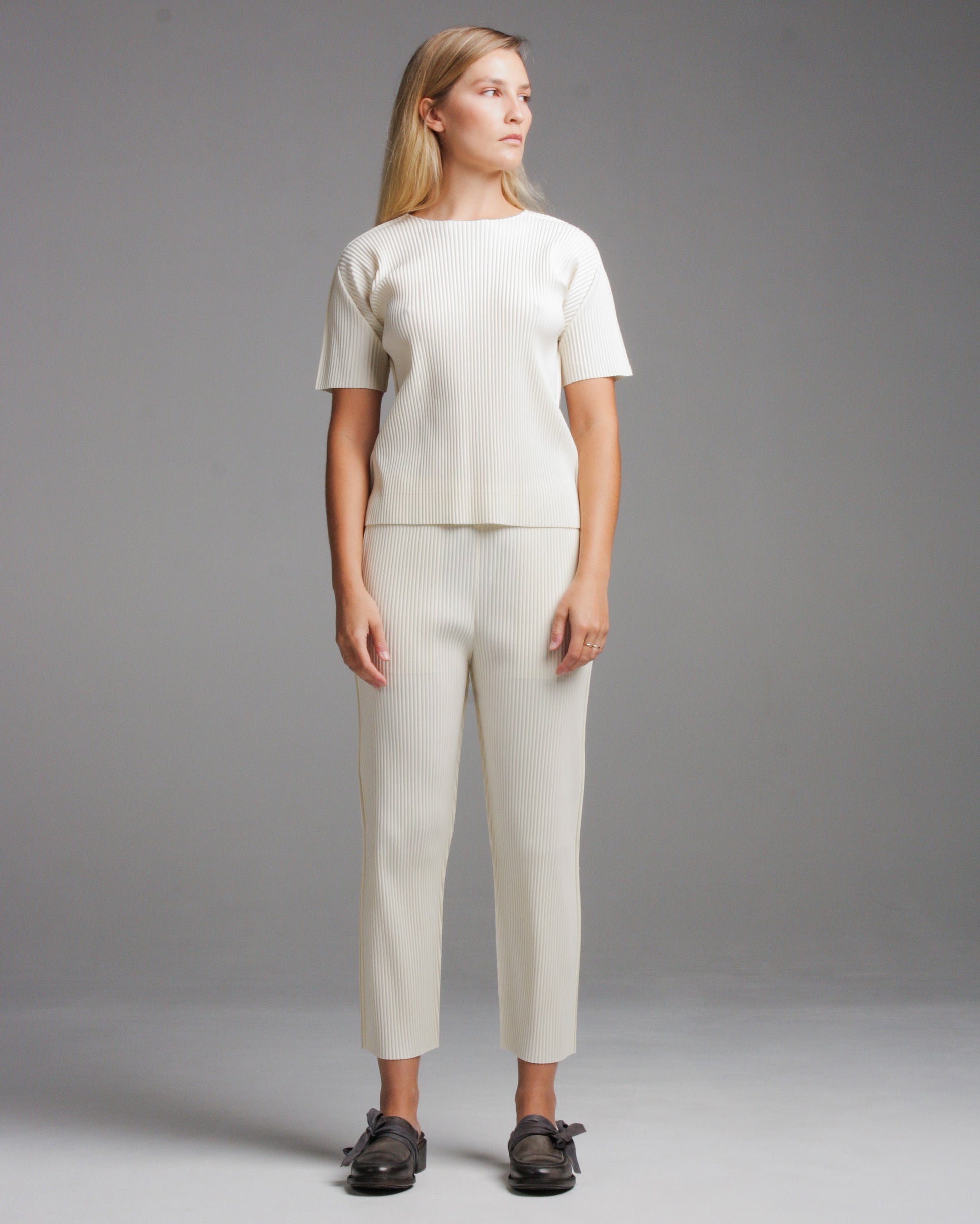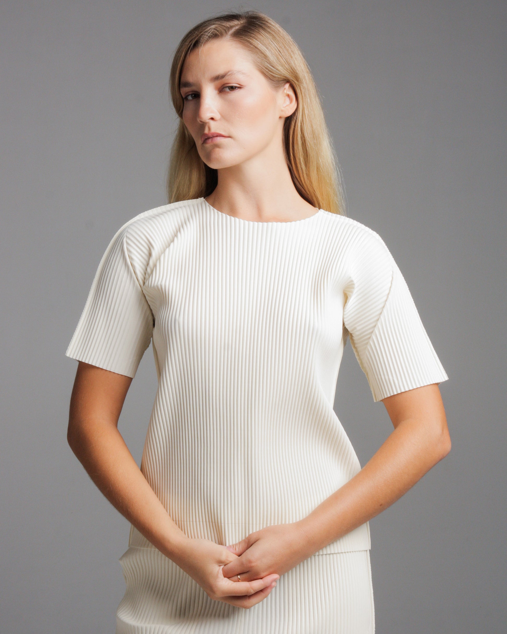 Soft pleated tee by Issey Miyake ME in off white. Classic short sleeve top in regular soft ribbed pleating. Crisp side seams and a vivid ivory white. A clean and textural piece for everyday wear.