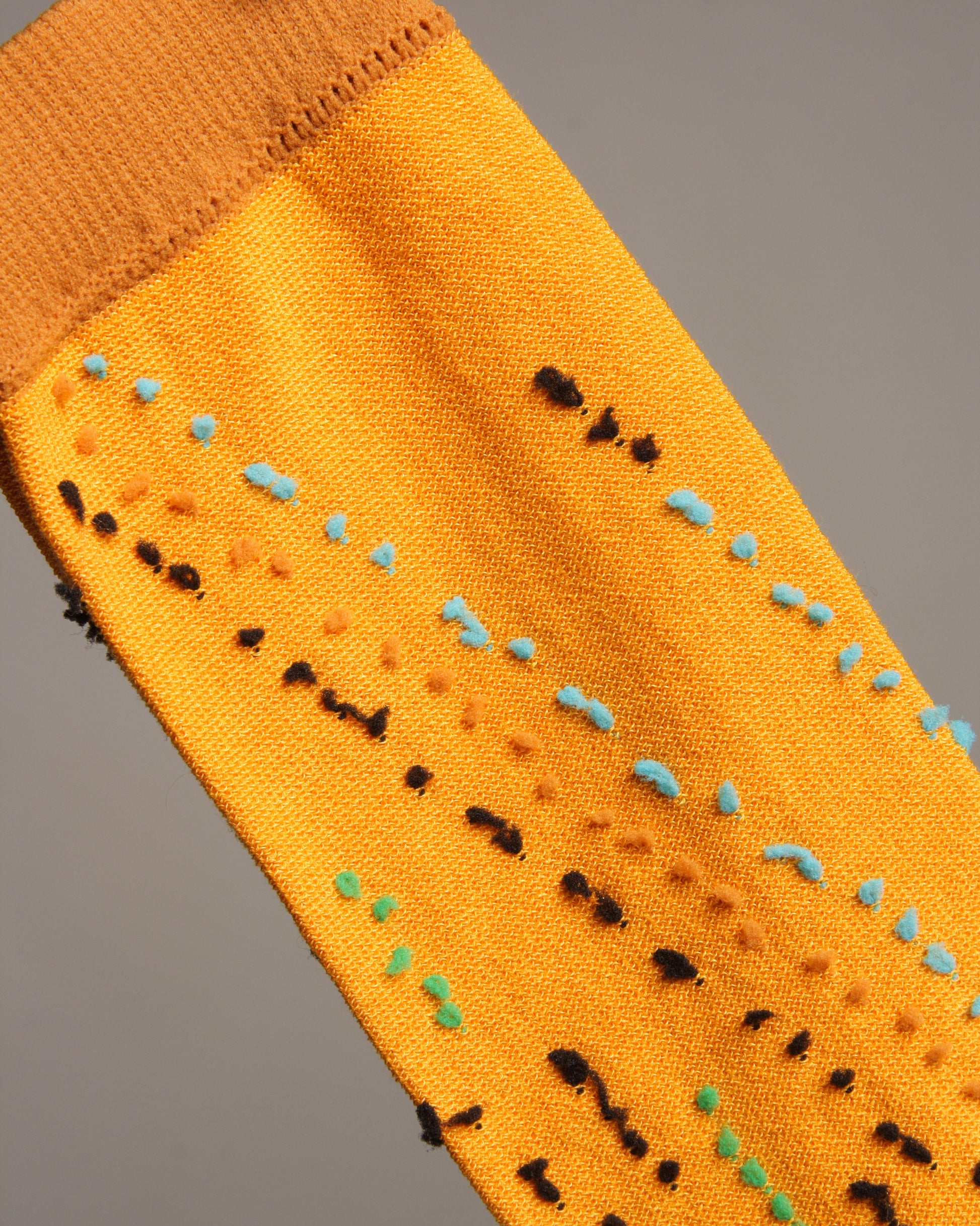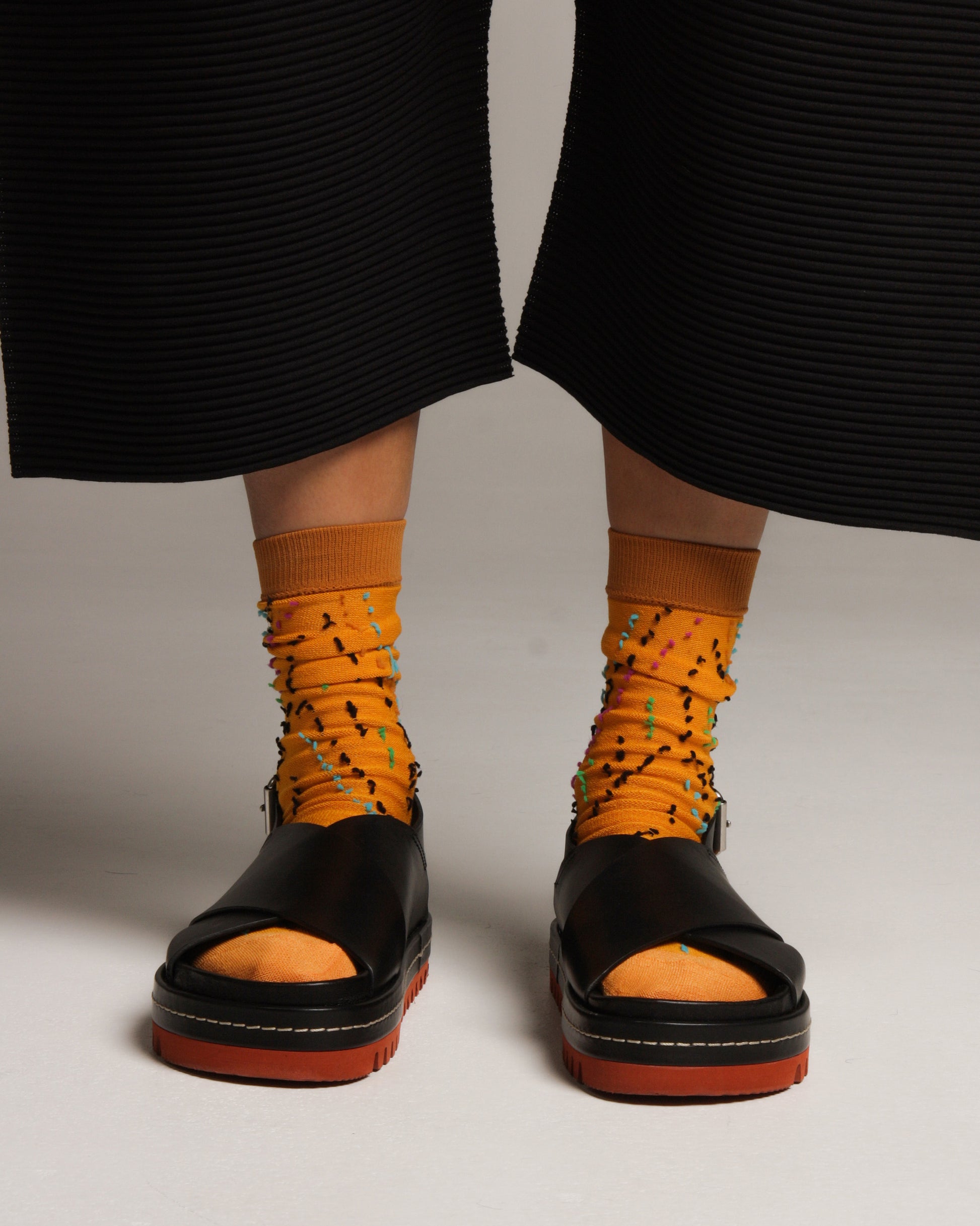 Stitch socks by Issey Miyake ME in orange. Playful feature socks adorned with colourful hand embroidery throughout.