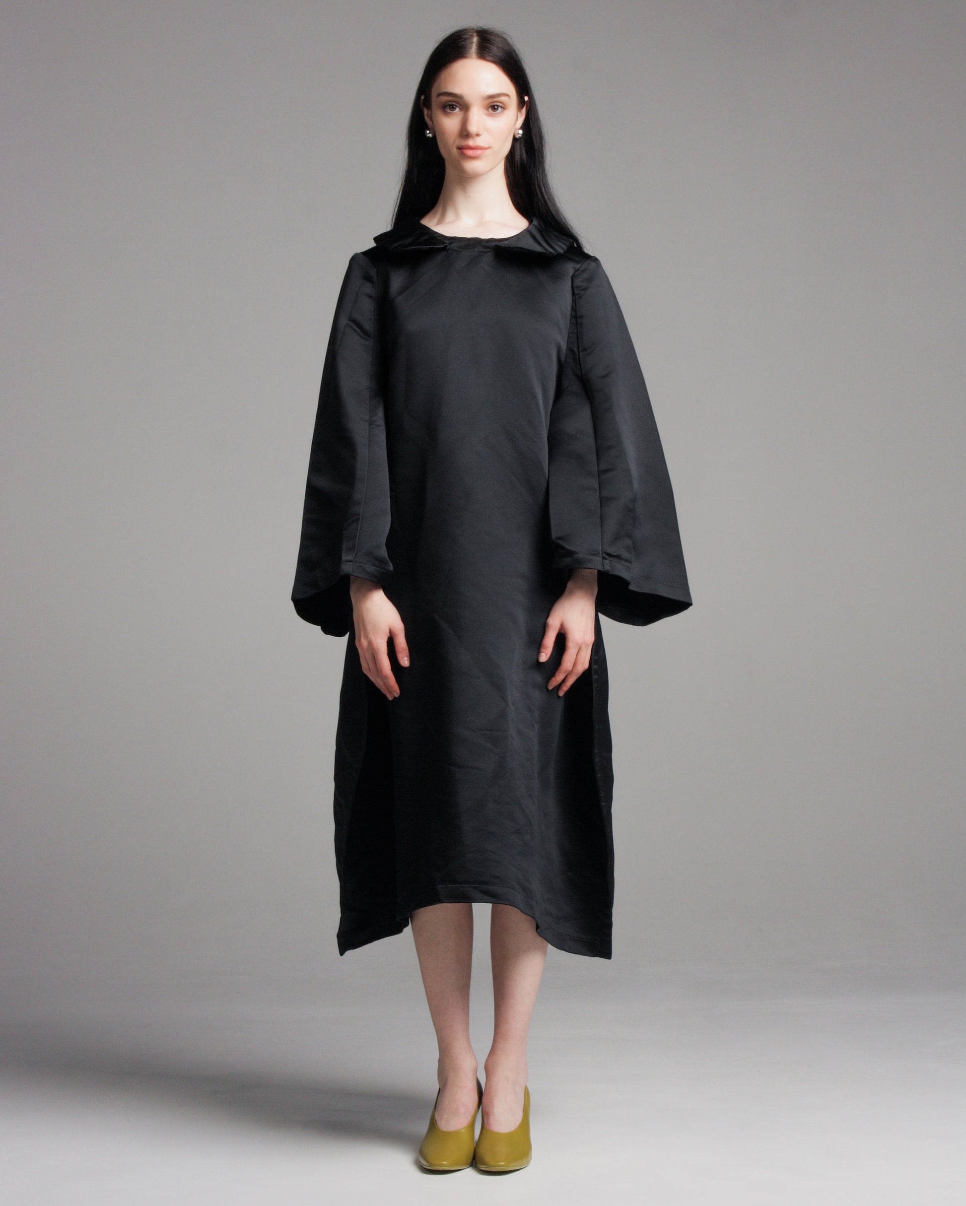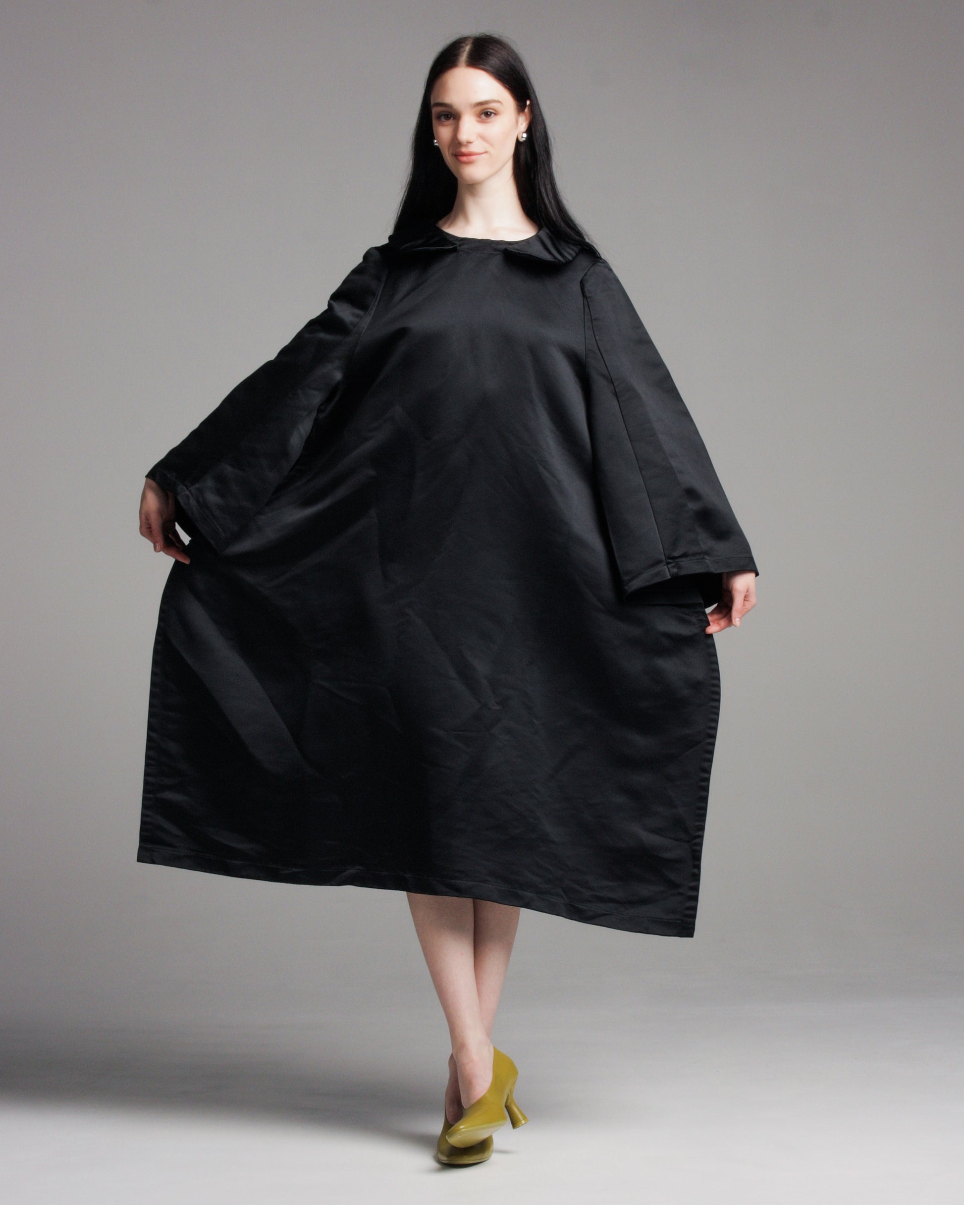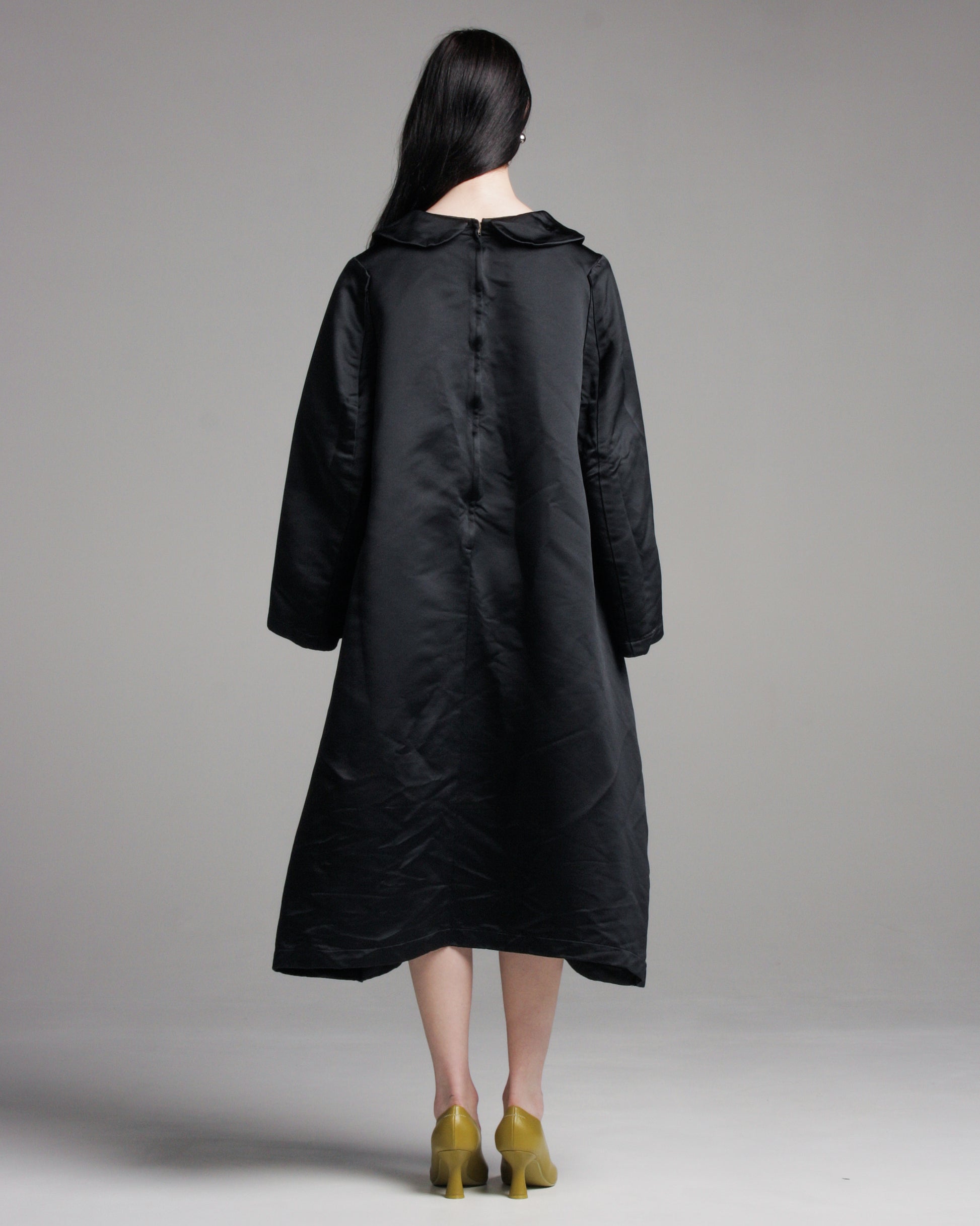 Oversized dress by Comme des Garçons Comme des Garçons. Thick satiny fabrication. Characteristic ballooning silhouette distorts the body shape in signature Comme fashion. Rounded collar and rear zip fastening.