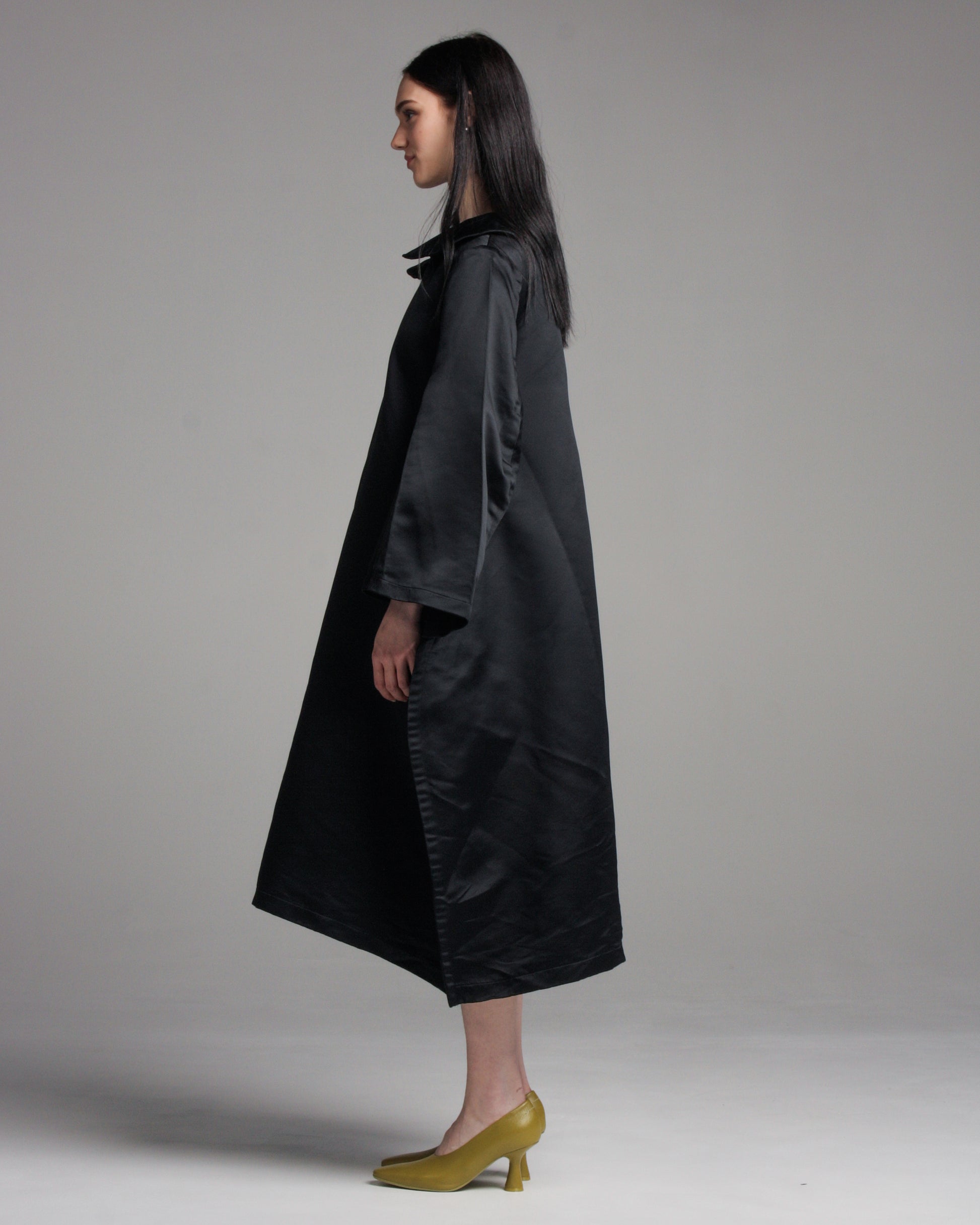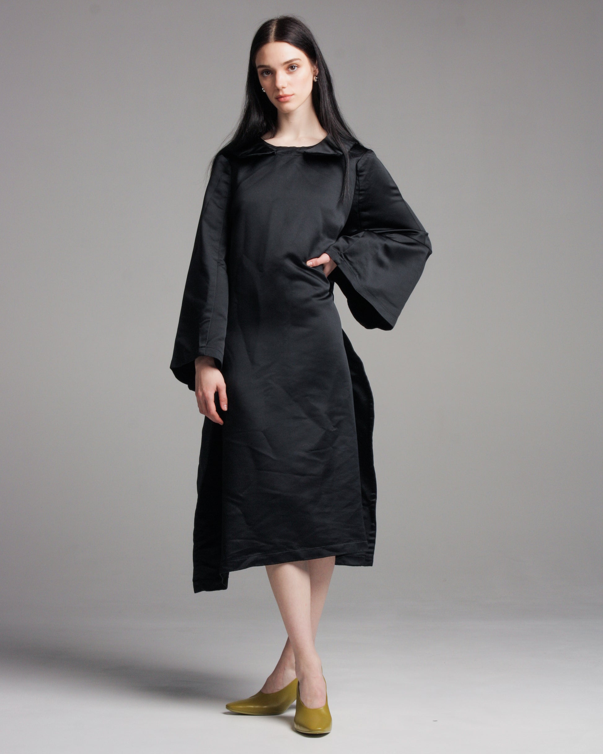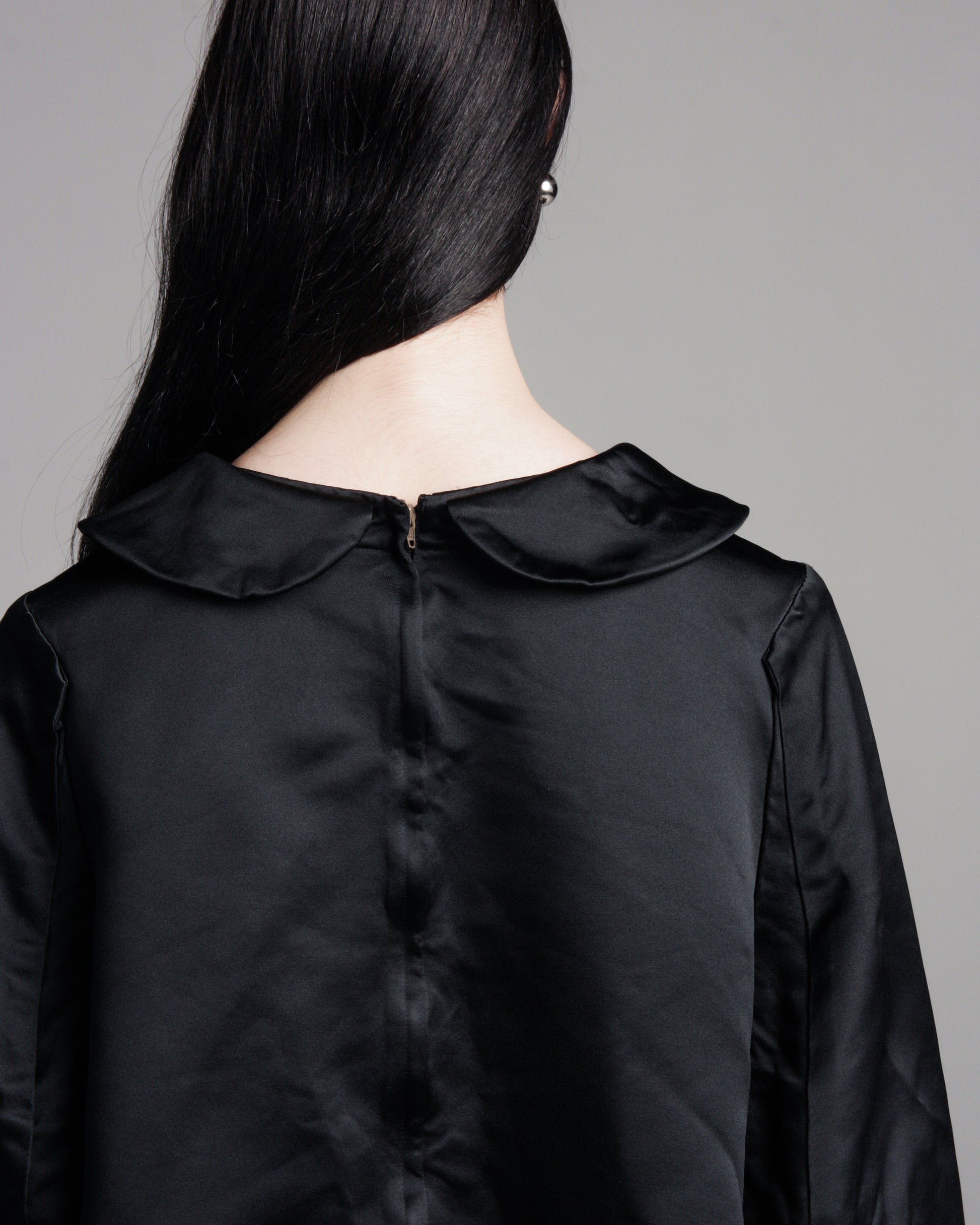 Oversized dress by Comme des Garçons Comme des Garçons. Thick satiny fabrication. Characteristic ballooning silhouette distorts the body shape in signature Comme fashion. Rounded collar and rear zip fastening.