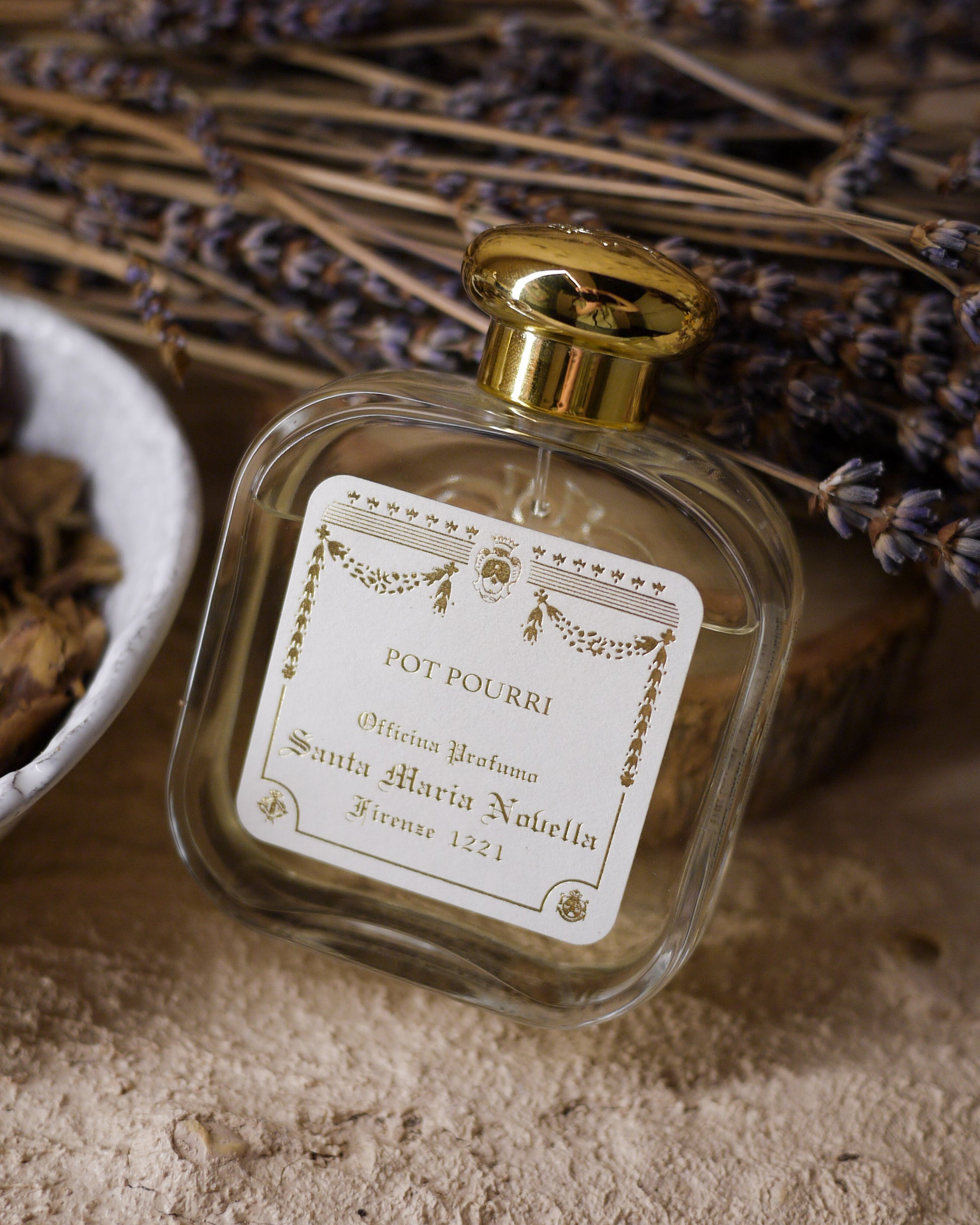 Pot Pourri Eau de Cologne by Santa Maria Novella. This cologne recalls the aromas of buds, leaves and flower petals characteristic of the Tuscan hills.