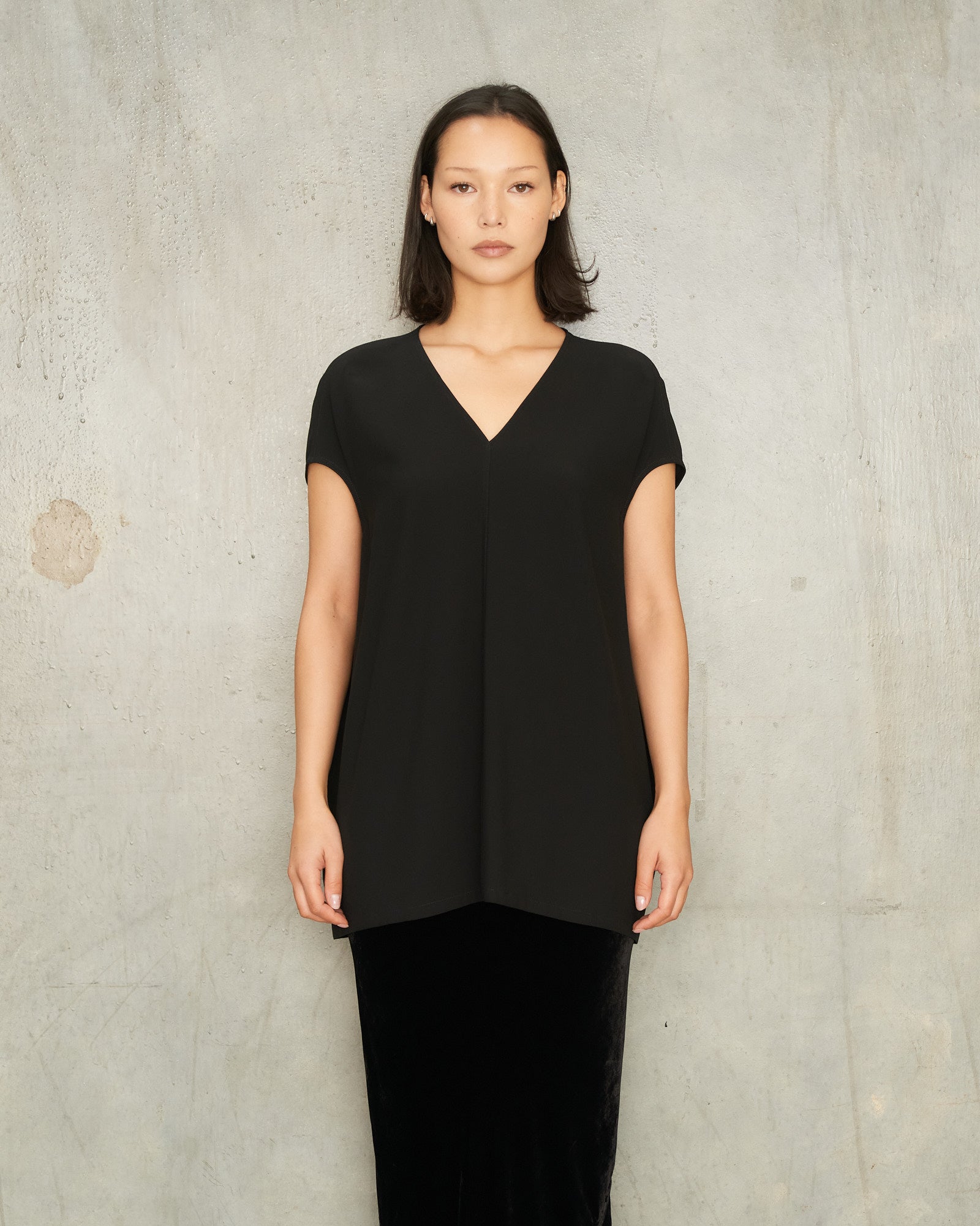 V-neck floating top by Rick Owens in black. Bias-cut panels converge along a central seam, falling fluidly from a plunging V-neckline. Finished with subtle cap sleeves for a statuesque silhouette.