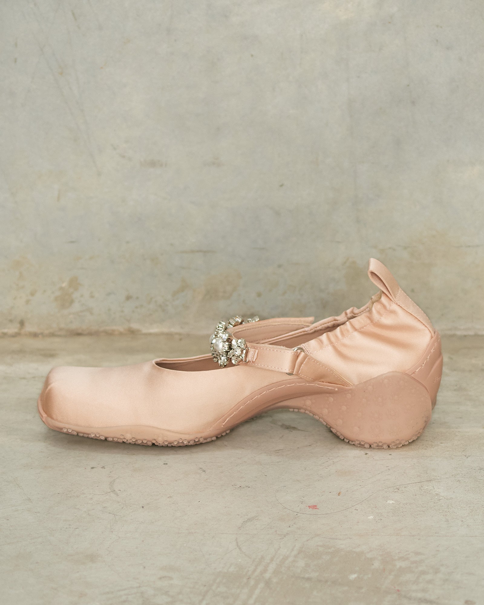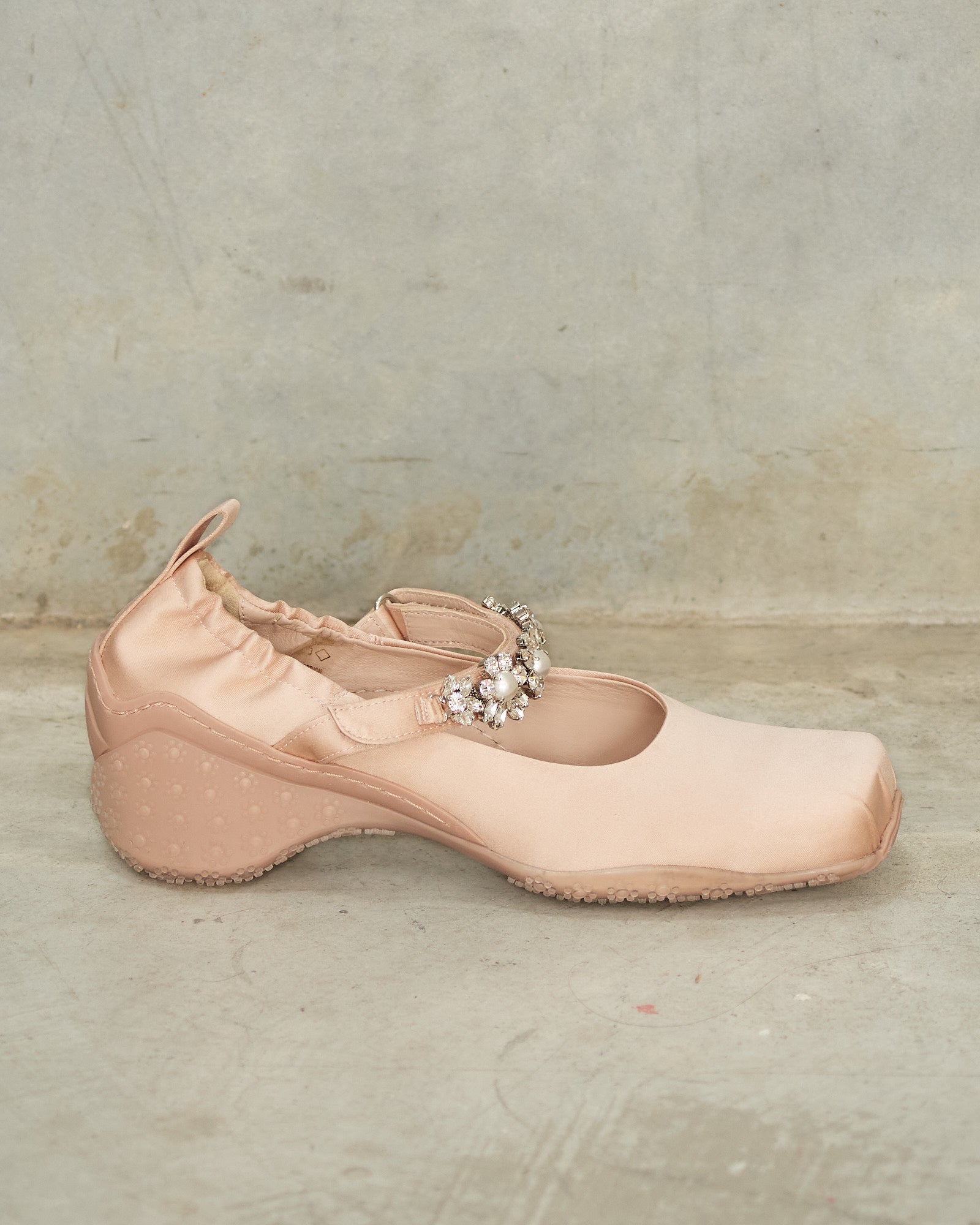 Embellished ballet runners by Simone Rocha in nude. Drawing inspiration from classic ballet shoes, featuring a pleated toe box and embellished strap fastening. Daisy-embossed soles provide a lifted heel with a sporty feel.