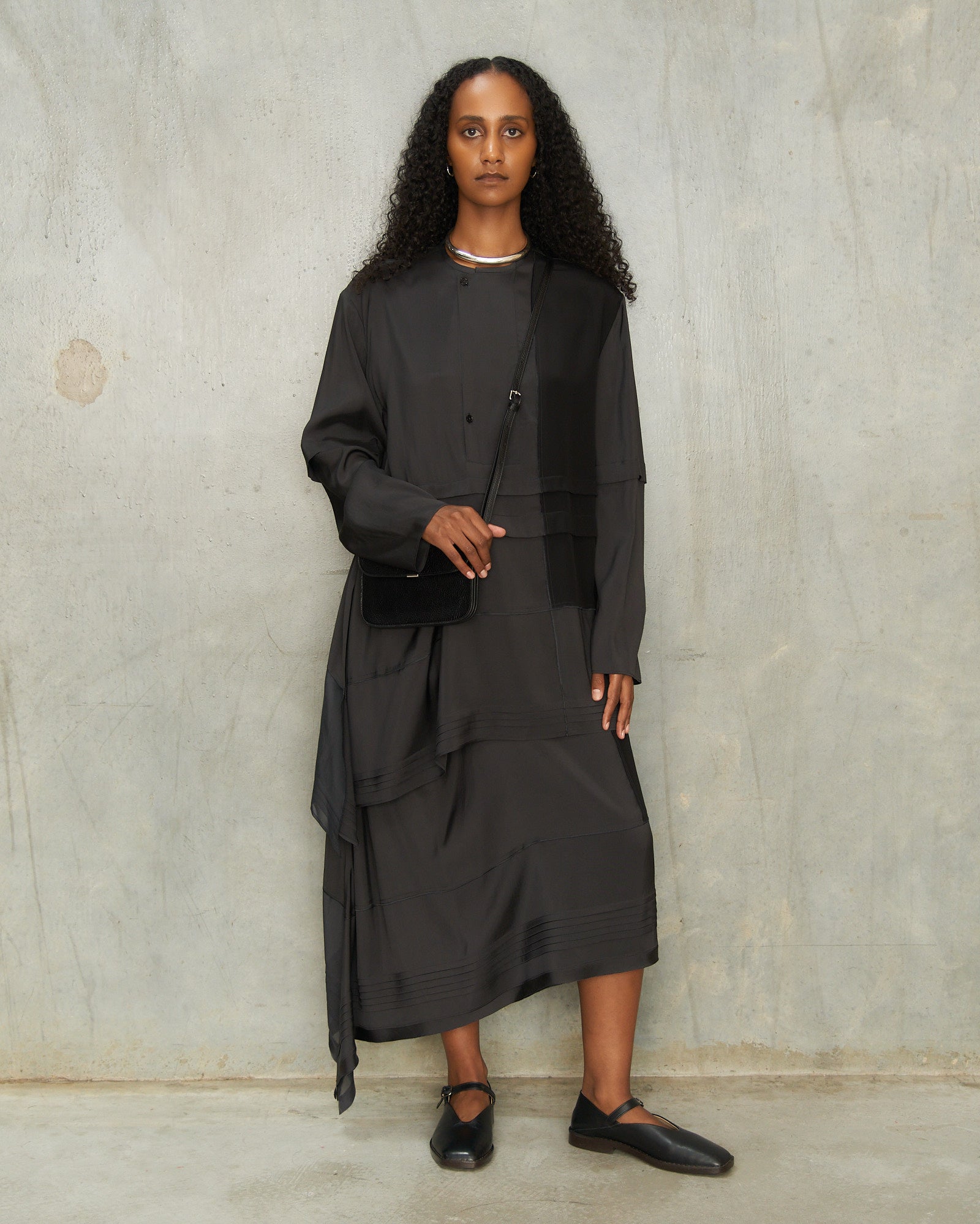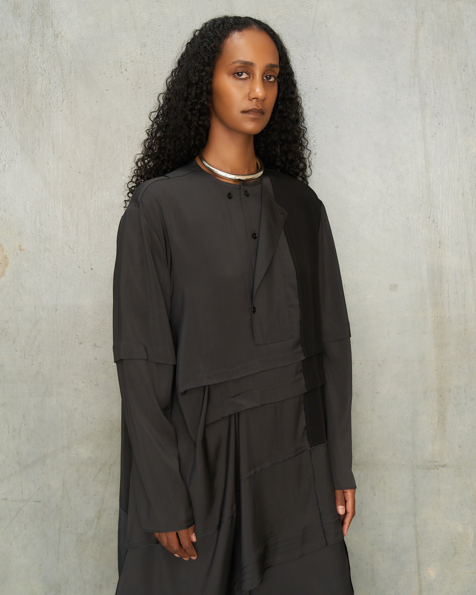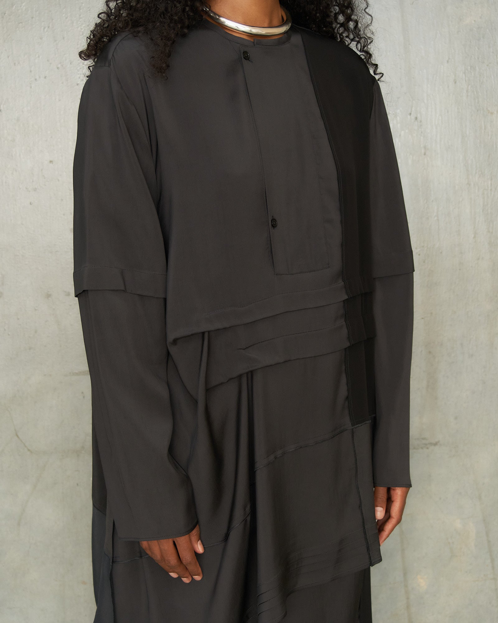 Pleated blouse by Lemaire in slate grey. Long-sleeve blouse crafted from layered panels of silk and crepe de chine, arranged in an asymmetric patchwork. Soft pleats emerge through the draped construction to lend lightness and movement.