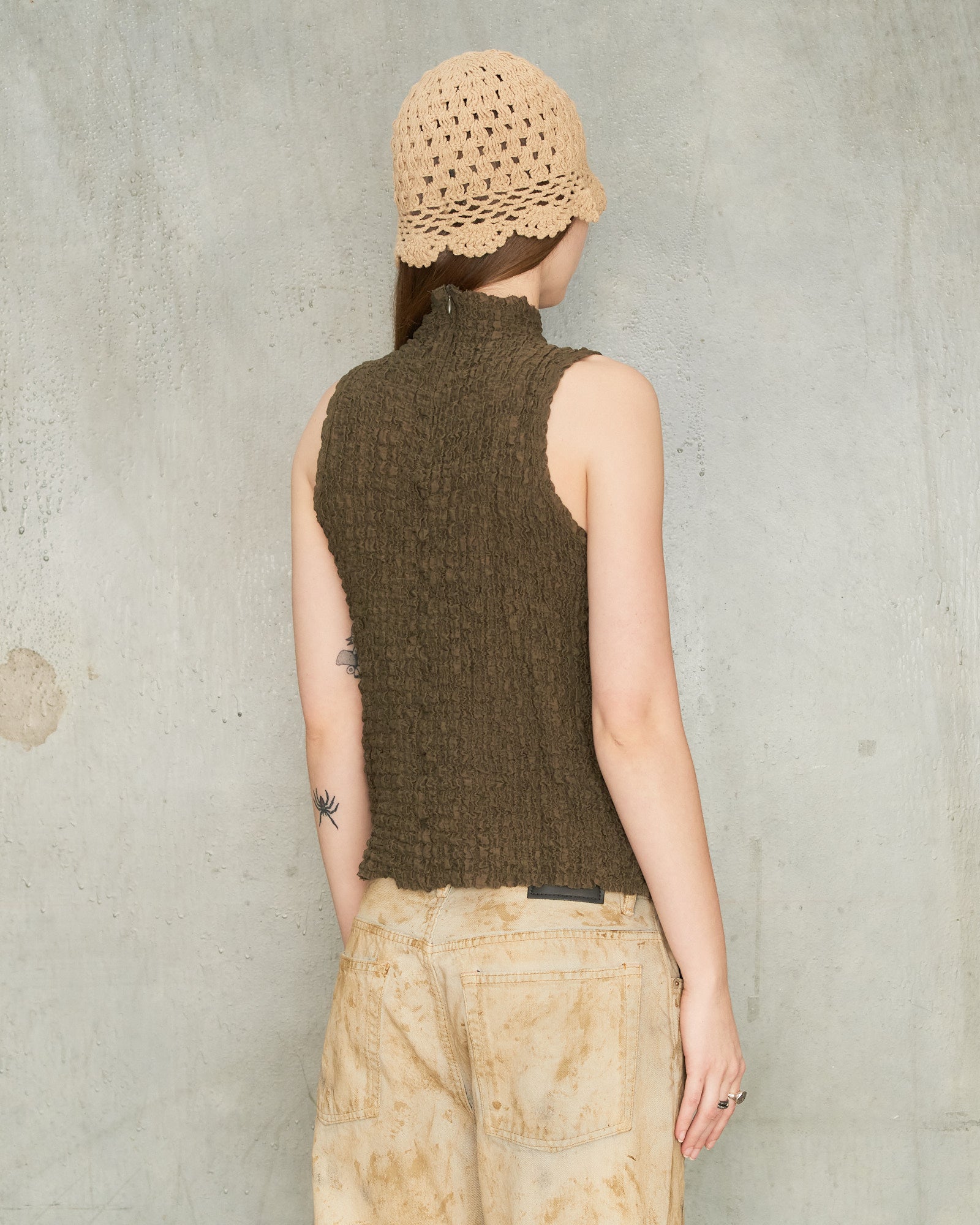 Popcorn tank by Song for the Mute in army green. A minimal silhouette elevated by distinctive scrunched texture. Gently lifted neckline with invisible rear zip fastening.