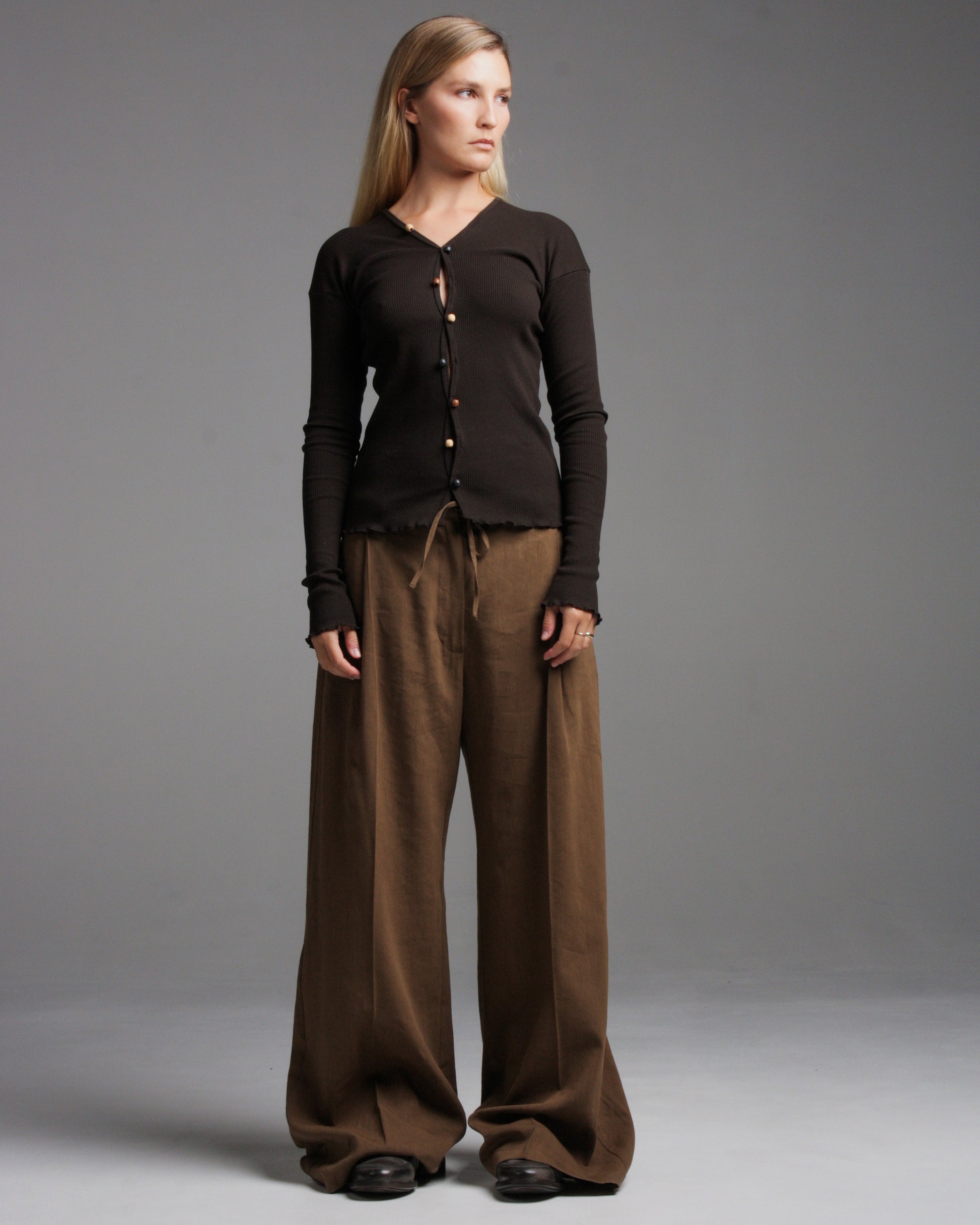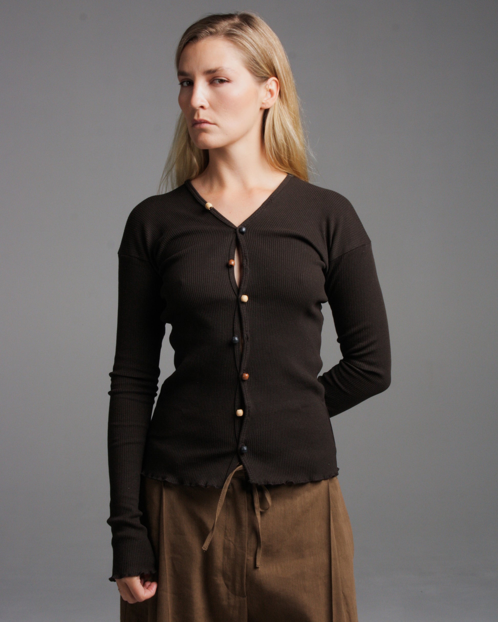 Tav cardigan by Baserange in fovea dark brown. Mirrored design from back to front, with wooden bead closure encircling the entire piece to accomodate flexible levels of openness. Fine ribbed cotton provides excellent fit and comfort, wears simply as a cardigan or an intimately stylish top.