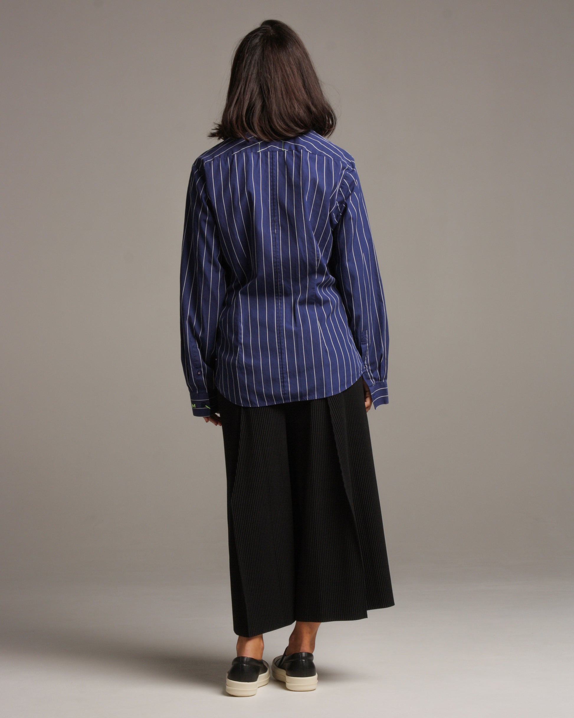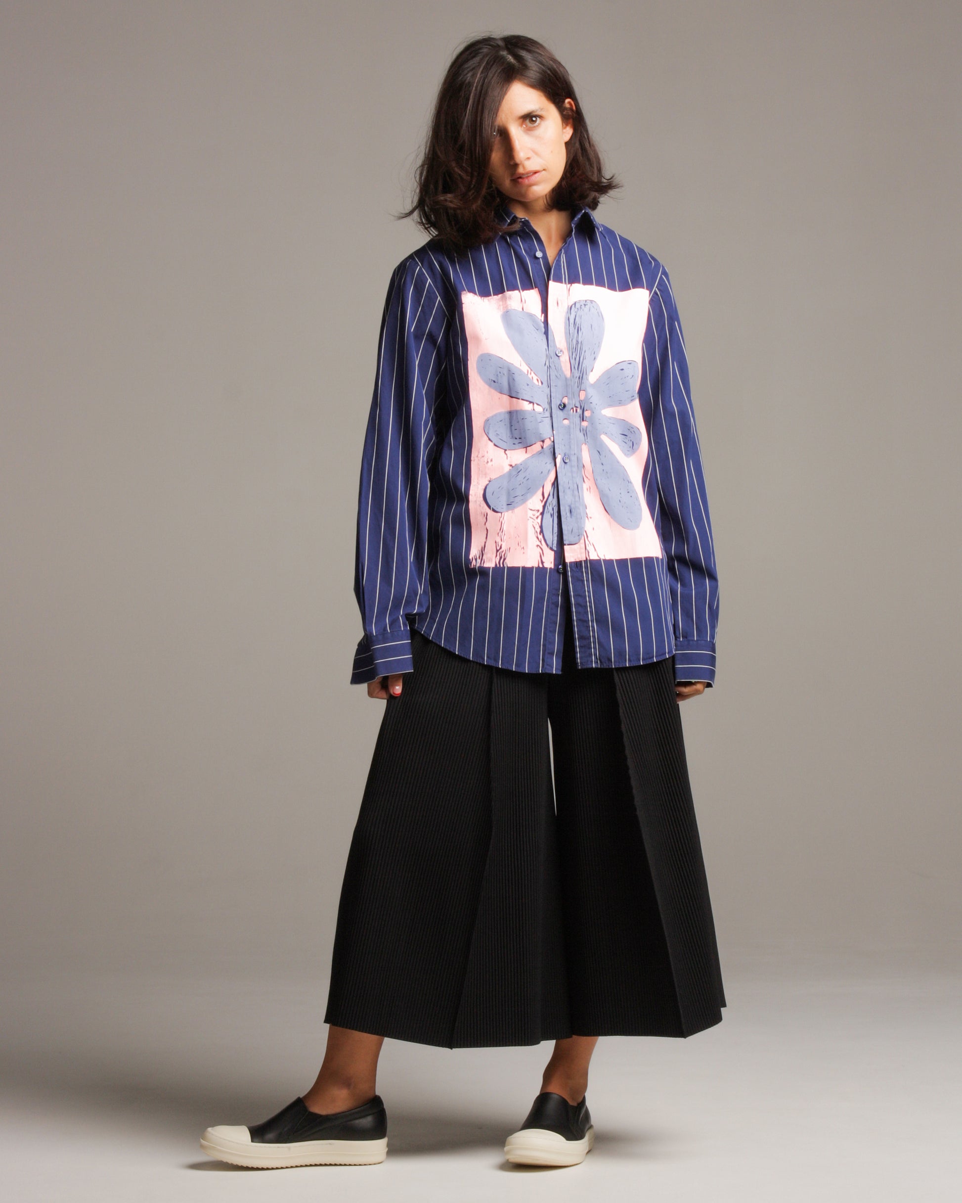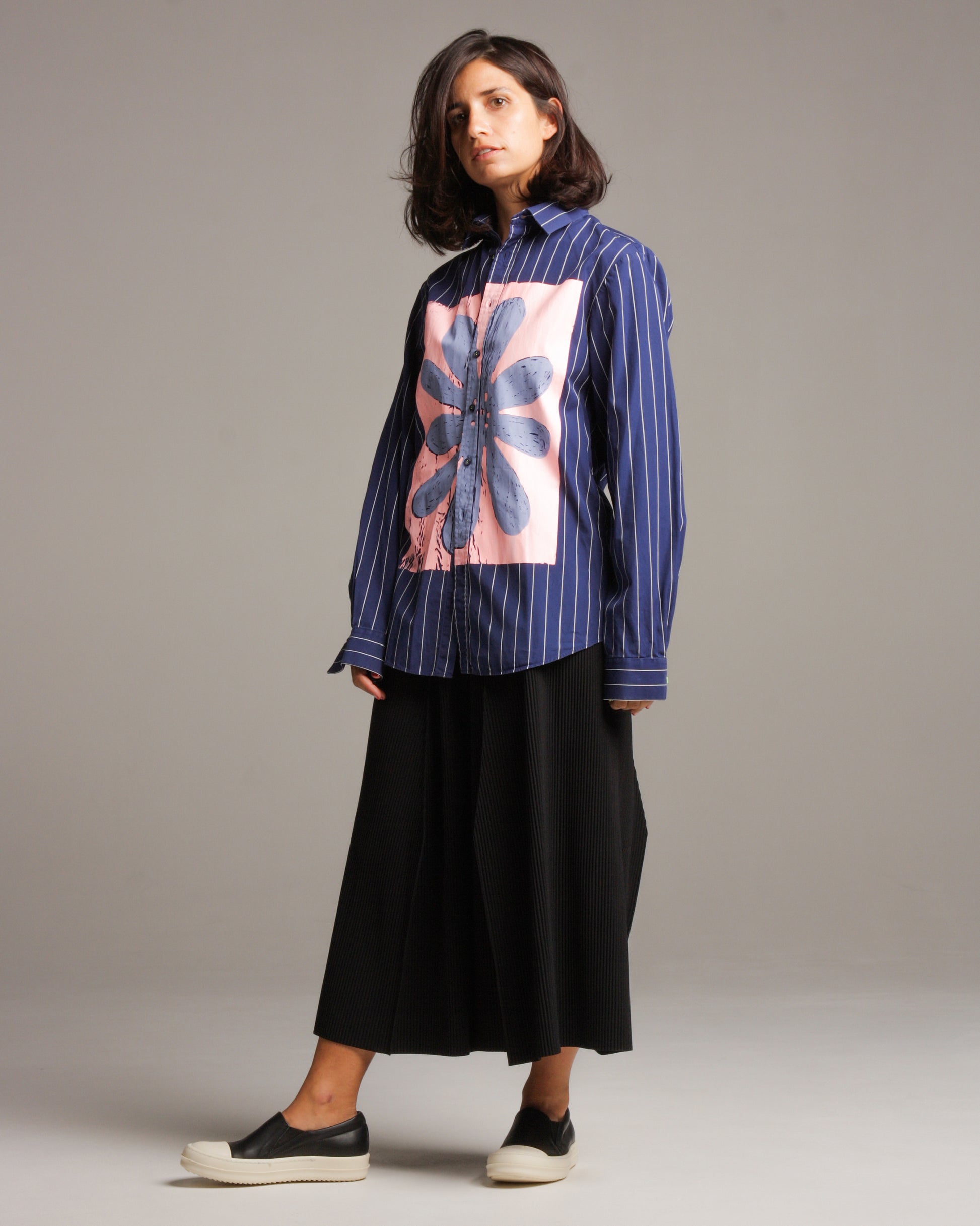 "Tom" shirt by Mariaan Pugh in navy and white stripe with pale pink and lilac flower screen print.