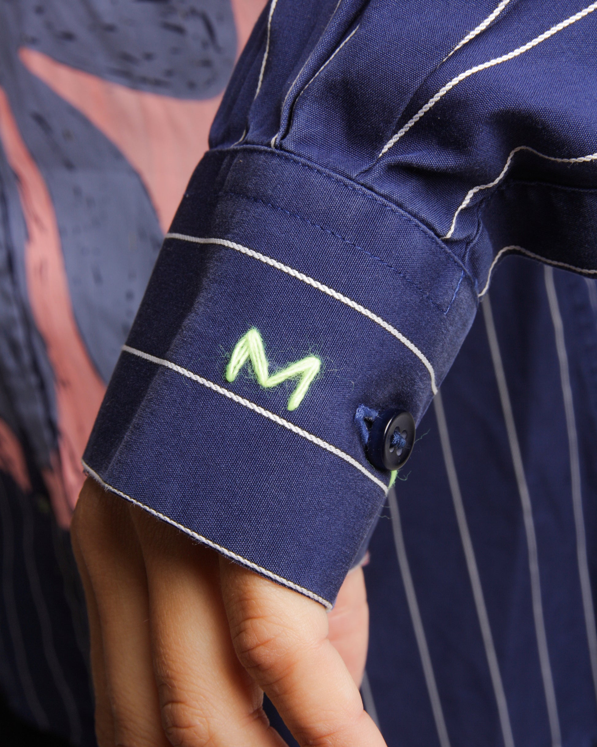 Mariaan Pugh creates her vibrant, one-of-a-kind "Shirts for Friends" by repurposing classic men's shirting sourced from local op shops. Each shirt has its buttons removed and reattached with signature acid-yellow stitching, and labels replaced with yellow ribbons. The flower motif is screen printed by Mariaan herself, using print dyes recycled from her studios at North Metropolitan TAFE.