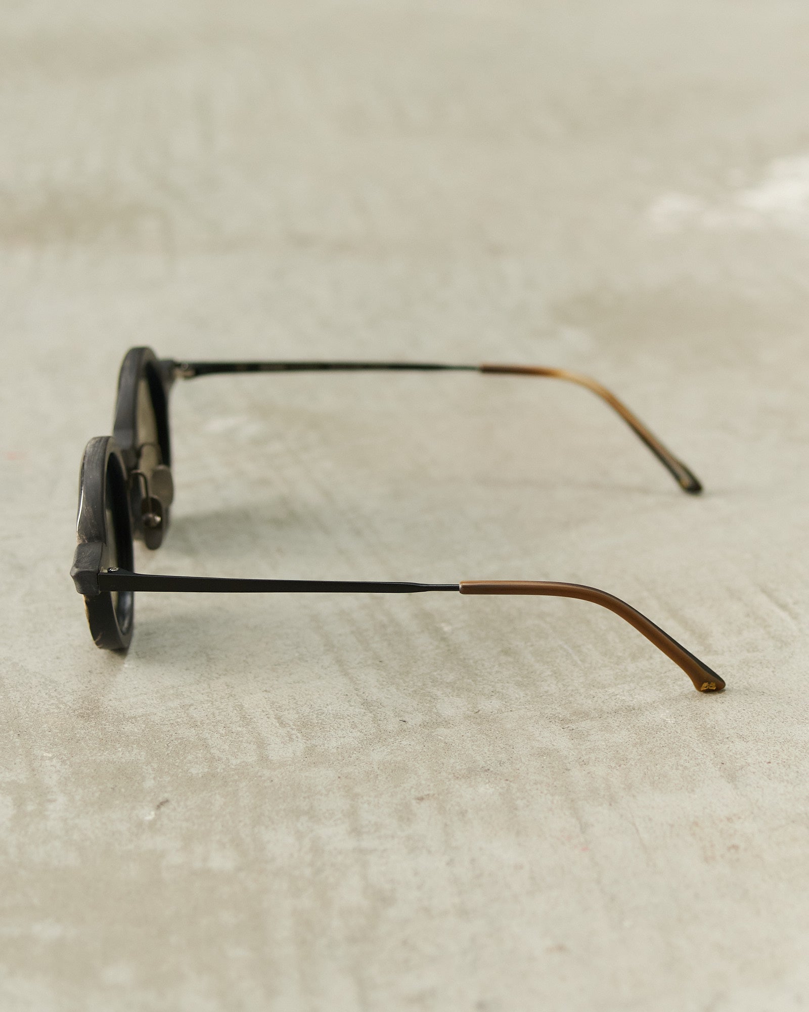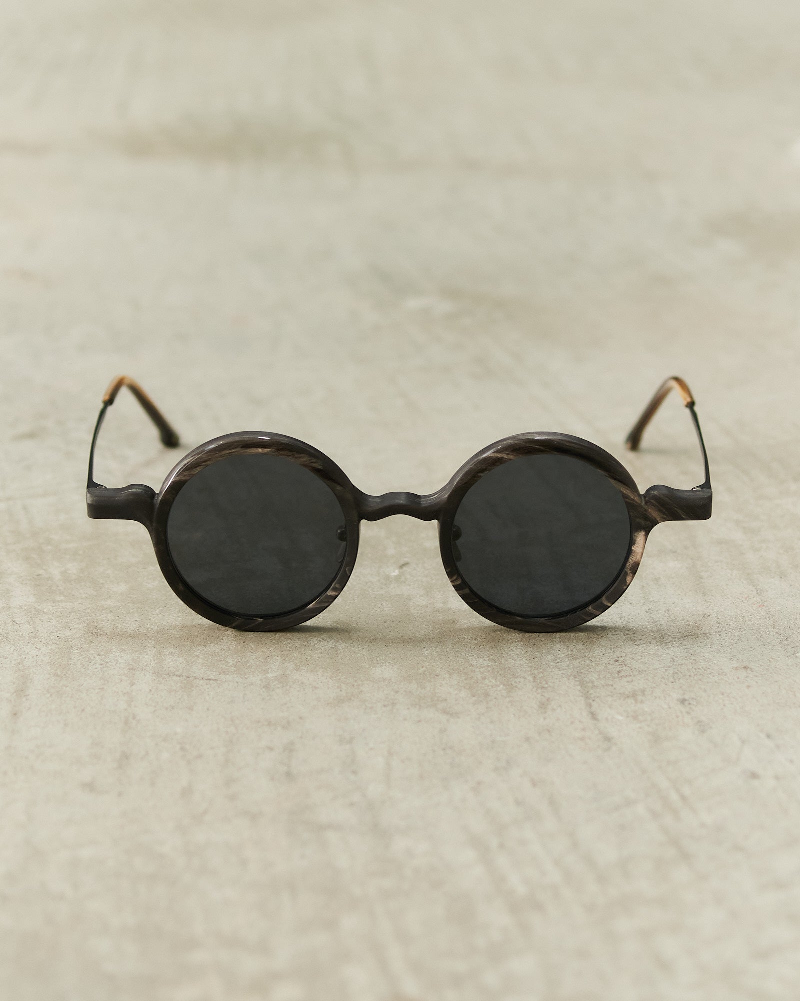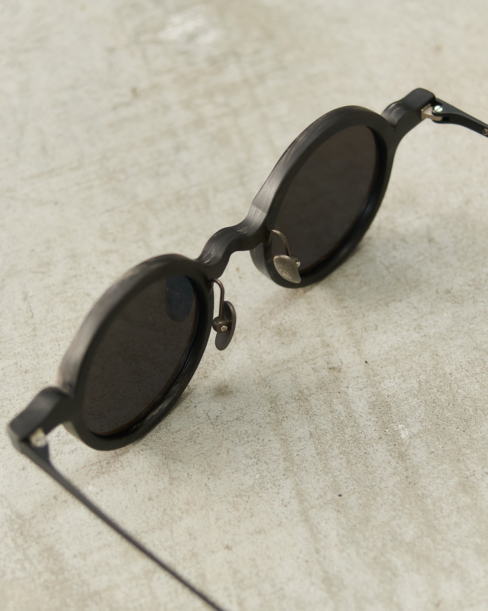 Twist sunglasses by Uma Wang in black. In collaboration with Rigards. Round nylon lenses set within marbled black rims, complemented by a slender titanium frame.