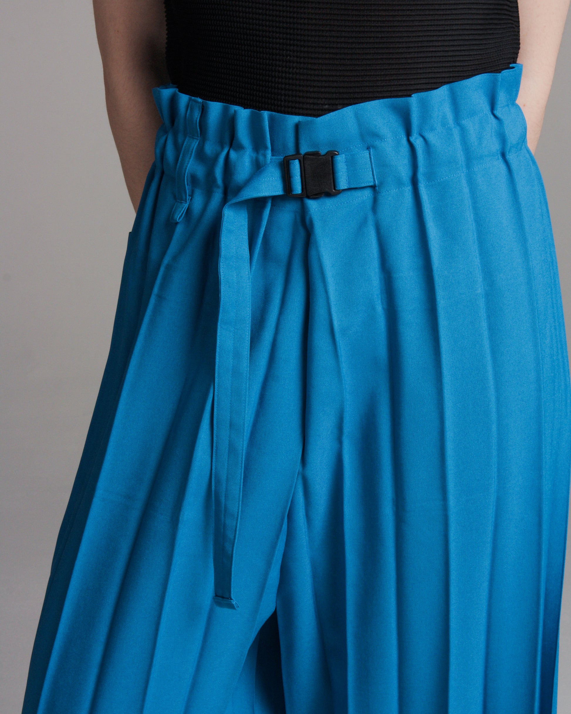 Wide pleated pants by Issey Miyake ME in blue. Lightweight and breezy with a cropped leg, given form by signature wide accordion pleating for textural interest. Adjustable waistband with buckle fastening detail observes a utilitarian aesthetic. Wear simply and casually without thought.