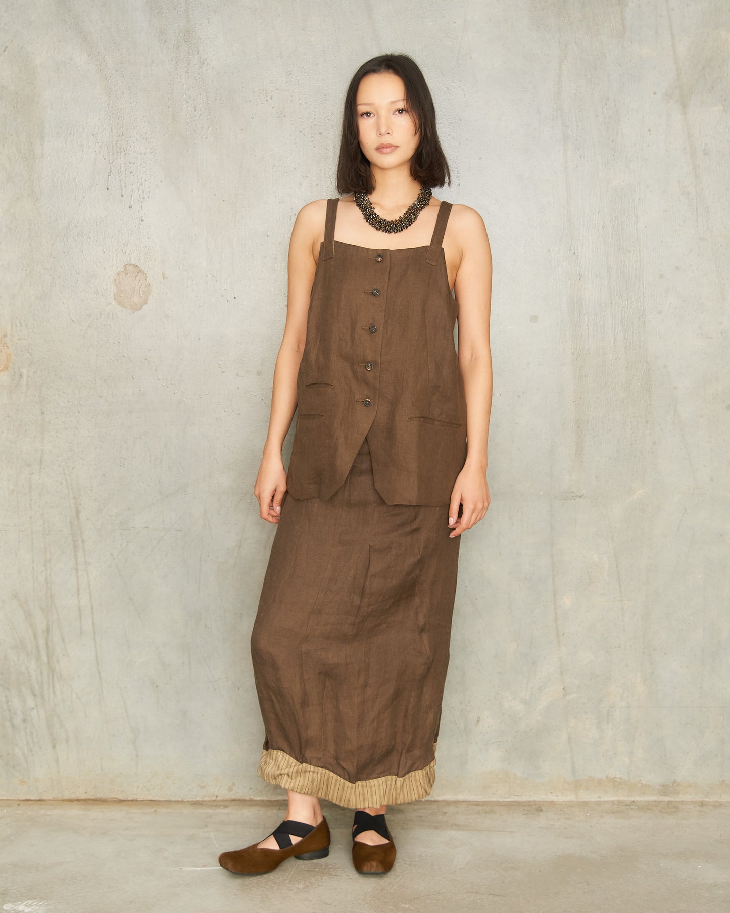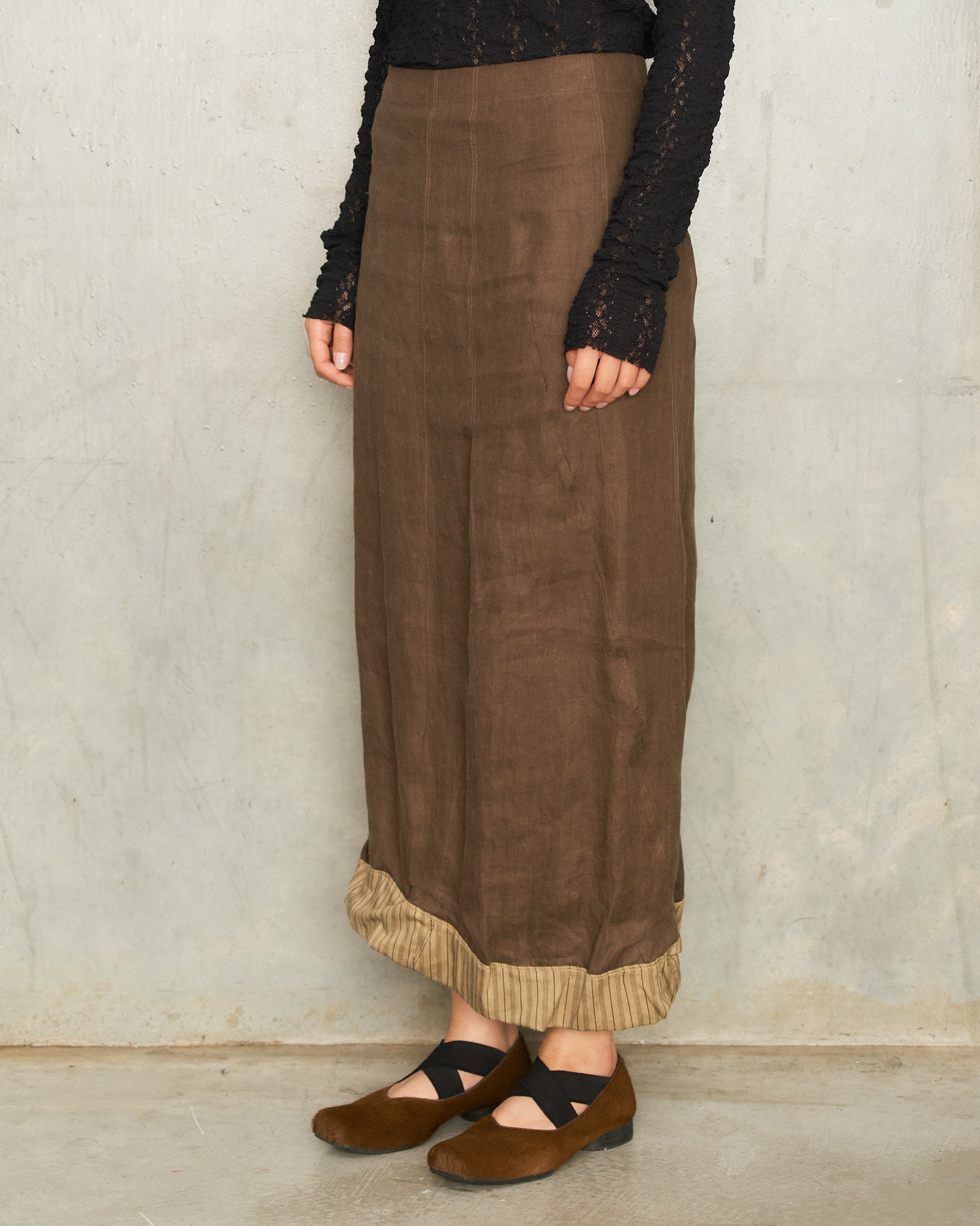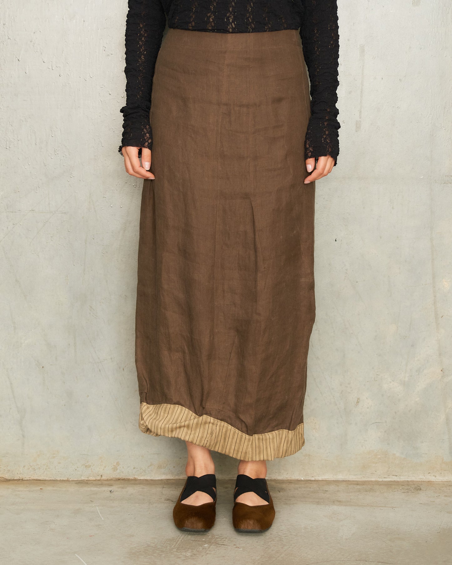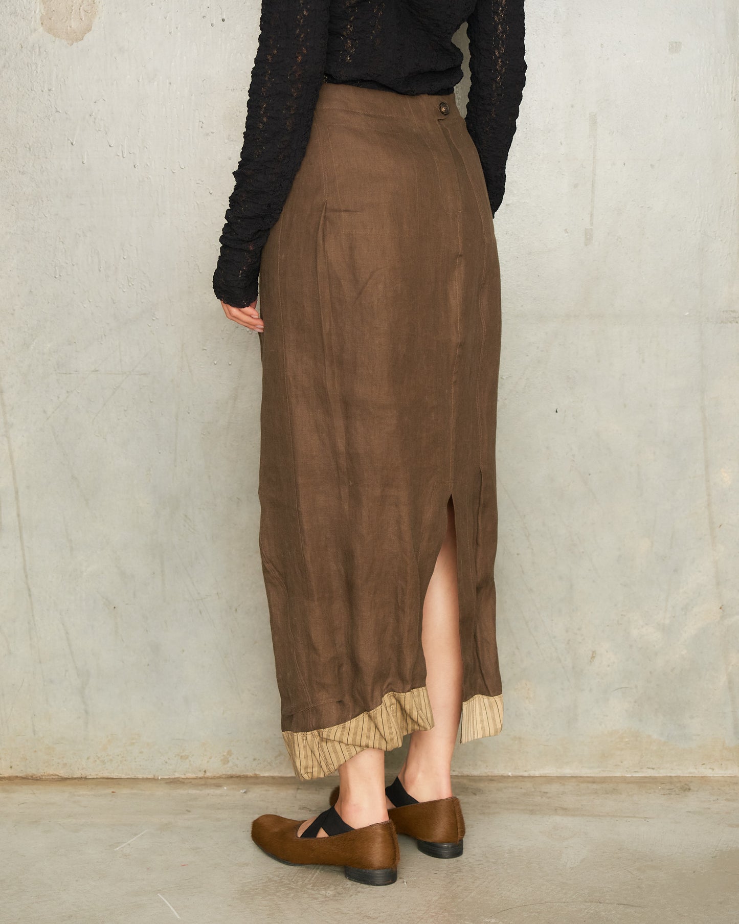 Bias cut long skirt by Ziggy Chen in sienna. Crafted from lightweight and textured acetate, this bias-cut skirt features asymmetric panelling and off-kilter darts that shape an unconventional silhouette. Ziggy Chen’s signature inner lining folds outward, creating a crumpled, uneven hemline that underscores the skirt’s deconstructed elegance.