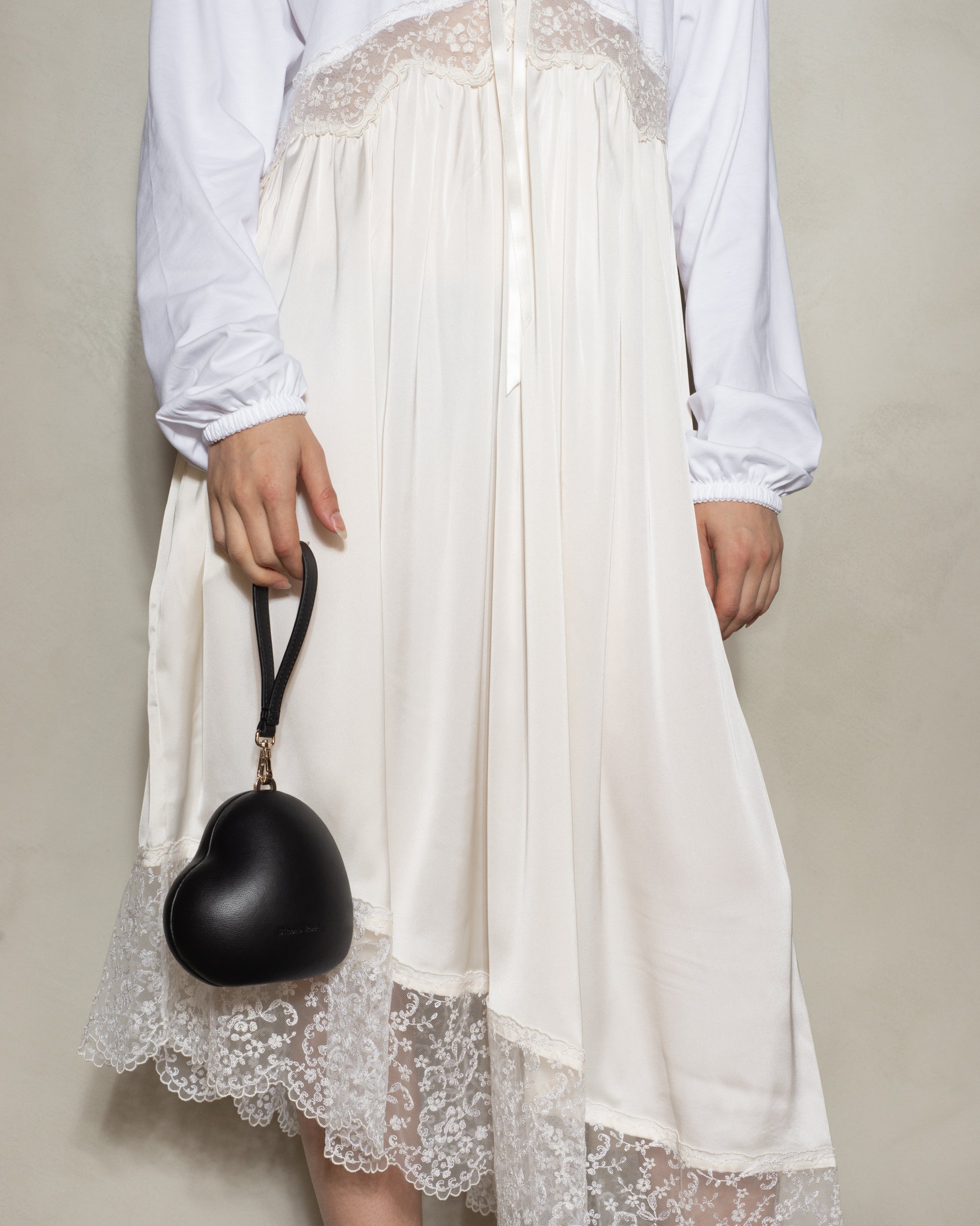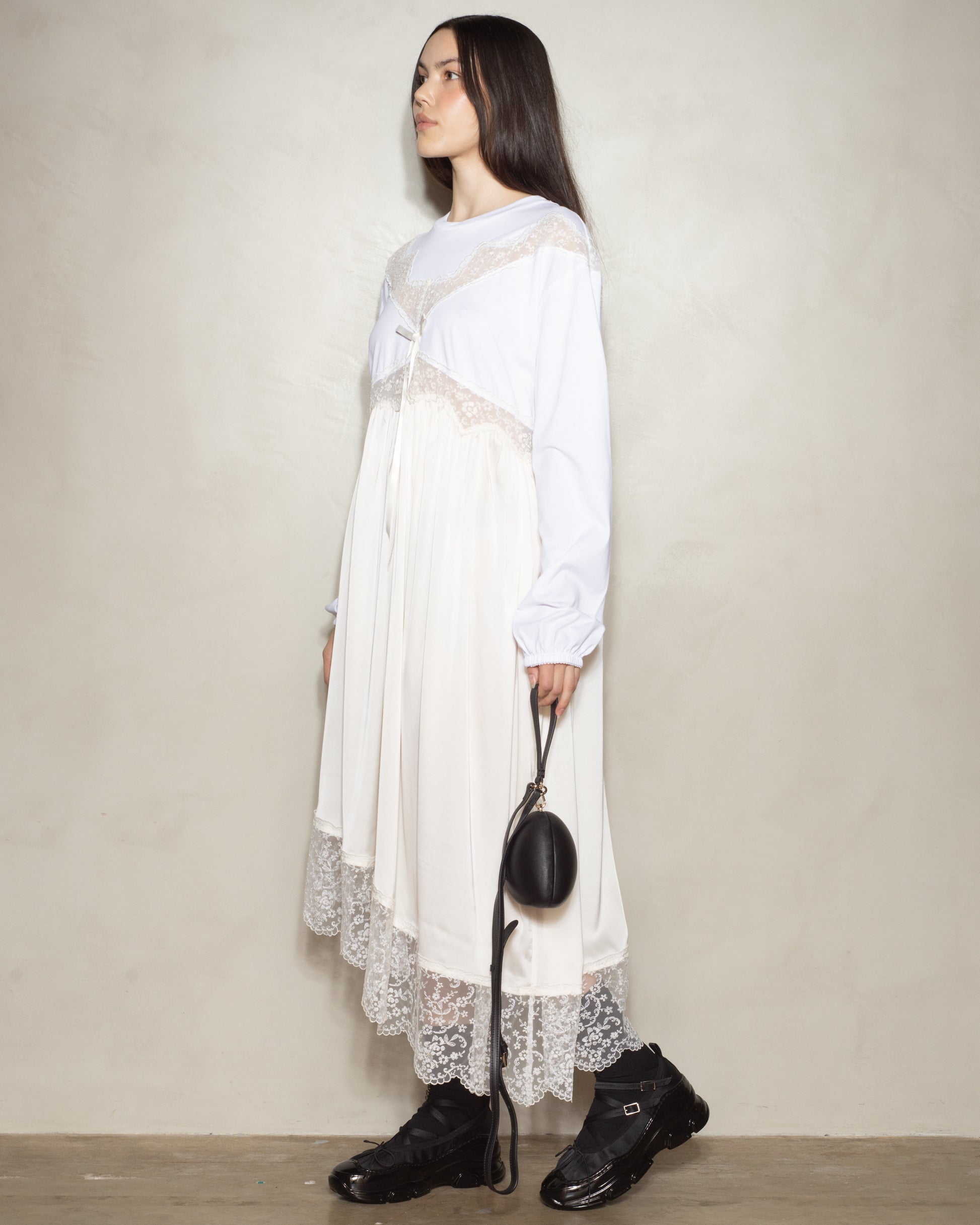 Patchwork long sleeve dress by Simone Rocha. Long sleeve cotton jersey upper finished with elasticated sleeve cuffs. The season's floral inspired lace trim crosses over the bust to add an alluring diaphanous element, meeting with a centre bow ribbon detail. Spectacularly finished with an asymmetrically hemmed and lace-trimmed satin skirt.