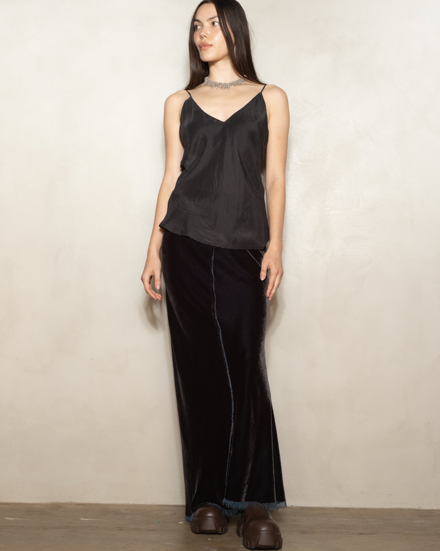 Virginia skirt by Jaga in dark grey velvet. Long draped skirt in a fluid rayon and silk blend. Bias cut panels converge in fringed central seams to drape with an elegant silhouette. Elastic waistband for ease of wear.