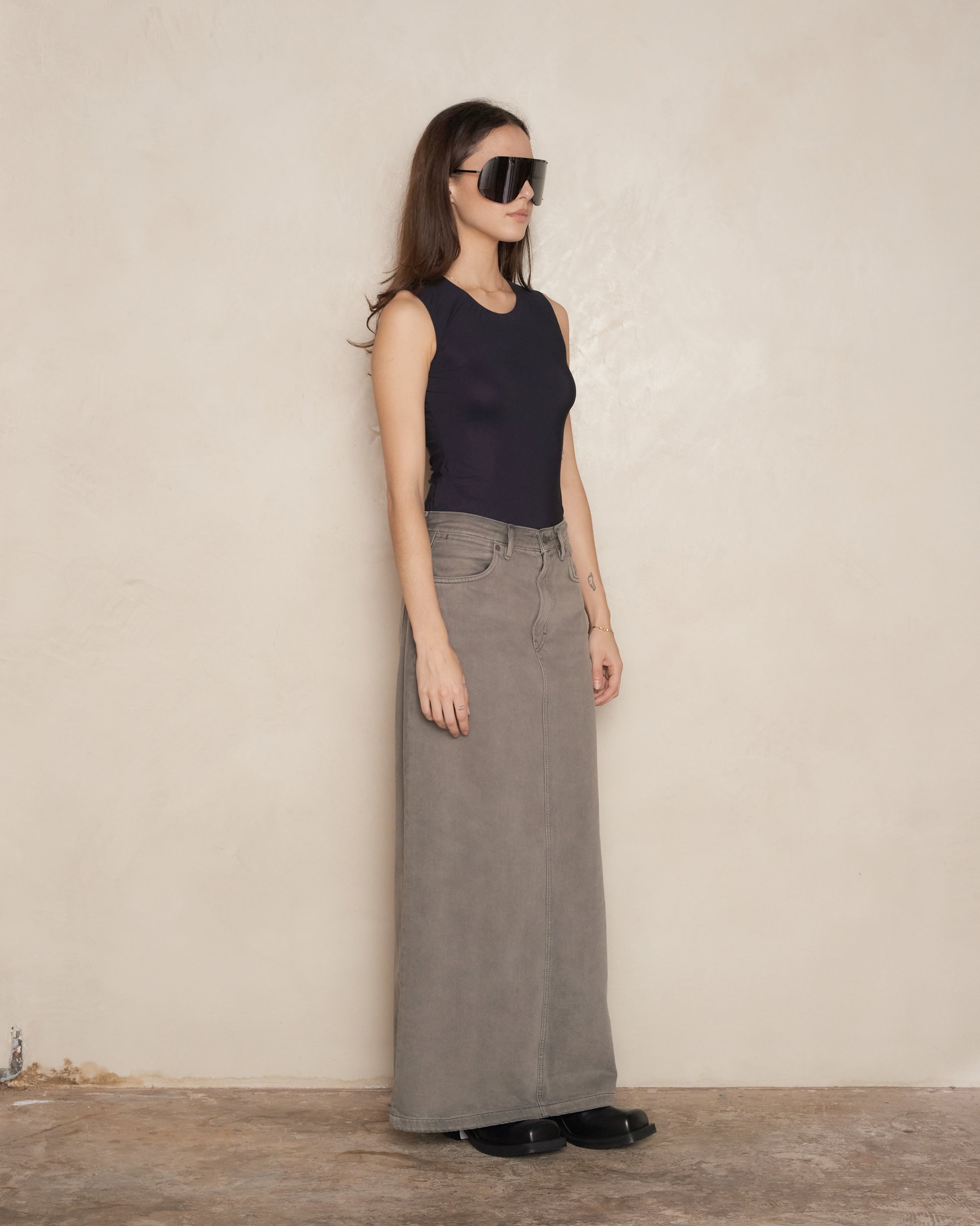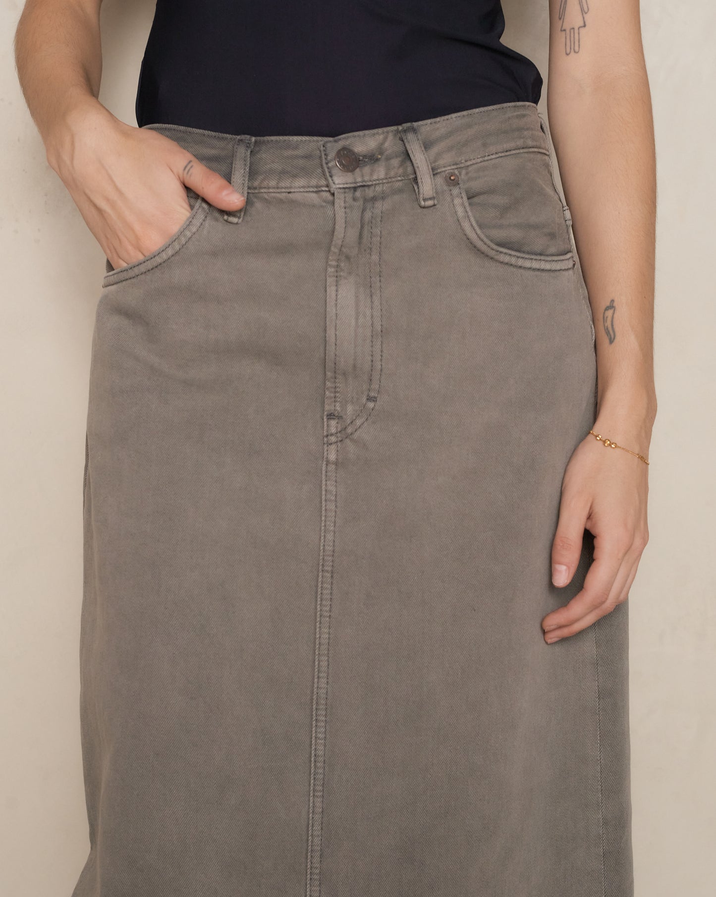 Denim skirt by Acne Studios in anthracite grey. Straight denim skirt crafted from a robust blend of cotton and lyocell, featuring a contemporary distressed grey wash. Classic five pocket styling with a high waist, ankle length and high rear vent.