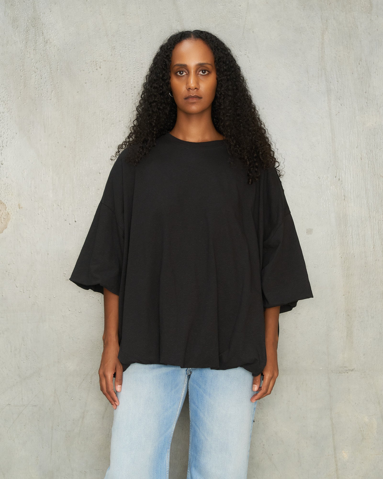 Bubble logo T-shirt by Acne Studios in black. Organic cotton tee with a subtly irregular, vintage-textured jersey. Voluminous gathered sleeves and hem create a soft bubble effect, finished with a large seasonal logo label at the back.