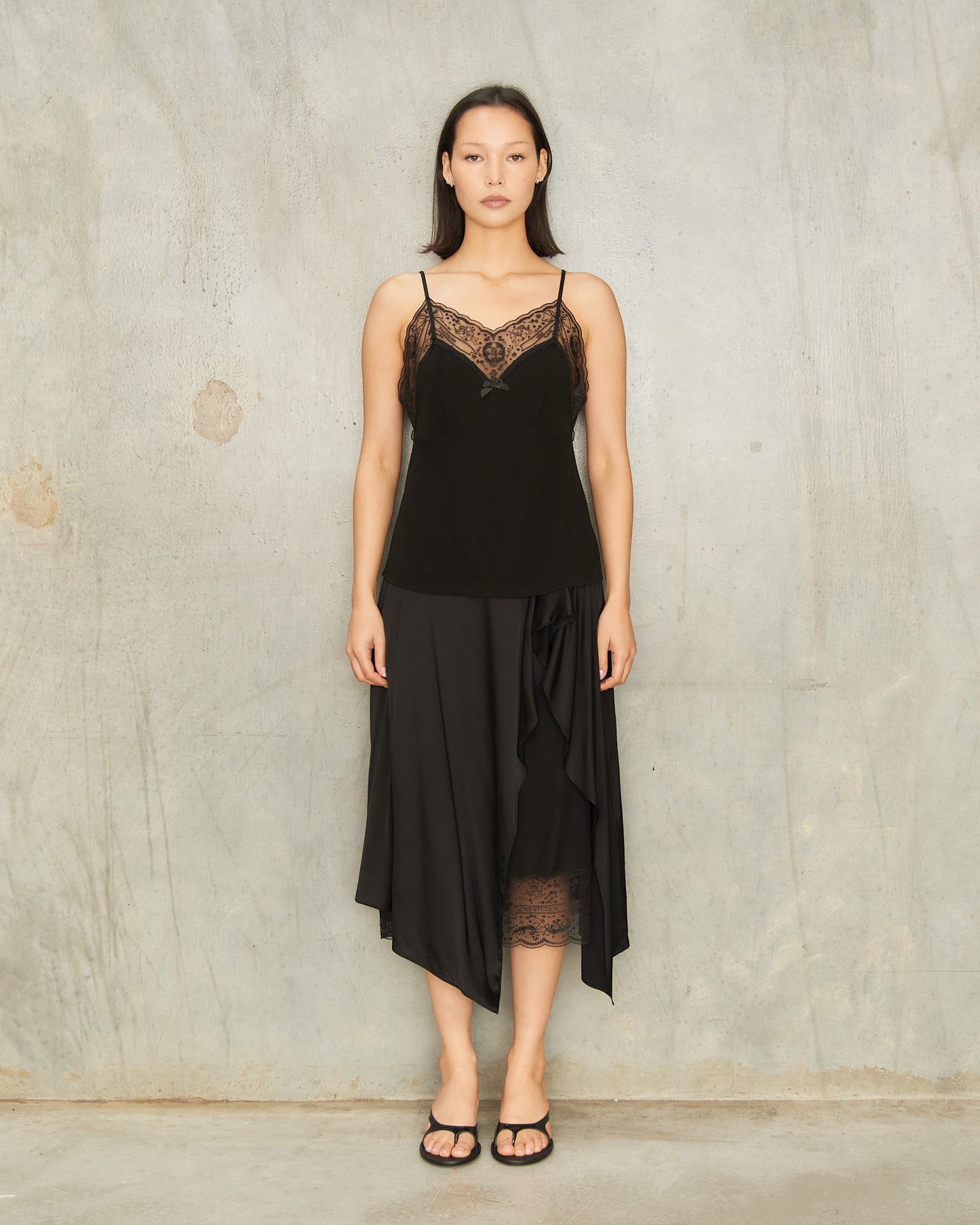 Satin lace draped skirt by Acne Studios in black. Fluid satin skirt, artfully layered with delicate ruffles that reveal a subtle lace layer beneath. Lightweight fabric drapes with effortless grace and fastens elegantly with a discreet hook and eye closure.
