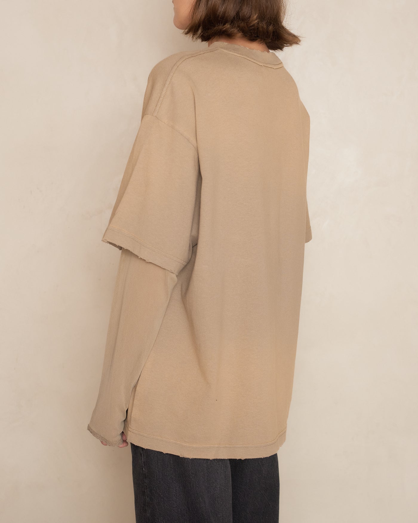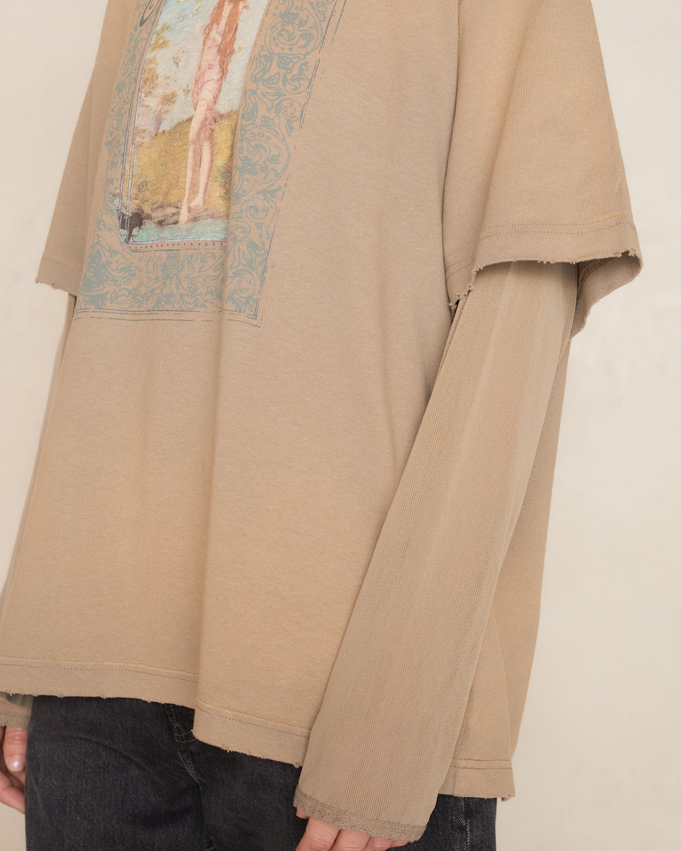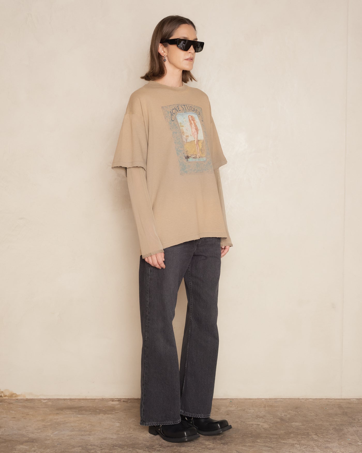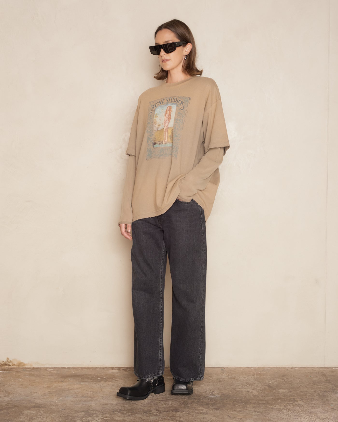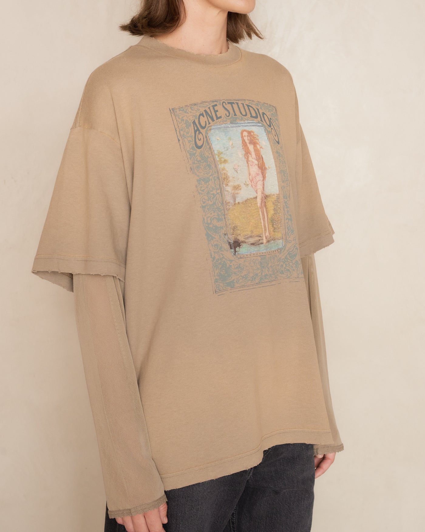 Layered print longsleeve T-shirt by Acne Studios. Relaxed cotton jersey tee in mud brown. Intentional distressing of the short sleeves and hem adds a rugged edge, while tonal mesh sleeve underlayers attach to bring a unique dimension to this casual silhouette. Emblazoned with stylised logo and goddess of love graphic.