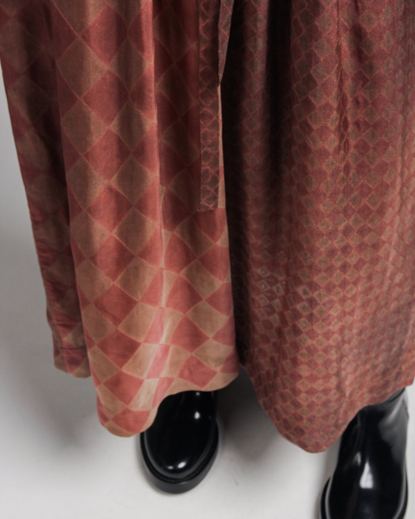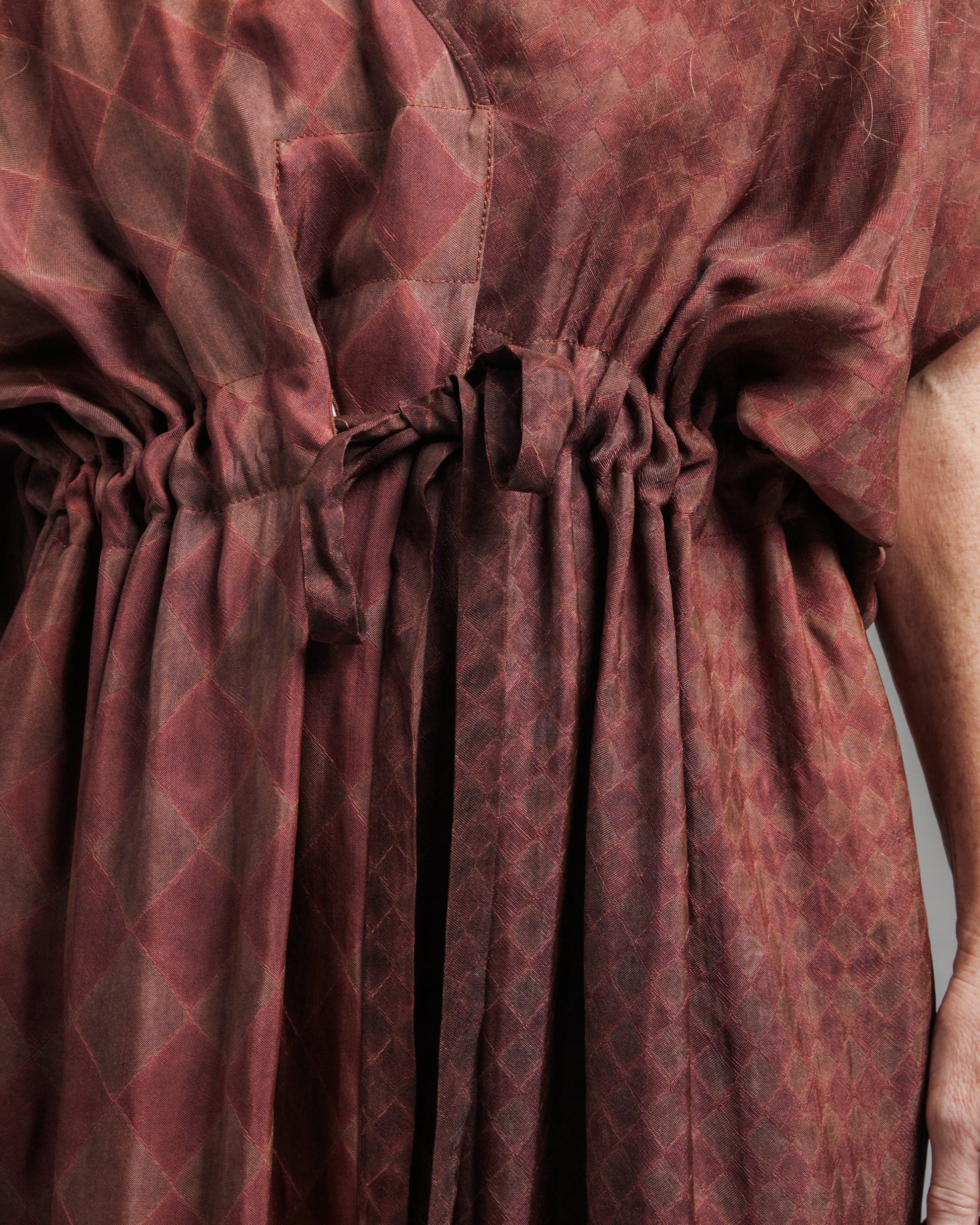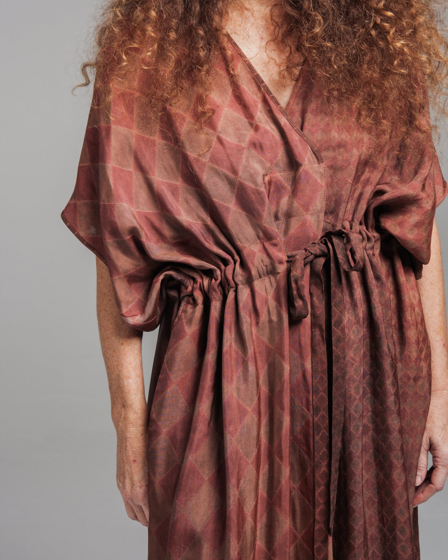 Acre dress by Uma Wang. Mid-length dress in weighted viscose. Mosaic-like argyle check print has a burnished apricot lustre, spread across split panels. Draped sleeves give a relaxed shape, while a tied and gathered waist falls to an elegantly flowing hem.